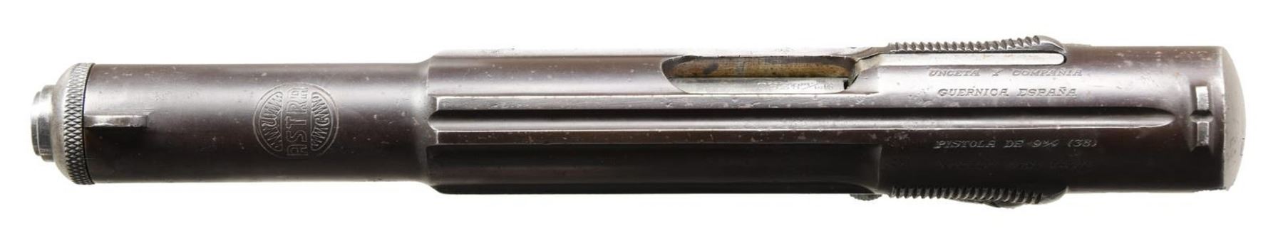 Cal. 9mm Largo. S# 83800. Bbl. 5 3/4". Round blade front sight. Fixed rear sight. Matching numbers on slide & frame. Left side of frame has lanyard ring. Checkered hardwood grips. MAGS: 1-8 rd. w/ screw protruding out at bottom. CONDITION: grips show a few rough areas w/ some staining & scattered handling wear. Metal is mostly a dull gray patina w/ scattered pitting & oxidation. Bore shows scattered oxidation w/ evident rifling but may clean up better. (23-4688/MJC). CURIO. $250-400.