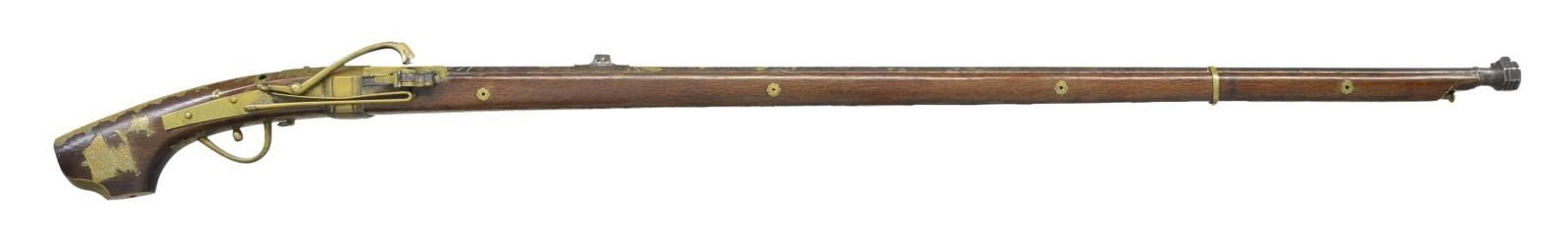 Cal. 48. NSN. The 40" forged iron barrel has octagonal breech section, which transitions to round then to an octagonal flared muzzle and is fitted with traditional Japanese sights. Barrel is attractively engraved with a classic Japanese scene of mountains at breech. A coiled brass inlaid dragon is through central portion, with silver, copper and gold inlaid clouds, etc. toward muzzle. Pan has hinged brass cover. Heavy brass breech area is also engraved. Lock with long main spring has floral serpentine retainer at rear. Full length stock that appears to be evergreen oak is brass mounted with many fancy inlays along top of comb and bottom of forend. A Japanese warrior is inlet on right side of butt and a large chrysanthemum is on left. Other flowers serve as wood protection for lock mounting pins. This treatment extends along barrel channel with pins for barrel mounting. There is a rectangular stamped in cartouche (maker's mark ?) on left side and some later incised Japanese characters in stock under rear sight. CONDITION: good. Barrel showing old oxidation, brass nicely toned, stock shows good overall wear with some losses at muzzle and some cracks on left side near breech. Bore is lightly pitted, lock a bit sticky. Pivot pin for pan cover is missing. PROVENANCE: From the Lifelong Collection of Glen E. Mattox. (01-22460/MGM). ANTIQUE. $1,200-2,000.