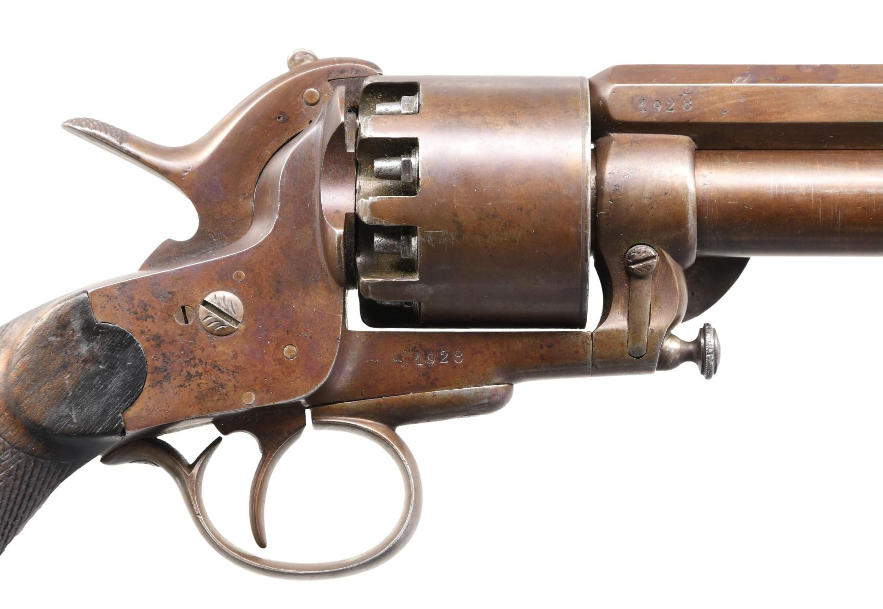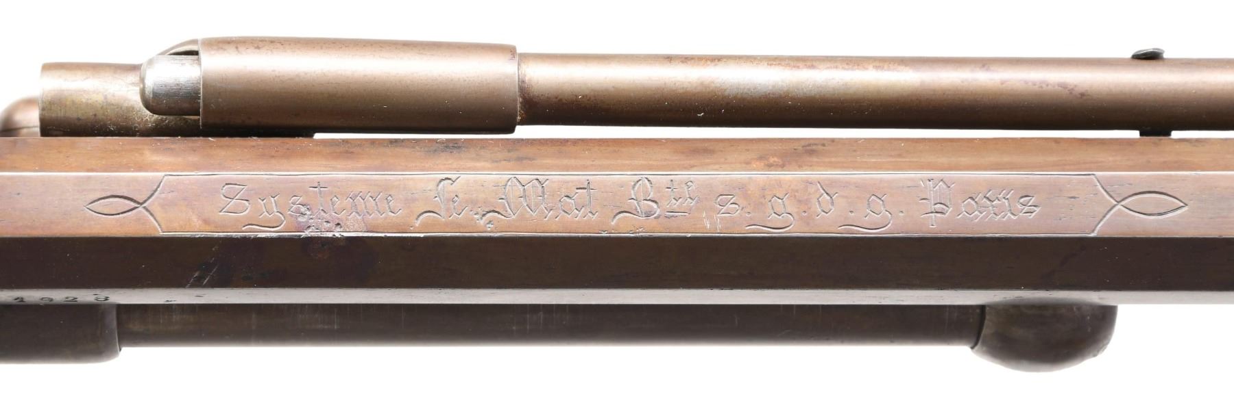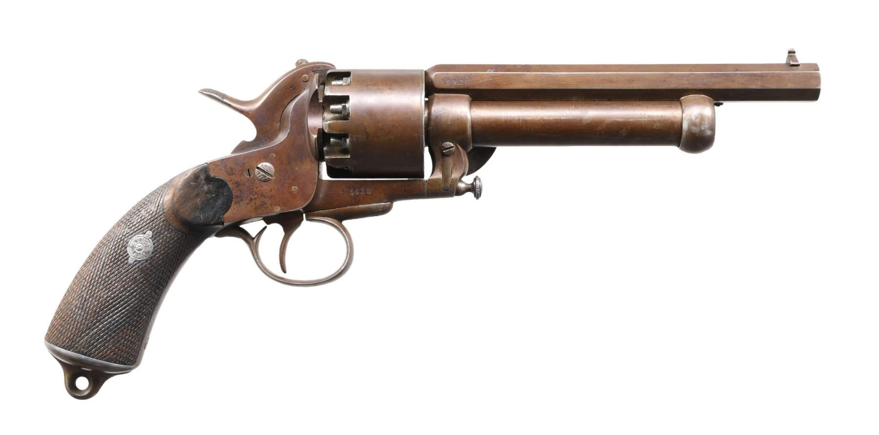Cal. 42/18 ga. S# 1928. Early 1864 made 2nd model LeMat grapeshot revolver. Barrel address: "Systeme LeMat Bte sgdc Paris". Standard configuration, 9-shot cylinder, underlying shotgun barrel, reciprocating pin cylinder rotation system, hinged selector on hammer face for choice of shotgun or cylinder. Checkered wood grips, loading assembly attached to frame on left side. CONDITION: very good overall as loading assembly professionally restored and refinished. All matching S#s. Mechanics are sloppy but does cock & index, crisp rifled & smooth clean shotgun bores. PROVENANCE: From the Collection of a Tennessee Gentleman. (01-25660/JS). ANTIQUE. $8,000-14,000.