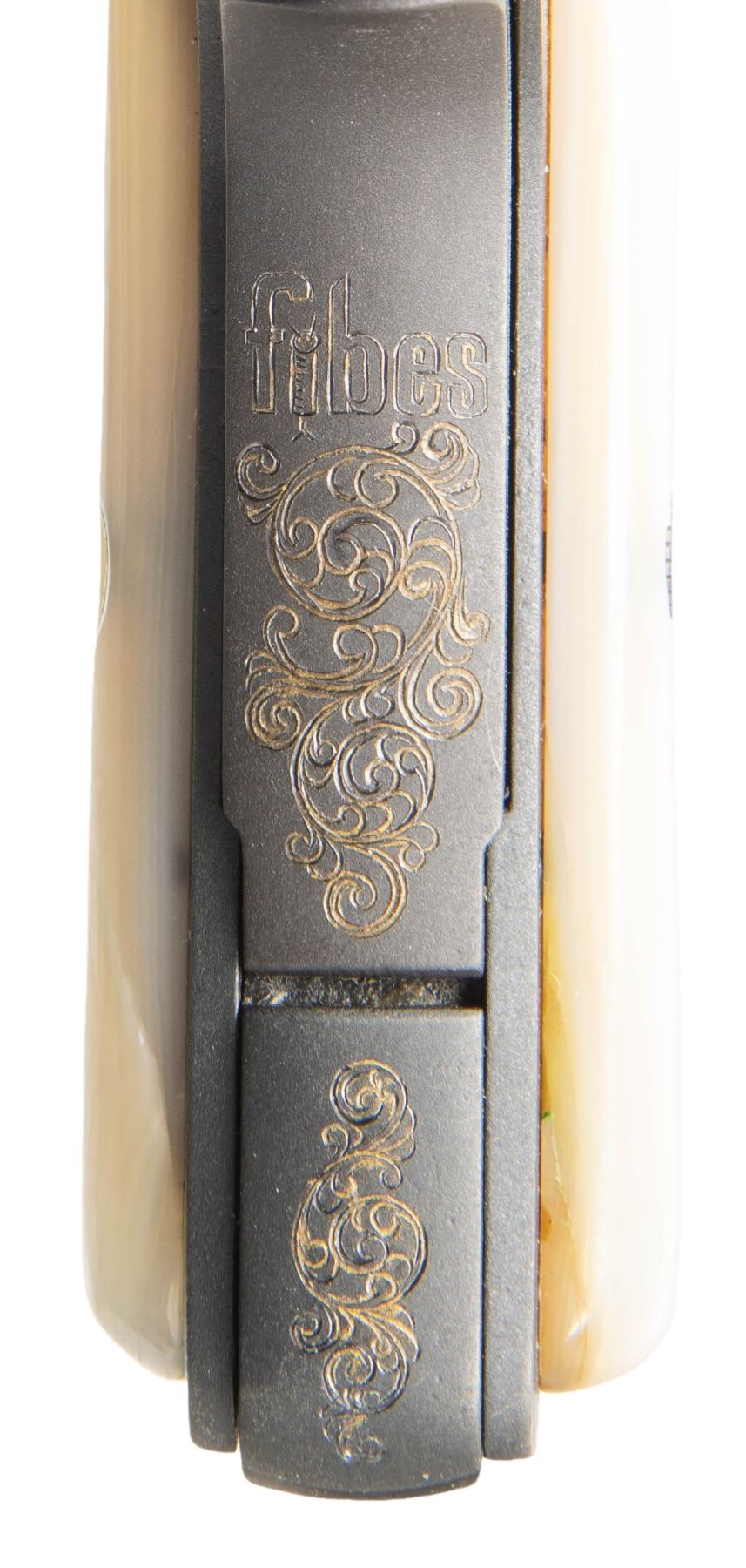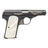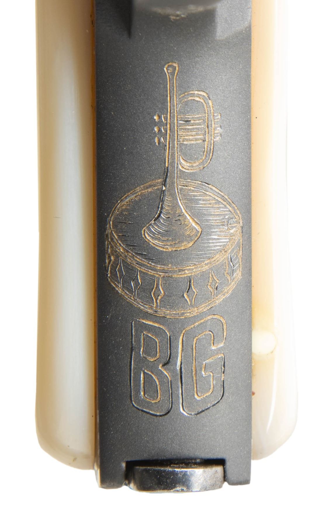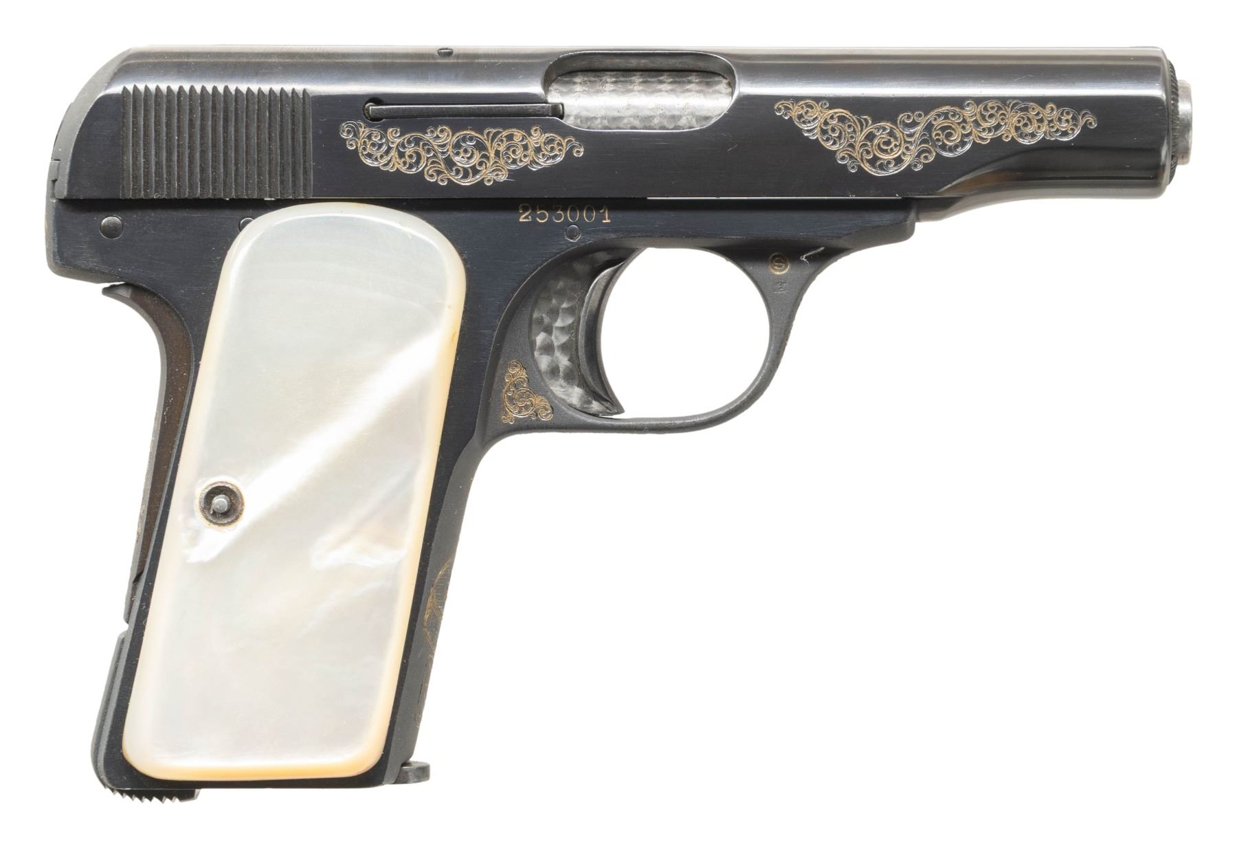 MODEL 1910 SEMI-AUTOMATIC PISTOL. Cal. 7.65mm. S# 253001. Bbl. 3 7/16". Model 1910 semi-automatic pistol mfg. in Belgium by Fabrique Nationale. Left side of the slide is simply marked "BROWNING'S PATENT DEPOSE". Left side of the forward trigger guard web is marked with an encircled "FN", with a pair of Belgian proofs marked on the right. Right side of the chamber is marked with a triad of Belgian commercial proofs. Sides of the slide feature tasteful professionally executed aftermarket scrollwork that is filled with an "old gold" coloration, which extends to the sides of the rear trigger guard web, front and underside of the trigger guard bow, rear of the frame, and rear of the heel mag. release. Front grip strap is engraved with a trumpet standing atop a drum over "BG", with a Fibes Drum Company logo engraved above a section of scrollwork on the rear of the grip safety. Slide and sides of frame exhibit a polished blue finish, with the underside and rear of the frame exhibiting a matte blue finish. Bbl. is polished in-the-white, with the chamber area and sides of the trigger being jeweled. Frame is mounted with 2-piece plain pearl grips. Grip screw is slightly too long and protrudes from the right panel. Slide features a concave matte rib, with an integral blade front sight and square notch rear sight. Slide matches the frame via the full S# on the interior. MAGS: x1 blued steel 7-rd. mag., featuring matching pattern scroll engraving on the bottom of the floorplate. CONDITION: metal components retain the vast majority of their reapplied blue finish, exhibiting some light edge wear and some light superficial handling marks overall. Bore is bright, exhibiting consistent light to mild pitting, while retaining strong rifling throughout. Proper manual mechanics. Grips show a few light superficial handling marks, but otherwise remain very good overall. A very attractive custom music theme engraved FN Model 1910 semi-automatic pistol. (25-5379/MLW). CURIO. $600-900.
