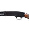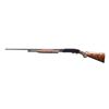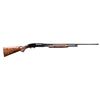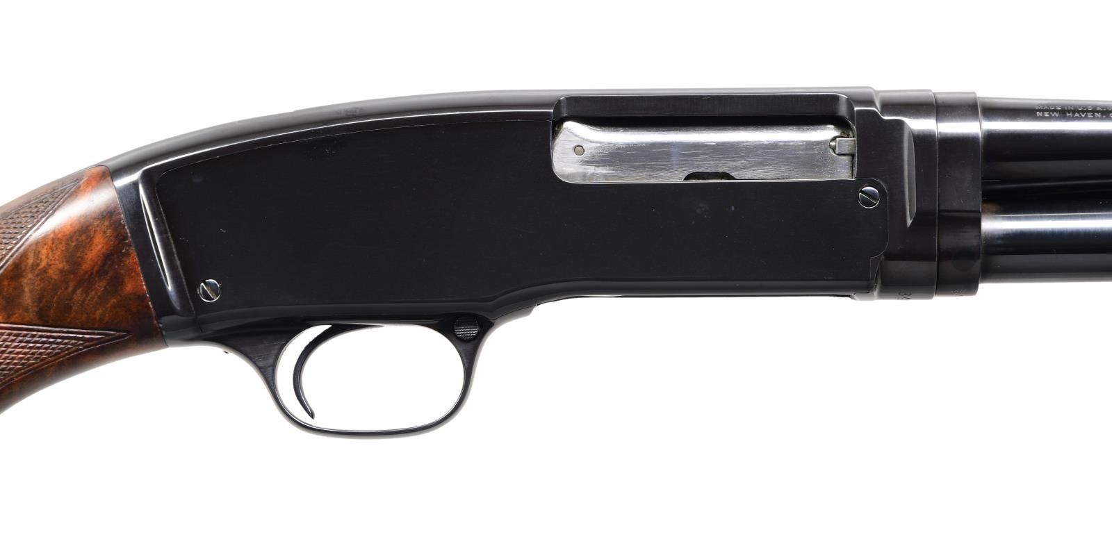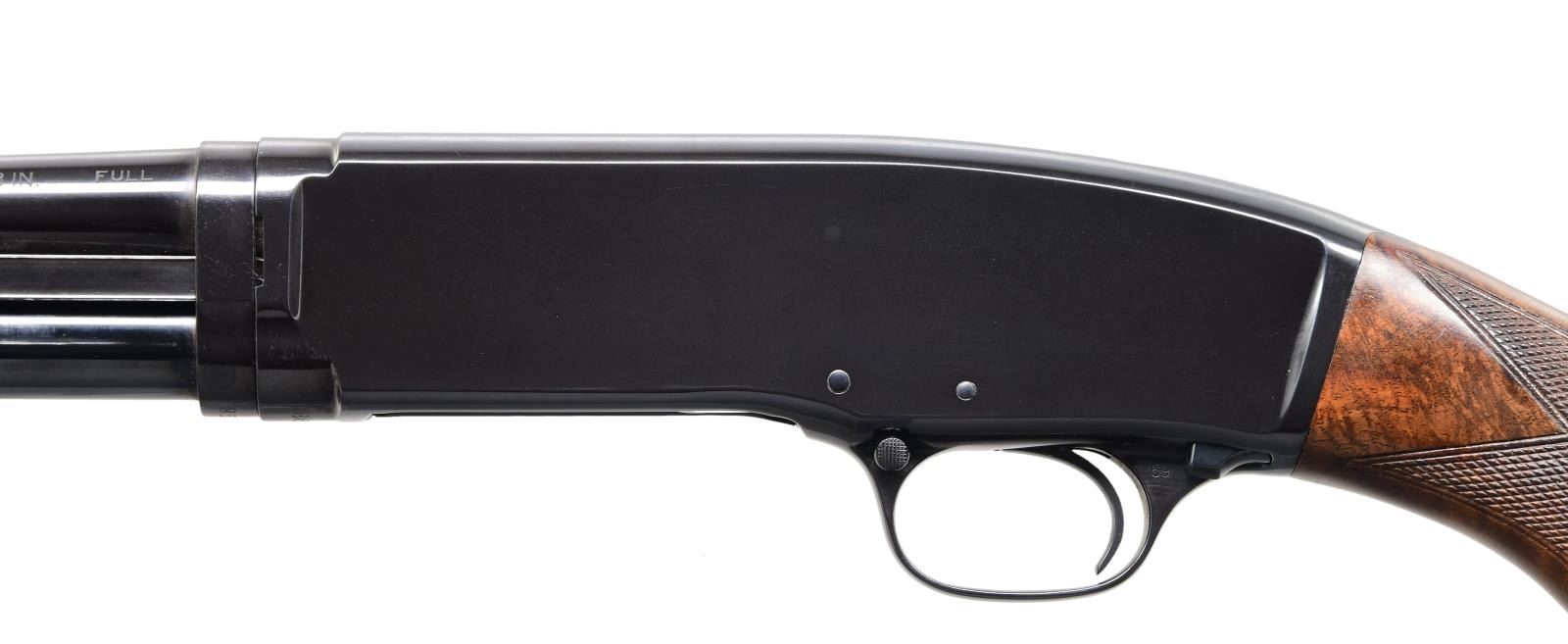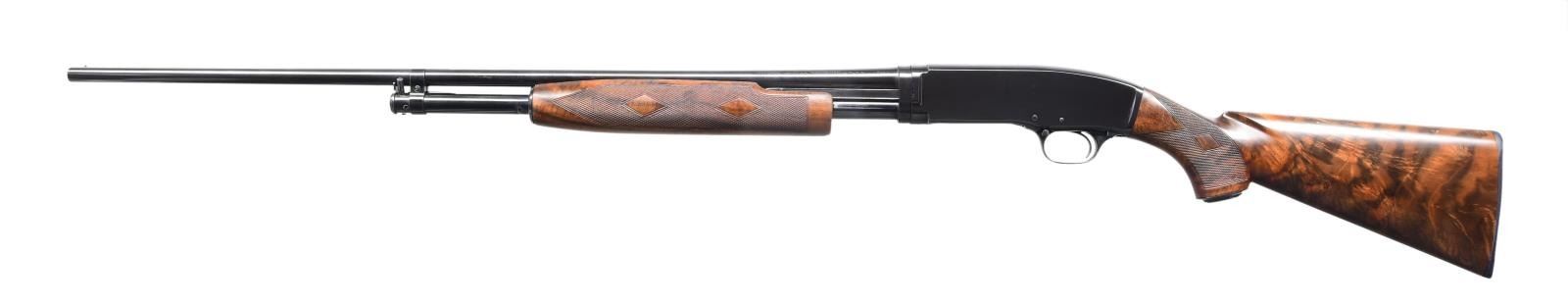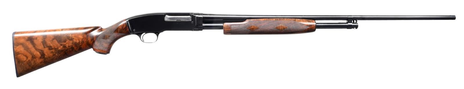 SHOTGUN. Cal. 410, 3". S# 34098. Bbl. 28". Model 42 pump action shotgun mfg. by Winchester in 1938. Sides of bbl. exhibit standard markings, with the right also exhibiting a "FULL" choke marking. Metal components exhibit a professionally reapplied high polished blue finish overall, save for the bolt, which is polished in-the-white. Finely figured custom checkered aftermarket pistol grip buttstock features a blued steel pommel cap and contemporary Winchester black plastic buttplate, with a en suite checkered pump. Aluminum bead front sight. CONDITION: extremely fine, with metal components retaining nearly all of their reapplied blue finish, exhibiting some light wear on the mag. tube from cycling of the action. Mirror bore. Wood furniture shows a few scattered marks from handling and storage, but otherwise remains very good to excellent overall. (24-2041/MLW). CURIO. $1,200-1,800.