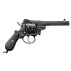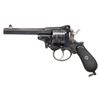 ACTION TOP BREAK REVOLVER. Cal. 9mm Rimfire. S# 3458. Bbl. 5". NJ. Dessard patent double action revolver. Left side of the bbl. is marked with a Crown/N proof (also present on side of cyl.) above "3458", followed by "NJ. DESSARD/ BREVETE" above "ACIER FONDU" (French: "CAST STEEL"). Front face of cyl. is stamped with a Crown/S proof, with a Belgian "E/ LG/ *" Liege proof marked on the side. Left side of frame is marked "LB" beneath the grip panel, with "+ B7" marked on the right. Sides of frame and top strap of the bbl. exhibit finely executed scrollwork breaking off in small sections along a double line border, which extends around the circumference of the rebated cyl. Grip straps and trigger guard bow feature interwoven line type engraving, with small sections of scrollwork. Frame, cyl., and bbl. exhibit a high polish blue finish, save for on the hammer, trigger, and several small parts, which are in-the-white. Frame features a distinct contour usually found on pinfire revolvers of the era, and is mounted with 2-piece checkered black hard rubber grips, featuring a lanyard swivel and loop on the butt. Interior of grips are hand etched with an arrow and "/", with the left panel also exhibiting a lightly etched "WK". Top strap of bbl. features a pointed rib. Dovetailed blade front sight with deeply grooved U-notch rear sight on rear of the top break bbl. CONDITION: metal components retain large amounts of their original high polish blue finish, showing light to mild edge wear, with areas of wear (predominately on the grip straps, trigger guard, as well as on the right side of the frame and bbl.) that are fading to pleasing gray and brown patinas. In-the-white parts show some scattered spots of age related discoloration. Bore is bright, exhibiting scattered spots of moderate pitting, while retaining good rifling throughout. Proper manual mechanics in SA and DA modes. Grips show light to mild smoothing, as well as some superficial marks from handling and storage, but otherwise remain sound. A very attractive example of a Dessard patent revolver. (01-28563/MLW). ANTIQUE. $1,200-1,800.