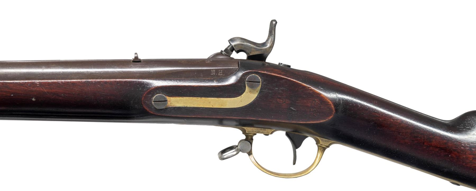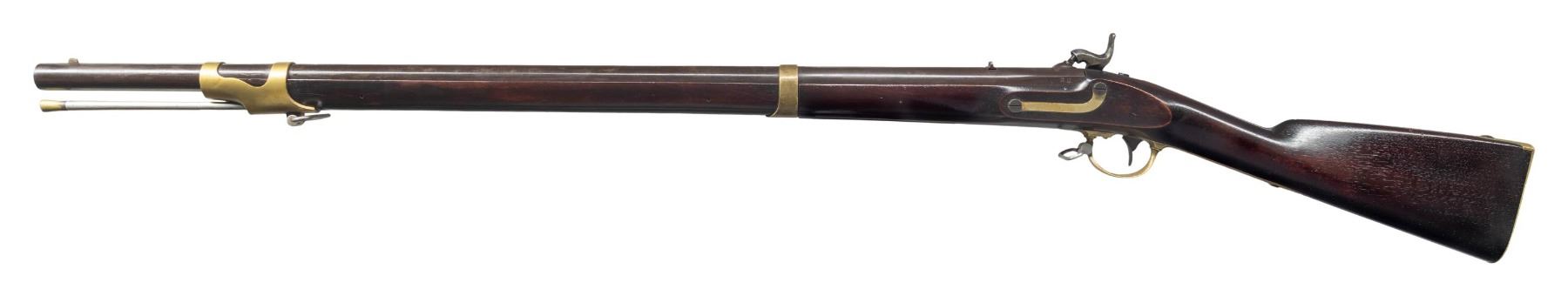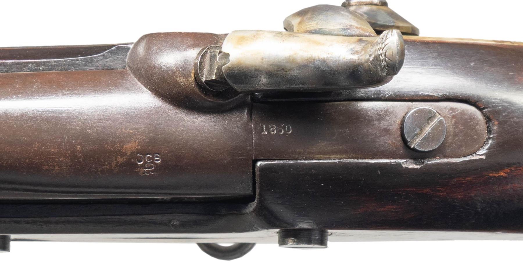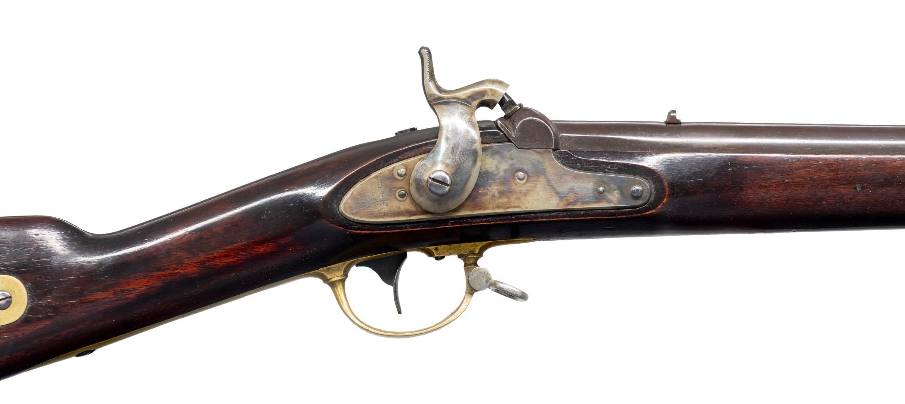 & LAWRENCE MODEL 1841 MISSISSIPPI RIFLE. Cal. 54. NSN. Standard configuration with 33" round barrel dated 1850 and breech proofed "JCB / P" & "N.H." stamped brass furniture, lock marked "ROBBINS / & / LAWRENCE / U.S." and vertically "WINDSOR VT 1850" at tail. "WAT" & "JH" cartouches, "U.S" surcharge on butt plate. CONDITION: fine overall, complete and original, barrel retains most of its original brown finish & lock retains most of its original case colors, brass has mottled patina. Stock has been broken above lock and wood repaired and dyed to mask repairs, stock refinished and varnished. Mechanically fine with good rifled bore. PROVENANCE: Estate Collection of John "Jack" Dhooghe. (01-28275/JS). ANTIQUE. $1,500-2,500.