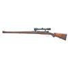 WITH POP UP CHEEKPIECE AND SCOPE BY LUDWIG SCHIWY, HERMANN GOERING'S FAVORITE GUNMAKER. Cal. 8X60 Mag. S# 5934. Bbl. 26 1/3" oct., 2/3 rnd. w/ integral matted rib. Milled out portion of rib is engraved "L. Schiwy, Berlin. S. W. G 8". Bbl. is sighted w/ 1 standing, 1 folding leaf rear & gold front bead. A saddle holding claw base has been added at rear. Left side flat of bbl. is marked w/ caliber & Boehler steel info, partially obscured by saddle. Model 98 Mauser action has some scroll engraving on receiver ring, either side of matted top & along side wall. Bridge has rear claw scope base. Bolt handle has been altered to butter knife type, checkered on top & bottom. Bottom metal w/ push button floorplate release & added dbl. set triggers is also nicely scroll engraved. Shotgun type steel trigger guard is engraved to match. Nicely marbled & lightly figured European walnut horn capped pistol grip stock extends to muzzle w/ horn cap & this long forend has been maker cut for stability & easy stock removal w/ 2 horn plates fitted at intersection. Stock has also been fitted w/ spring loaded pop up cheekpiece w/ wood very nicely matched to grain & marbling of butt. Stock measures 13 7/8" over horn basket weave buttplate & also features Greener type side safety & closely spaced point pattern checkering at grip & forend. Scope mounts appear to be later additions & hold a Kahles Helia - Super 6X scope w/ duplex reticle in soldered on claw rings. Scope has adjustments for windage & elevation, & is fitted w/ plastic lens covers. CONDITION: very fine, as partially & lightly refinished. Metal parts retain nearly all of what appears to be their original blue, perhaps touched up at time of addition of scope bases. Wood has light oil refinish. A very fine quality, checkering cleaned. Scope is near excellent, optically clear. Bore is bright w/ strong rifling throughout. The 8x60 Magnum is easily made by forming 30-06 brass & loading 8mm bullets. (19-5480/MGM13). CURIO. $1,500-2,000.