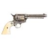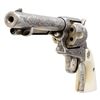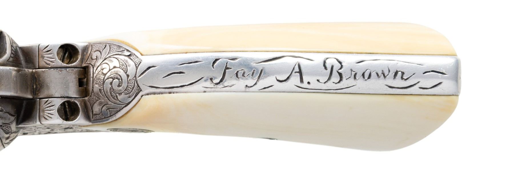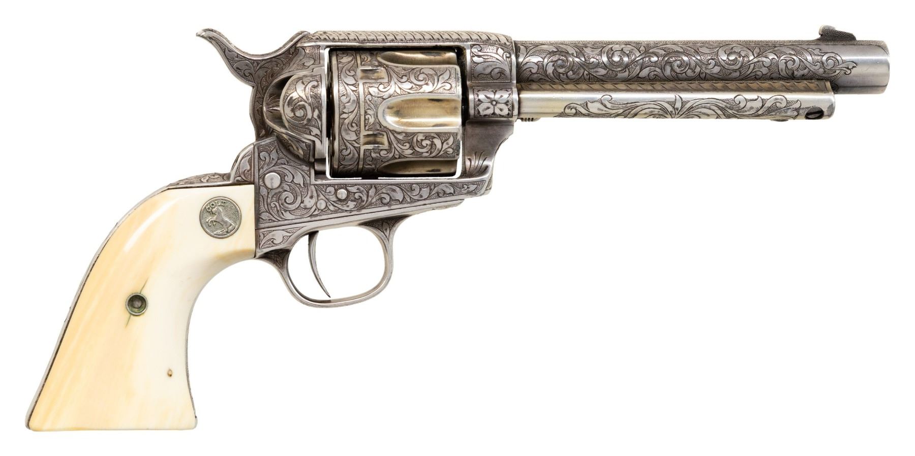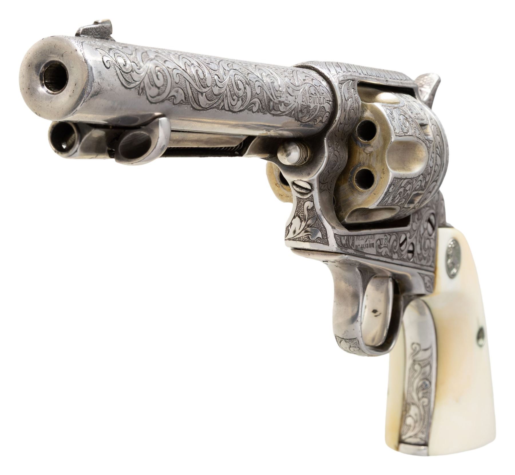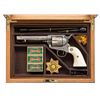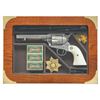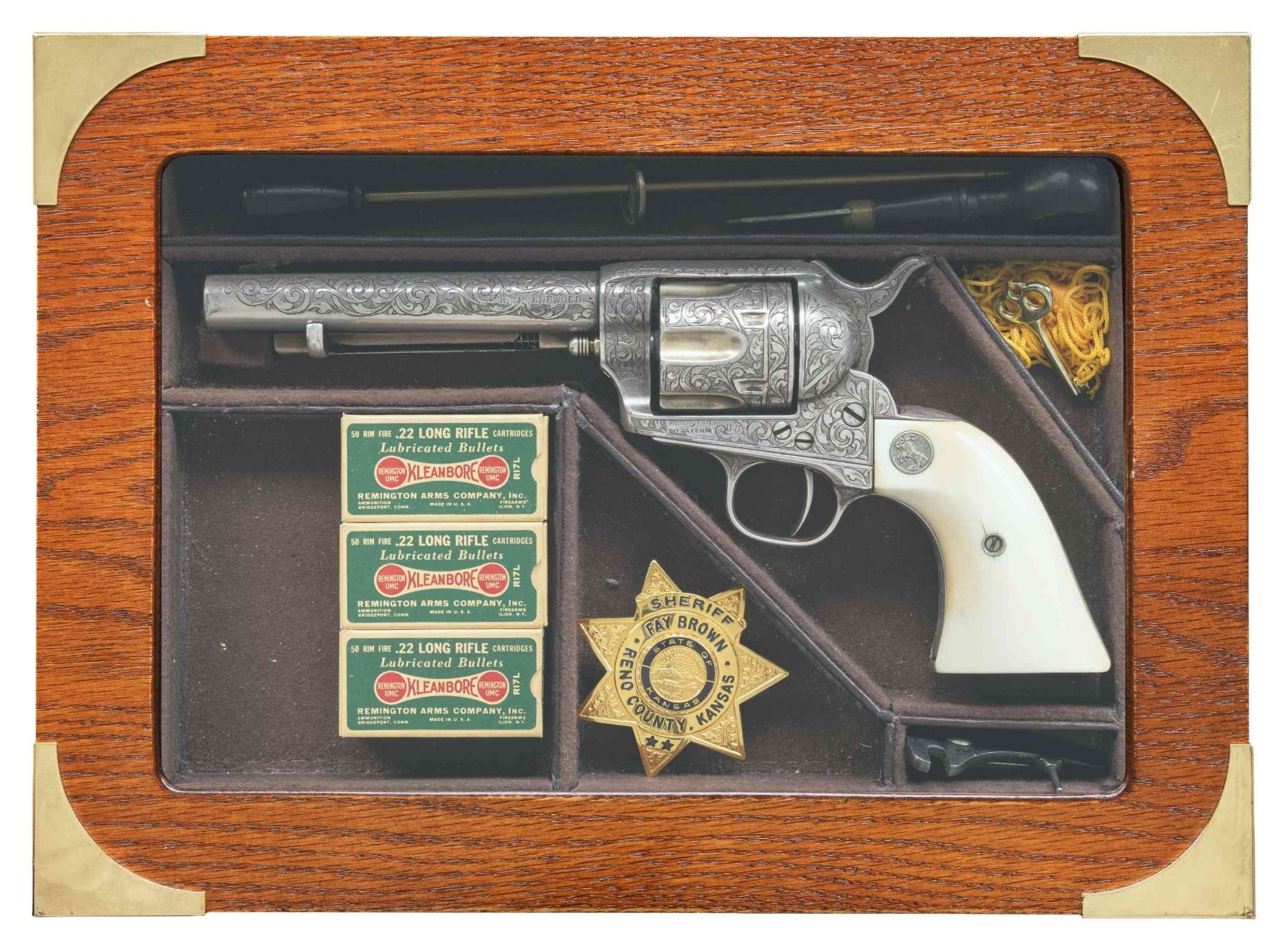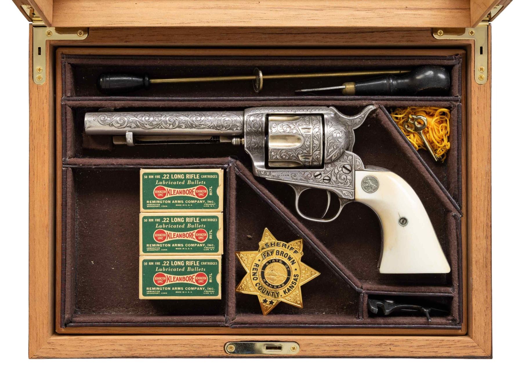R.F. ENEWOLD 22 LR CONVERSION COLT SAA REVOLVER INSCRIBED TO FAY A. BROWN. Cal. 22 LR. S#10344. Bbl. 5 /2" with altered front sight. This handsome revolver started out as a U.S. Cavalry revolver and later converted to Artillery configuration as remnants of non matching S# appear on trigger guard frame. Much later, revolver converted by Reno, NV gunsmith & collector R.F. Enewold.to 22 LR. Left side of frame bears U.S. marking with "K" inspection on bottom of trigger guard frame. Revolver features full coverage intertwining foliate scroll engraving over fine punch dot background. Top of bbl is finely stippled. "V" on left side recoil shield formerly attributed to Wilbur Glahn. Left side of bbl. marked "R.F. ENEWOLD. Original bbl. & cyl. sleeved to 22 LR. Backstrap engraved "Fay A. Brown". Fay A. Brown was enlisted in the Kansas National Guard "E" Company, 2nd Kansas Infantry from 1912-1916 and later Sheriff for Reno County Kansas from 1927-1931. Entire revolver is silver plated. Ejector rod & hammer have been modified & for 22 LR. 2 Piece smooth white grips with Rampant Colt medallions. UNATTACHED ACCESSORIES: hinged glass top compartmentalized oak presentation case containing 3 full boxes of collectible Remington Kleanbore ammo, cleaning rod, screwdriver, multitool & key. Contemporary State of Kansas Sheriff's Badge marked "SHERIFF / FAY BROWN / RENO COUNTY, KANSAS". CONDITION: very good overall retaining 95% silver finish with high edge & muzzle wear plus scattered small spots of light oxidation. silver beginning to tarnish with age. Grips are near excellent and well fit. Bright bore with crisp rifling. PROVENANCE: From the Buckstix Collection. (01-28584/BH). $5,000-8,000