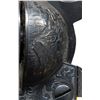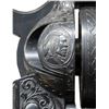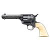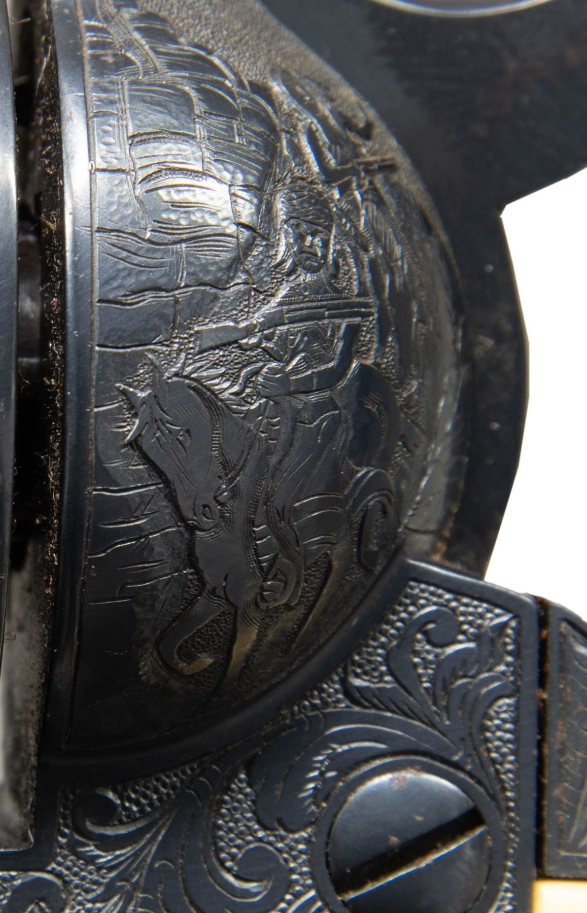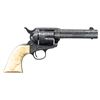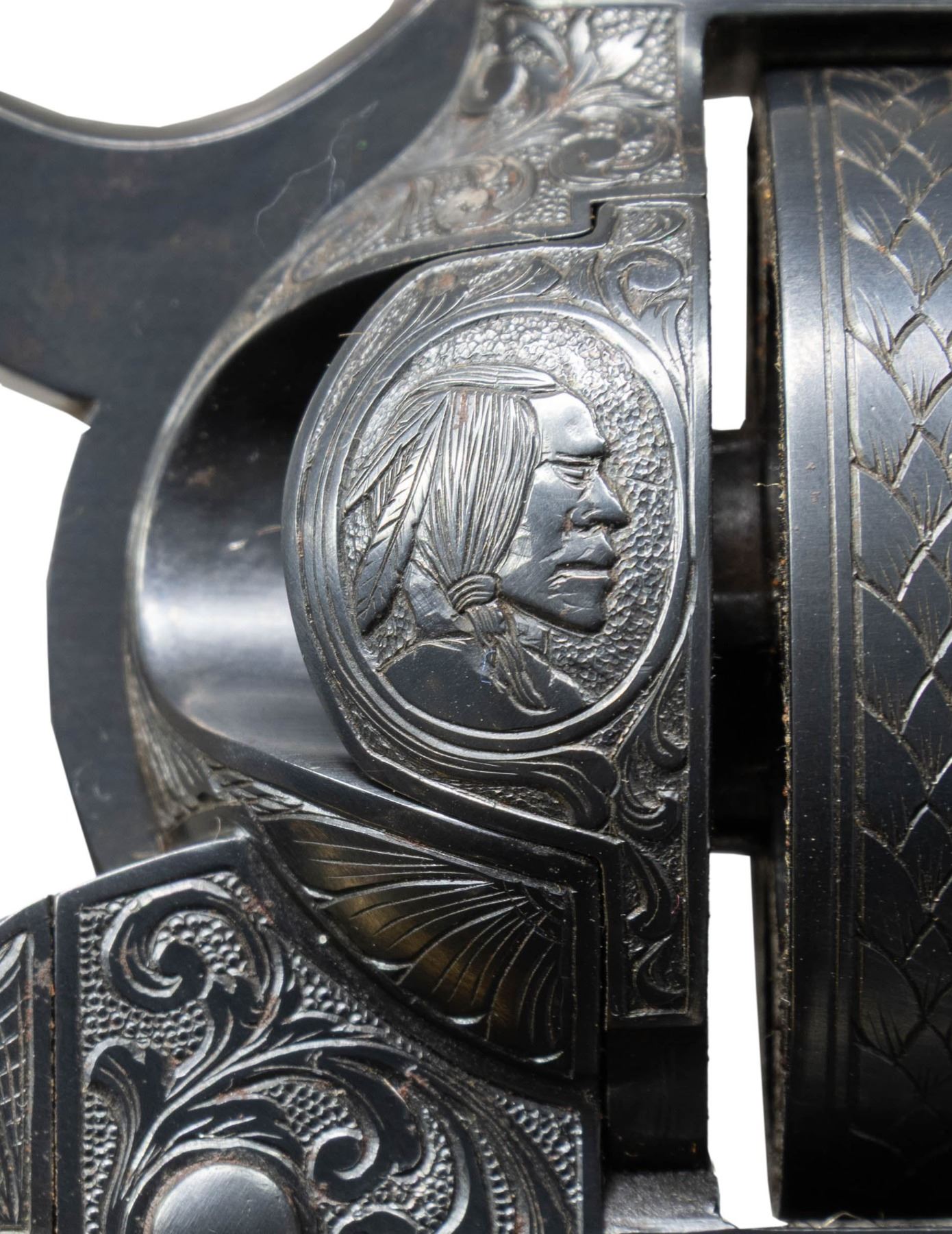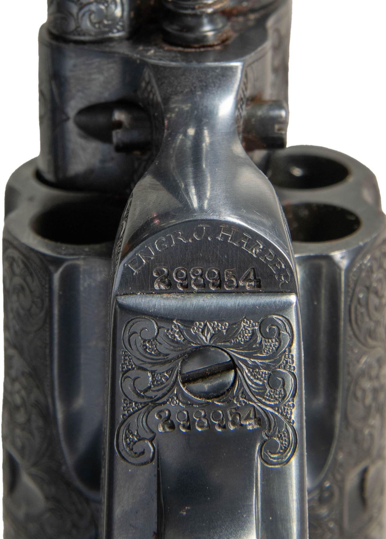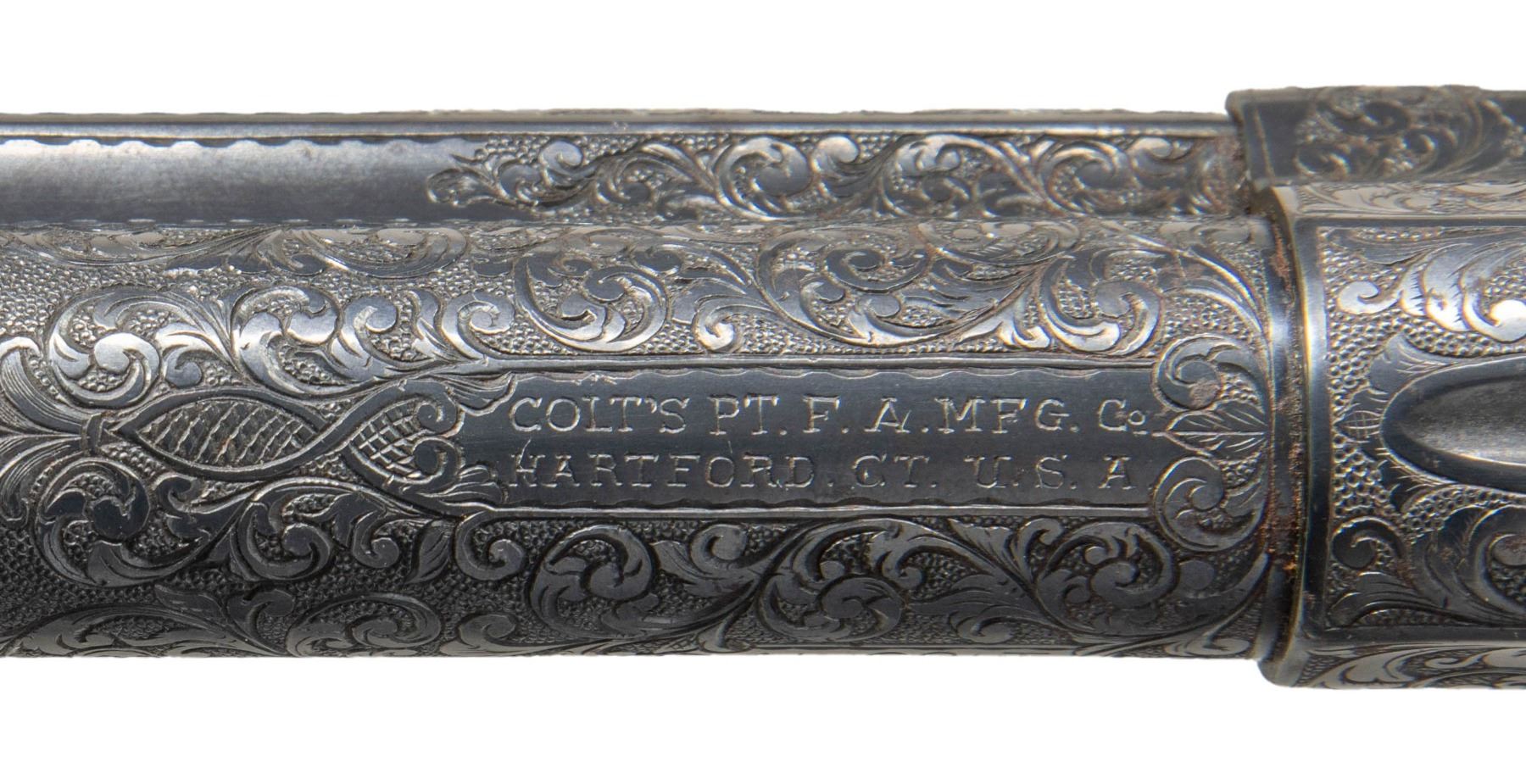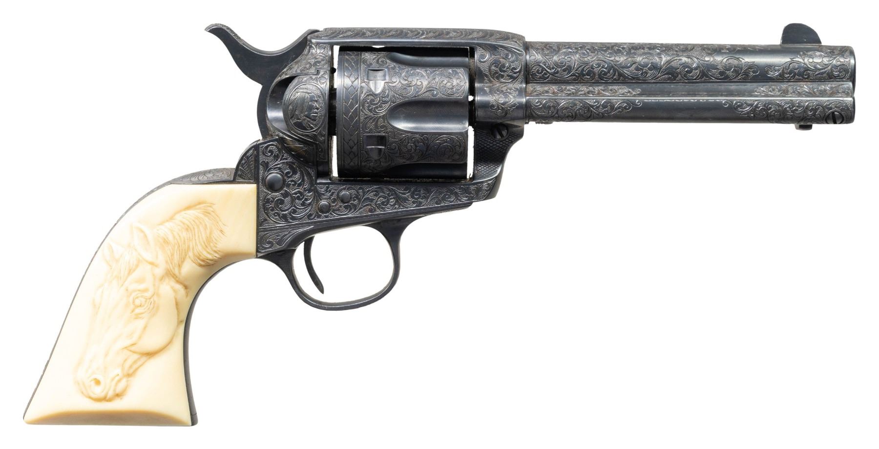 COLT SINGLE ACTION ARMY REVOLVER. Cal. 41 Colt. S# 298954. Bbl. 4 3/4". Single Action Army revolver mfg. by Colt in 1907. Left side of the bbl. is marked "41 COLT." within a banner, with Colt's 2-line address marked across the top. Left side of the frame is marked with Colt's 2-line patent information, followed by an encircled Rampant Colt logo. Frame features near full coverage bordered scrollwork on punch dot backgrounds, with crosshatched sections present on either side forward of the cyl. Recoil shield is engraved with a scene of a frontiersman on horse back and a standing Native American, with an oval shaped side portrait of a Native American engraved on the loading gate. Bbl. features matching pattern engraving, which terminates in a pineapple finial along the top behind the front sight. Complimentary scrollwork extends to the ejector rod housing, cyl. trigger guard, and back strap, with the backstrap featuring a foliate motif at the upper section and the cyl. exhibiting a foliate band at the rear. Underside of frame is engraved "ENGR.J.HARPER" above the S#. Metal components exhibit a nicely reapplied blue finish overall. Frame is mounted with a 1-piece natural white grip, featuring a relief carved buffalo head on the left side, and a horse head on the right. Standard SAA pattern blade front sight and frame notched rear sight. Matching numbers are present on the frame, trigger guard, and rear grip strap. Cyl. is unnumbered. CONDITION: metal components retain the vast majority of their reapplied blue finish, showing some scattered spots of light surface oxidation. Cyl. base pin shows mild wear on forward edges. Bore is relatively bright, exhibiting consistent mild to moderate spots/patches of pitting, while retaining strong rifling throughout. Proper manual mechanics. Grip has acquired a pleasing mellow patina, showing light superficial handling marks. (25-1211/MLW). CURIO. $2,000-3,000.