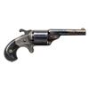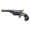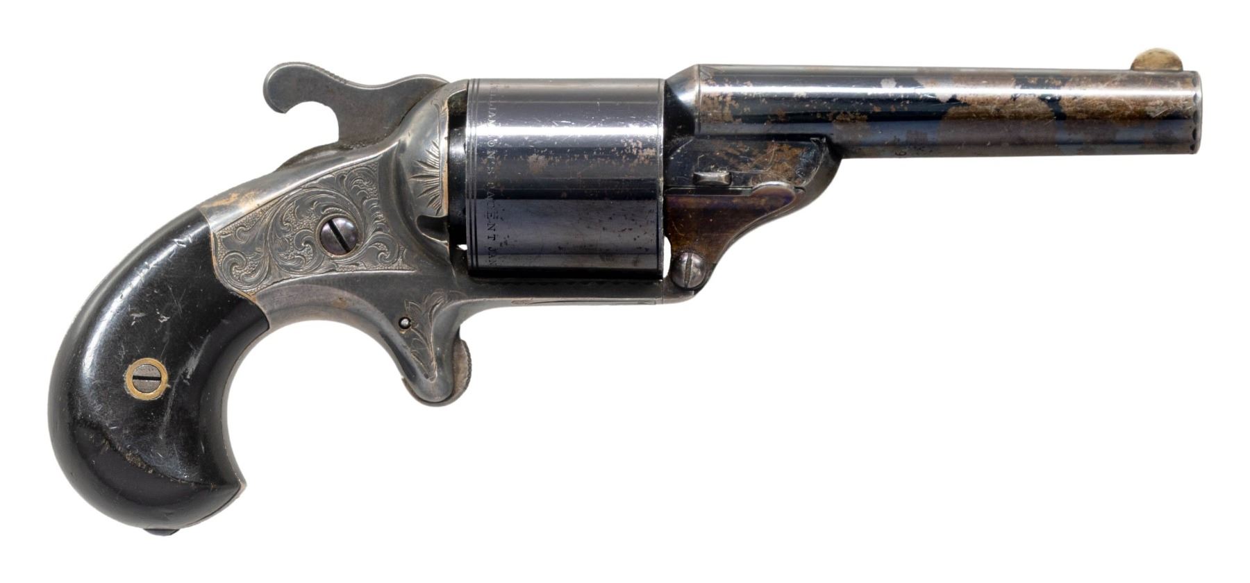 SINGLE ACTION REVOLVER. Cal. 32 Teat-Fire. S# 9453. Bbl. 3 1/4". Teat-Fire single action revolver mfg. by Moore's Patent Fire Arms Co. Top of the rnd. tapered bbl. is marked "MOORES PAT. FIRE ARMS CO. BROOKLYN N.Y.", with a diminutive patent marking present beneath the swivel gate on the right, and the S# marked on the underside. Side of cyl. is marked "D. WILLIAMSON'S PATENT JANUARY5.1864". Sides of frame feature a single panel of scrollwork on a punch dot background, with light foliate motifs engraved on the trigger spur, and small sunburst pattern motifs engraved on the sides of the recoil shield. Complimentary engraving extends to the edges of the bbl. Cyl. is engraved with a single band at the front and 2-bands at the rear. Brass frame exhibits a silver plated finish, with steel components exhibiting a blue finish overall. Frame is mounted with 2-piece plain wood bird's head grips. German silver half-moon blade front sight with V-notch rear sight on hammer. All parts are matching via the assembly # "CN53" and include the frame, cyl. base pin, cyl., bbl., bbl. wedge, as well as the grips. CONDITION: brass frame retains large amounts of its silver plated finish, exhibiting areas of tarnishing. Cyl. is very good, showing some scattered spots/patches of flaking that show through to brown patina. Bbl. retains large amounts of its original blue finish, showing patches/areas of flaking and wear that are fading to gray and brown patinas. Near mirror bore, exhibiting some scattered spots of light to mild pitting towards the breech, while retaining well defined rifling throughout. Cyl. rotates properly, but hammer does not lock in the rearward position. Grips show some scattered superficial marks and impressions from handling and storage, but otherwise remain sound. (01-28565/MLW). ANTIQUE. $1,000-1,500.