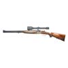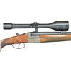 WITH SCOPE IMPORTED BY FLAIG'S. Cal. 12 Ga., 2 3/4"/222 Remington. S# 4707. The 25" demi-bloc barrels are fitted with matted top rib engraved "Franz Sodia Ferlach" in unmatted portion. Rib is fitted with claw scope bases, flip up rear sight and gold bead front. Bottoms of barrels are stamped with calibers and 1955 Ferlach nitro proofs. A sling loop is soldered to bottom barrel. Coin finished, scallop back, O/U, double Kirsten, blitz action features automatic safety, bushed strikers and double triggers (front set). Action is engraved with 90% coverage nicely cut shaded scroll surrounding game scenes; with running white tail buck and doe on left side of action and a setter pointing a pair of departing pheasant on right. Bottom of action has a scene of large grouse taking flight from tree branch. Bottom of trigger plate is flushed gold inlaid "H. T. MILLER". Blued trigger guard has bow engraved with "Flaig's" lodge logo (Flaig's was an importer of fine European guns and gunsmithing supplies through the 50's to the early 70's). Capped pistol grip stock of crotch figured European walnut measures 15" over ribbed plastic buttplate and features shadow line right hand cheekpiece, raised side panels, horn grip cap and point pattern checkering. A sling loop and cartridge magazine with spring loaded cover are on toeline. Matching one piece forend has Deeley release. Combo is fitted with Ajack scope (unmarked. either 6X or 8X) with crosshair reticle and soldered on claw rings. MEASUREMENTS: BBL: Bore Diameter: T .722". Restriction: T .043" (extra full). Wall thickness: T .023". STOCK: DAH: 3 3/16". DAC: 1 5/8". CAST: off about 1/2". LOP: 15". WEIGHT without scope: 7 lb. 2 oz. CONDITION: very fine. Retaining 90-95% original finishes on wood and metal with a fair scattering of minor marks and light wear associated with light field use. Bores are bright and shiny. Action is tight, mechanically fine. Scope is fine showing light wear, optically clear. (23-416/MGM). CURIO. $4,000-6,000.