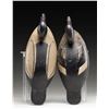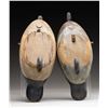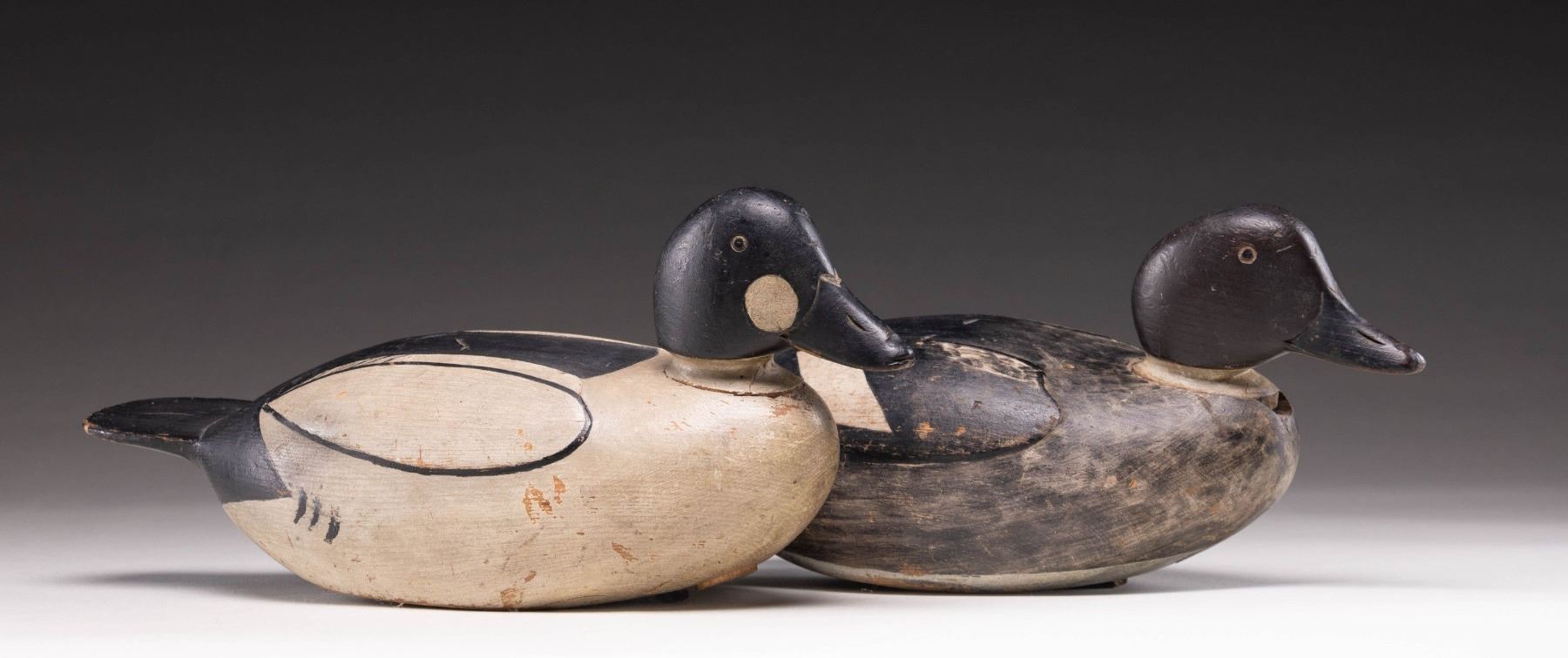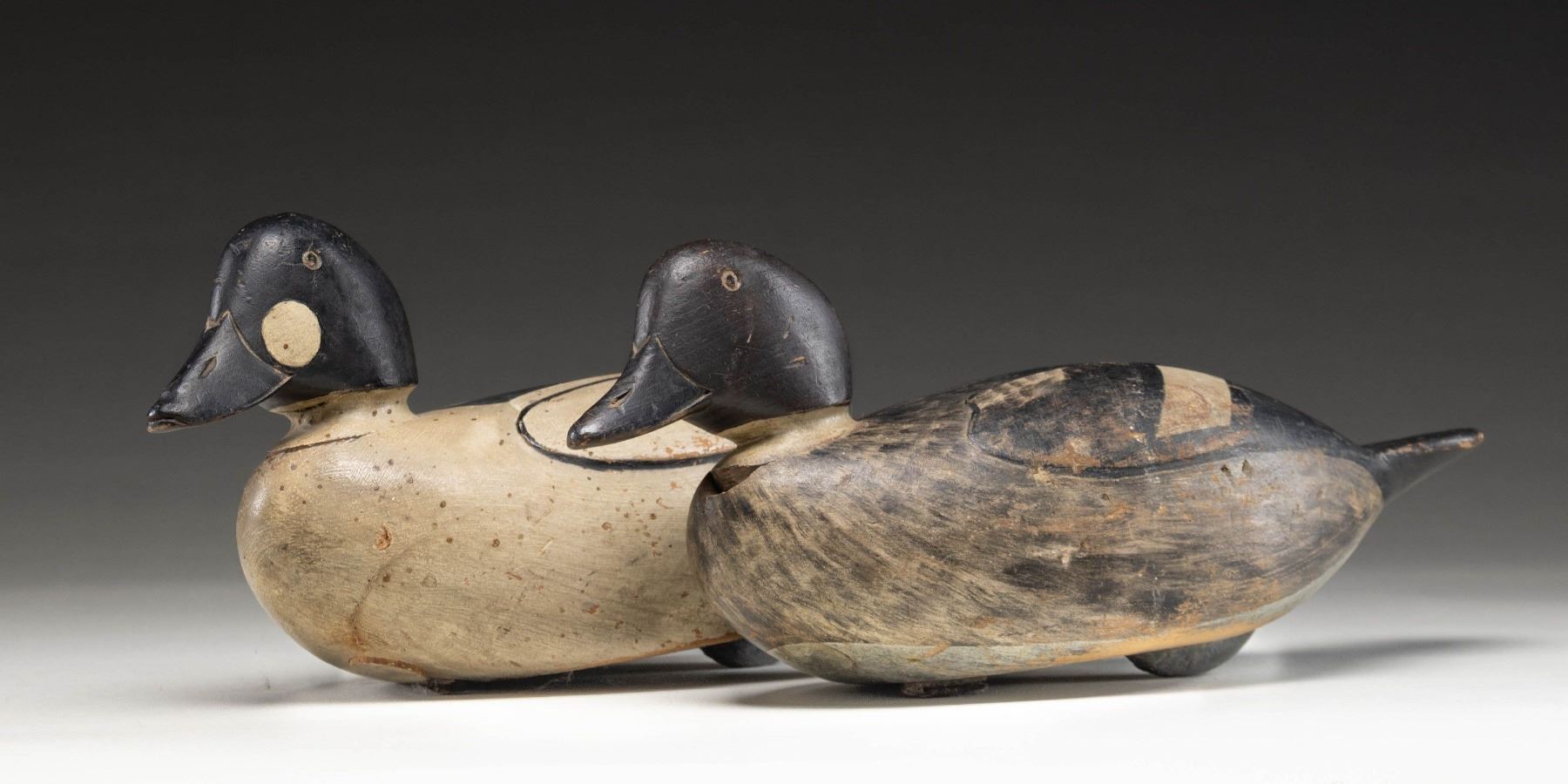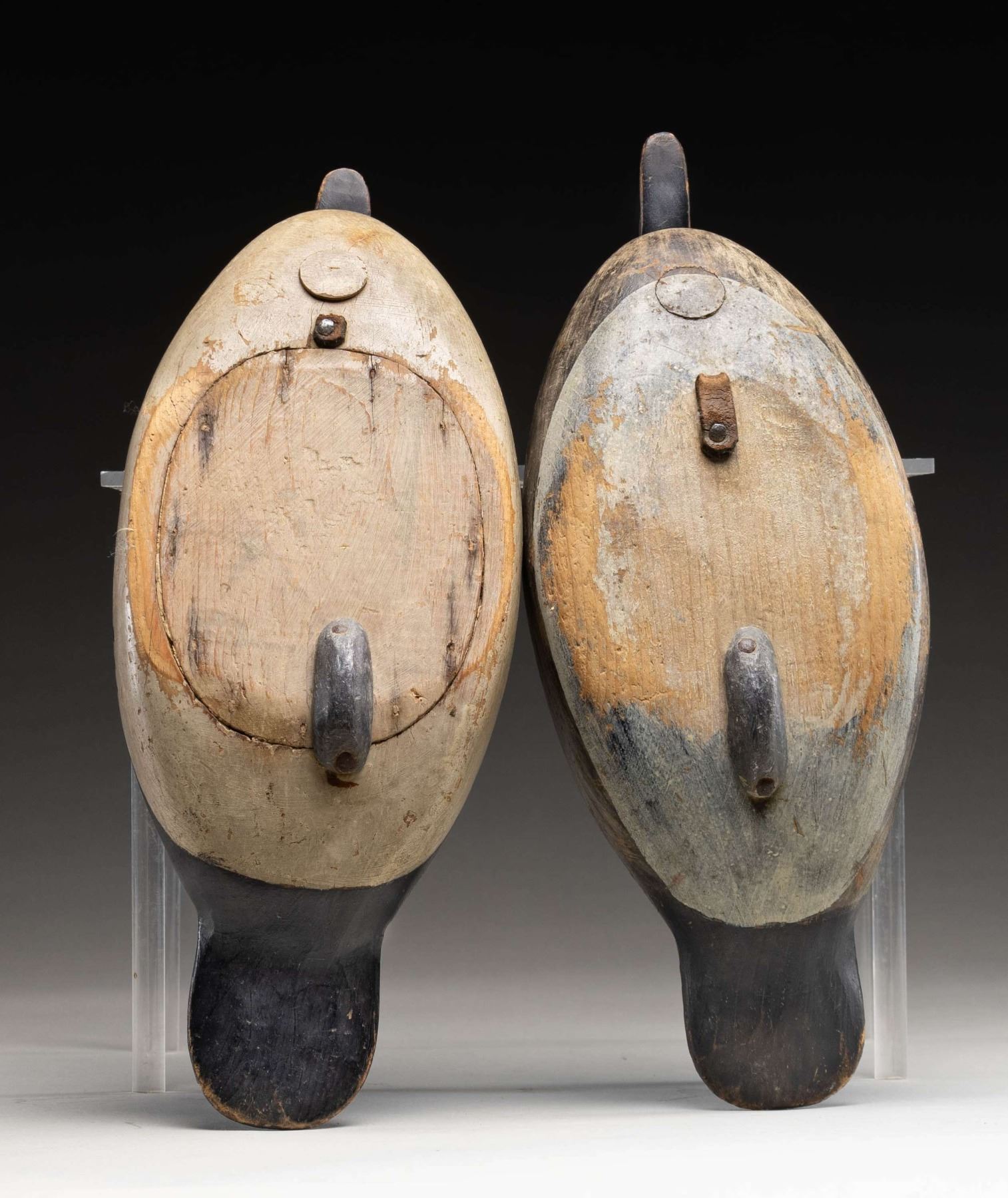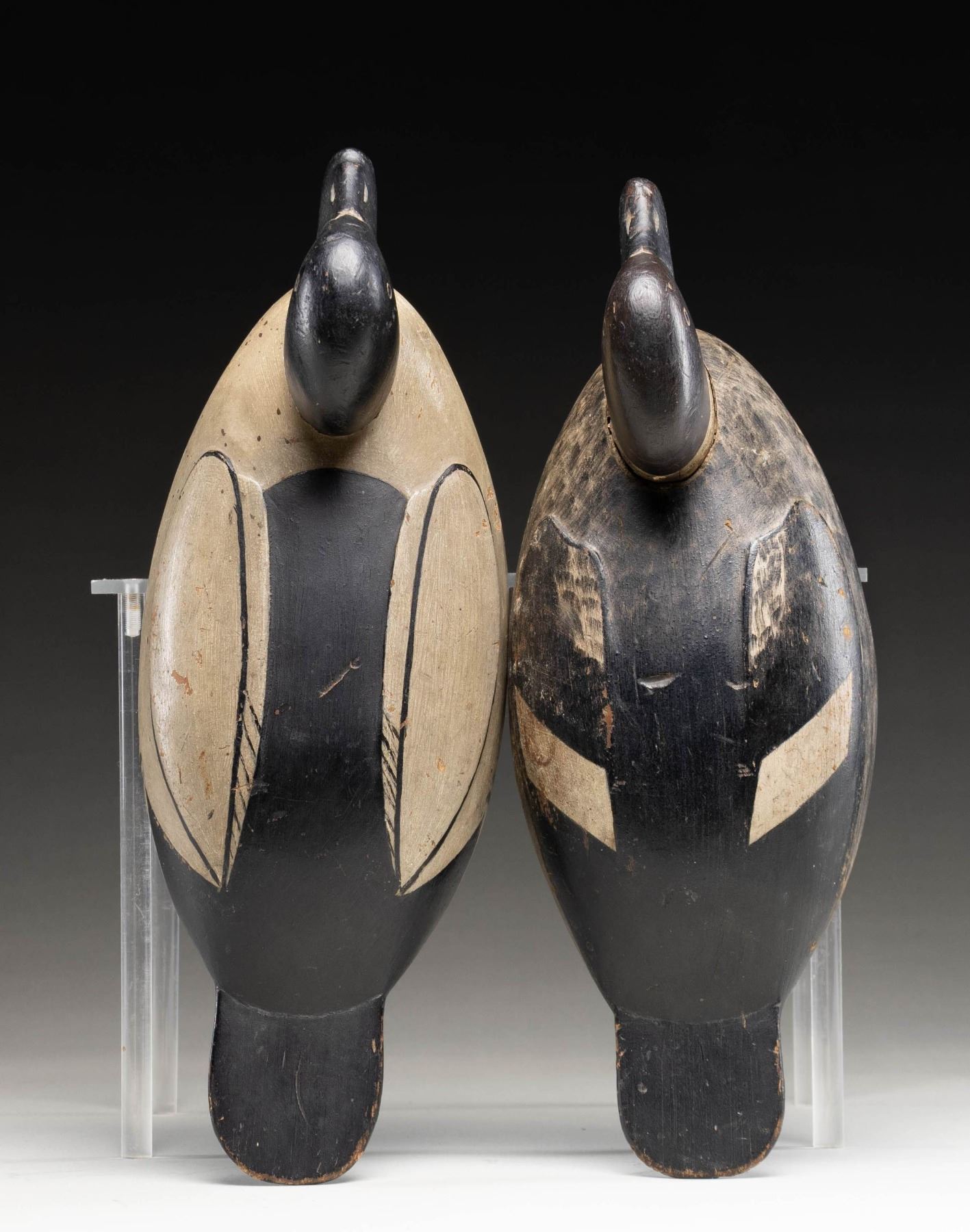 1) Hollow bodied drake measures 15" has raised wings and distinctive relief cut around neck with painted eyes. Transition to tail appears stepped. CONDITION: very fine; with old paint having some chips. 2) Matching hen measures 15" is solid bodied. CONDITION: fine; shows some rubbing to original paint. 1" chip of wood in body in front of neck. PROVENANCE: From the Private Collection of Berrien Moore III. (02-25872-1/MGM). $500-1,500.