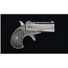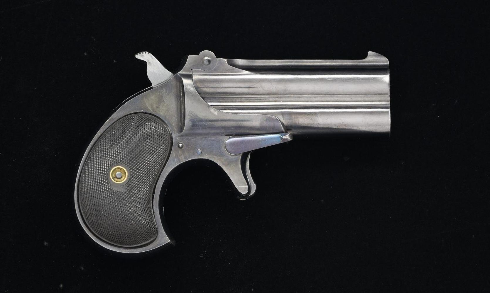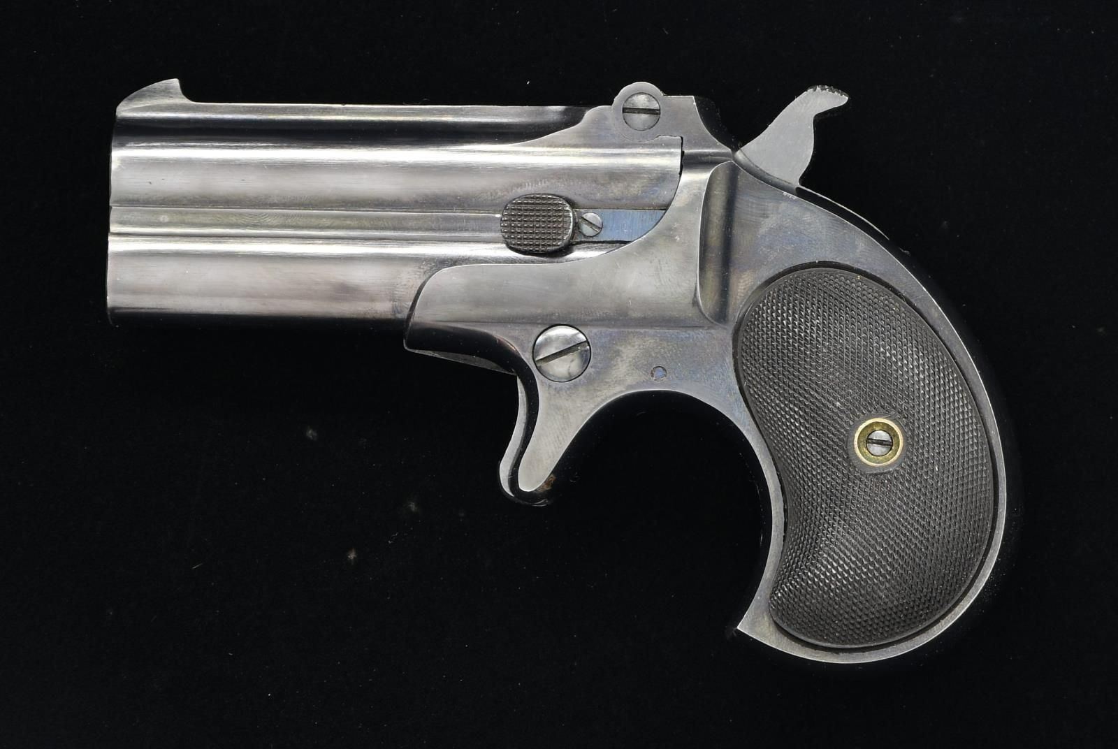 DERRINGER PISTOL. Cal. 41RF. S# 433. Bbl 3". Model 95 derringer pistol manufactured by Remington. The top of the barrel is stamped "REMINGTON ARMS CO. ILION N.Y." over the rib. Major metal components exhibit a lustrous reapplied blued finish, with some small parts being nitre blued. Frame is mounted with 2 piece checkered black hard rubber grips. Matching assembly number "433" is stamped on the left side of the frame beneath the grip, and is faintly legible on the underside of the barrel. CONDITION: excellent as professionally refinished, with metal components retaining the vast majority of their reapplied blue finish, exhibiting a few scattered small spots of mild wear and thinning overall. Brilliant mirror bores, exhibiting sharp rifling throughout. Grips show some light smoothing and a few minor marks from handling and storage, but are otherwise very good overall. An extremely attractive, professionally restored, Remington Model 95 Type II derringer. (23-2738/MLW). CURIO. $300-500.