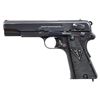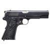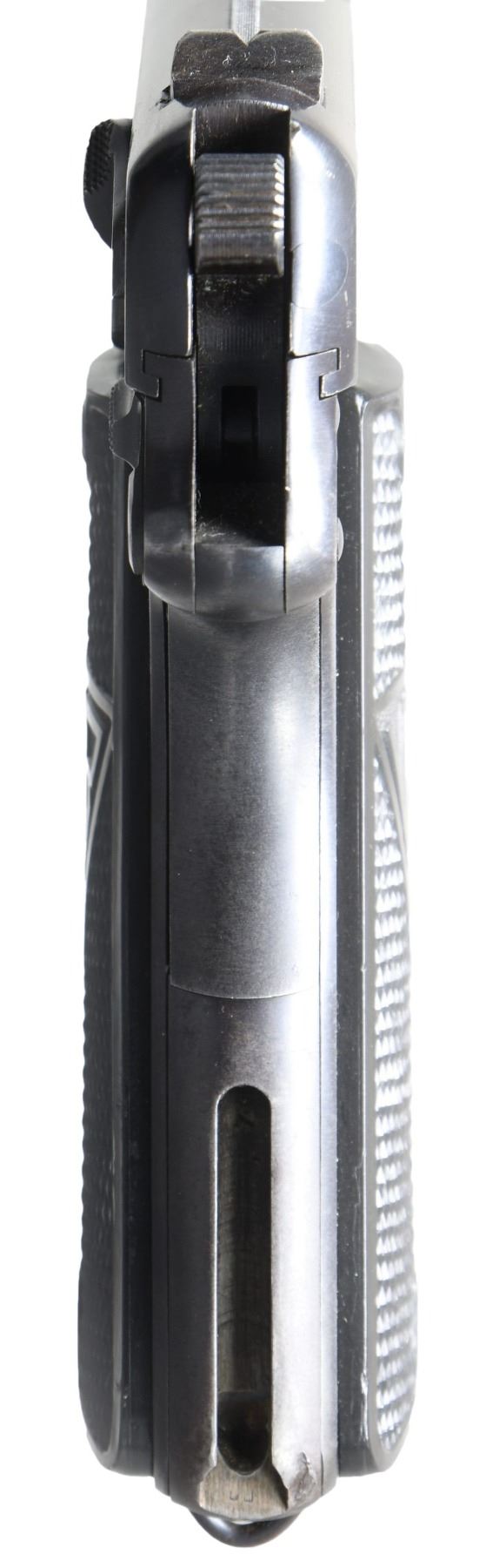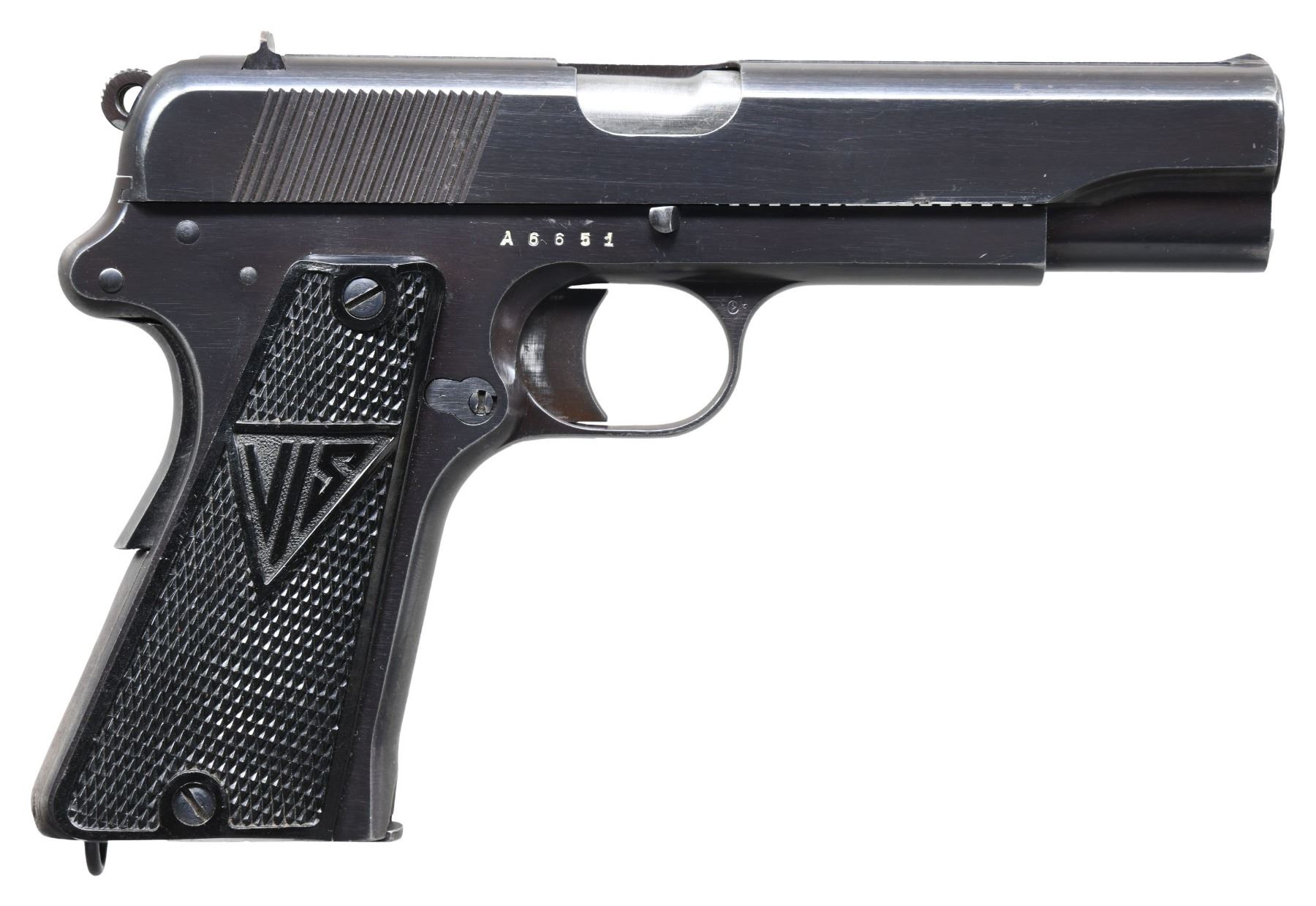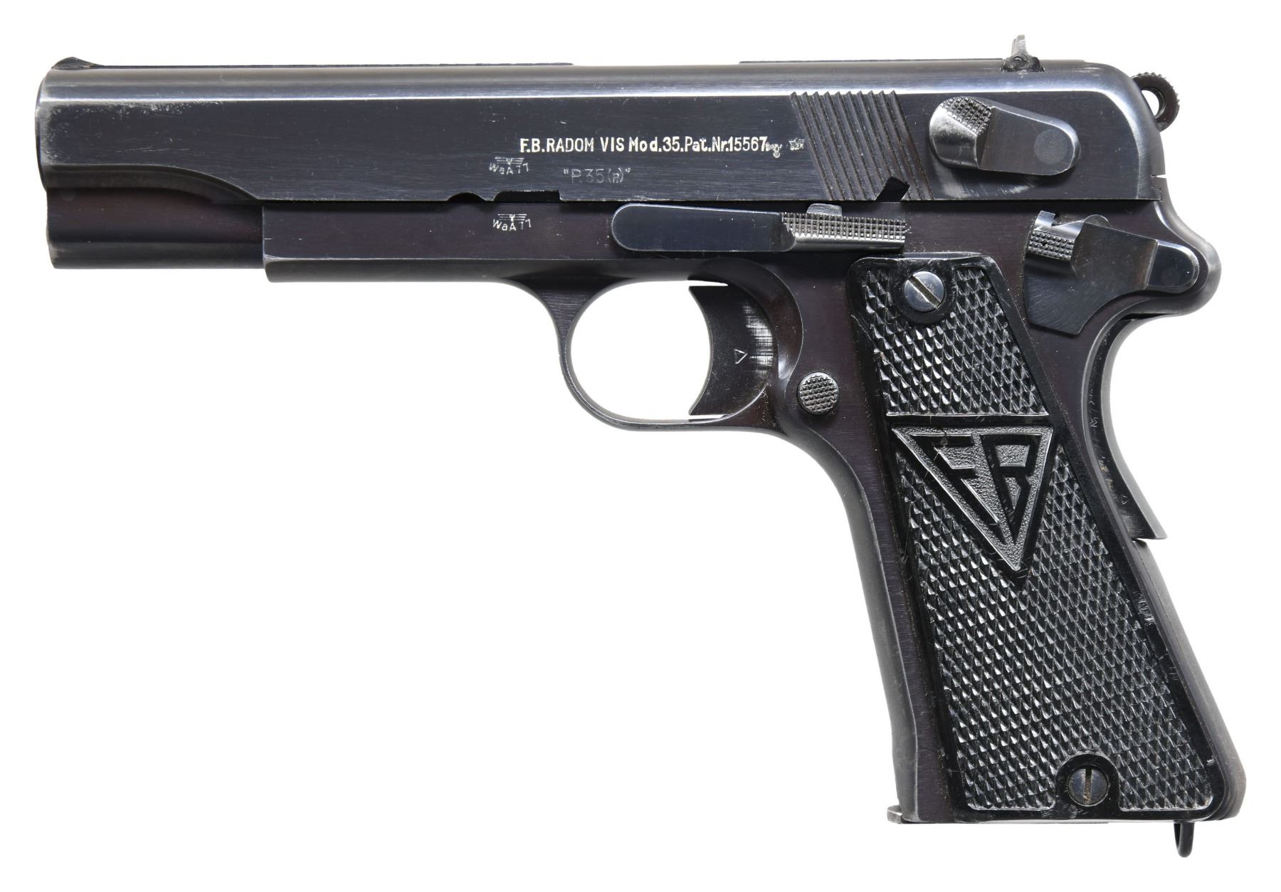 RADOM P.35(P) SEMI-AUTOMATIC PISTOL. Cal. 9mm Para. S# A6651. Bbl. 4 5/8". A relatively early production P.35(p) (also known as the "Vis.35") semi-automatic pistol mfg. while under German occupation at the Radom arsenal and assembled at Steyr. The left side of the slide is marked with a Radom Eagle/WaA77 proof (repeated on left side of frame), followed by "F.B.RADOM VIS Mod.35.Pat.Nr.15567.", followed by a German eagle firing proof and Steyr Eagle/623 proof above "P.35(p)". Left side of the bbl. lug exhibits 2 Steyr Eagle/623 proofs. Small Polish arsenal proofs are present in the usual areas. Metal components exhibit a bright polished blue finish overall, save for on the bbl., which is polished in-the-white. Slotted frame is mounted with 2-piece checkered black plastic grips, with "FB" on the left and "VIS" on the right. Butt is fitted with a lanyard staple. Slide features a matte rib, with an integral blade front sight and dovetailed V-notch rear sight. Frame and slide (interior) are matching via the full S#, with the extractor matching via "6651" and the bbl. matching via "651". MAGS: 1 blued 8-rd. marked with an Eagle/169 proof on the underside of the floorplate. CONDITION: metal components retain the majority of their original polished blue finish, exhibiting light to mild edge wear, a few areas of mild wear, a few small spots of light pitting, as well as some superficial handling marks overall. Forward edges on left side of slide exhibit mild to moderate wear to gray patina. Grip straps show mild wear and thinning that is fading to gray patina, as well as some light surface oxidation. Mirror bore, exhibiting a small spot of dark pitting, while retaining well defined rifling throughout. Proper manual mechanics. Grips show light wear, with the left panel exhibiting a repaired break and a few small chips. A nice example of an earlier production P.35(p) pistol. (25-3737/MLW). CURIO. $1,500-2,250.