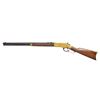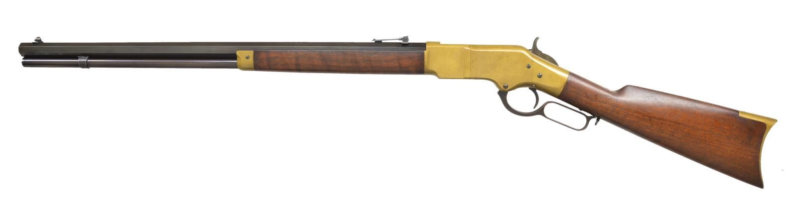 ACTION RIFLE. Cal. 44 HRF. S# 32336. Bbl. 24" octagon that appears to be replacement. Sporting front sight with folding leaf rear sight. Full length mag. Brass action with case colored hammer and lever. Replacement forearm and straight grip stock of nicely grained walnut have brass cap and trapdoor buttplate. Serial number indicates 1870 mfg. UNATTACHED ACCESSORIES: 4 piece cleaning rod contained in stock compartment. CONDITION: very fine as restored by Ron Kudro. Bbl. and mag. tube retain over 80% reblued finish showing some fading and faint edge wear. Brass parts exhibit a very pleasing artificial mustard color patina. Hammer and lever have largely faded to brown showing faint traces of colors. Stock set very good finish showing almost no wear or marks. Bright bore retains very good rifling showing a small spot of pitting. (01 – 21717/DS). ANTIQUE. $7,000-10,000.
