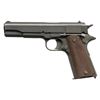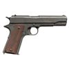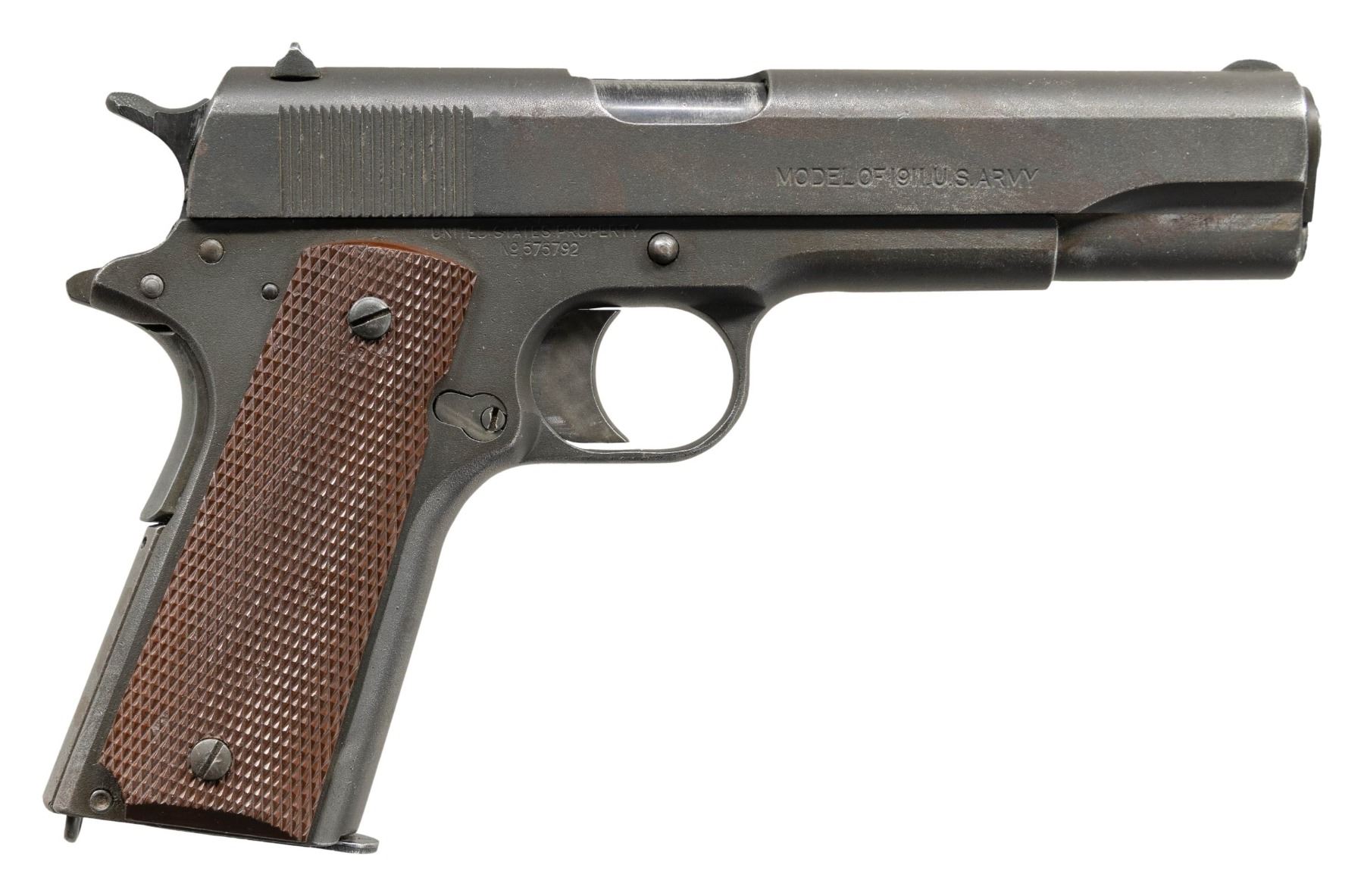 SEMI AUTO PISTOL. Cal. 45 ACP. S# 575792. Originally mfg. 1918; Partial "AA" stamp on left side of frame indicates Augusta Arsenal rebuild mark. Replacement parts include High Standard 5" barrel & Keyes Fiber grips. MAGS: 1 M.S. Little 7 rd. CONDITION: slide, frame & small parts have parkerized arsenal refinish with deep marks, edge wear & scratches. Very good grips. Fair barrel blue with good rifling showing light frosting & residue. PROVENANCE: The Esteemed Norm Greenberg Collection. (25-4165/MD). CURIO. $1,200-1,800.