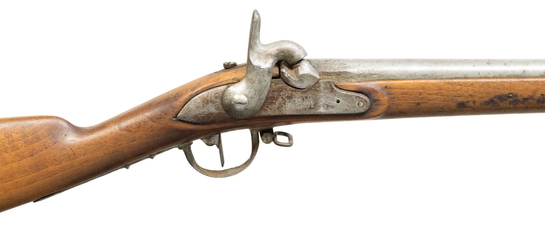 Cal. 70. NSN. Similar to US model 1842, with 41" smoothbore barrel, 3 barrel bands, iron furniture, lock has large engraved "HBM". UNATTACHED ACCESSORIES: collector tags attached. CONDITION: good overall, replaced hammer screw & mainspring, ramrod is swelled Model 1861 cut short with no threads, buttplate screw mortises are lead filled. Back of lockplate stamped "JOHN MANIS / SHOT 50 DEER / WITH THIS GUN / 1881". Mechanics need attention, will not hold cock, clear dirty bore. PROVENANCE: from the PMRB Collection. (01-28440/JS). ANTIQUE. $300-400.