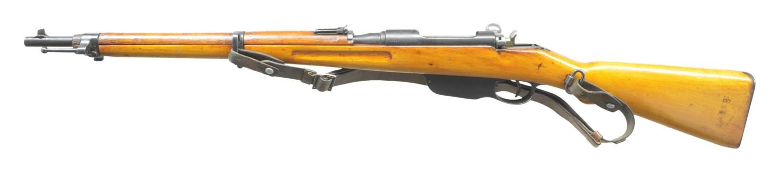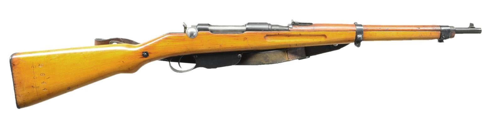 STRAIGHT PULL BOLT ACTION RIFLE. Cal. 8x56R. S# 5844D. Bbl. 19 3/4". These arms were modified to Stutzen configuration from carbines. Serial number matches on receiver, bbl., stock & upper band. Import marked on right side of bbl. Receiver ring is marked on top w/ "BUDAPEST" "M95". Bbl. is marked over chamber w/ "S" which is stamped over 1918 date & acceptance mark. Ladder rear sight graduated to 2,400 meters. Inverted V front sight. Upper band has bayonet lug & stacking rod. Retaining screw enters from left side. Lower band has provision for side sling. Bottom swivel has been deleted. Non matching hardwood stock set. Buttstock has been renumbered to match. Bottom swivel has been removed from buttstock & hole filled w/ dowel. Unmarked period brown leather sling w/ swiveling attachments. CONDITION: stock set has arsenal rework finish w/ slight loss of wood in inletted areas, light wear & scattered handling marks throughout. Metal has 80% arsenal rework blue finish w/ light wear & handling marks. Bore has worn lands turning dark in grooves. (22-617/RW). CURIO. $150-250.