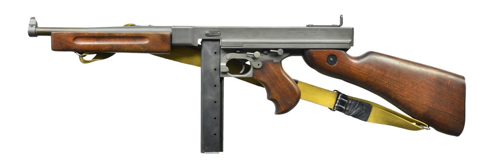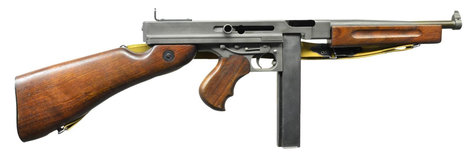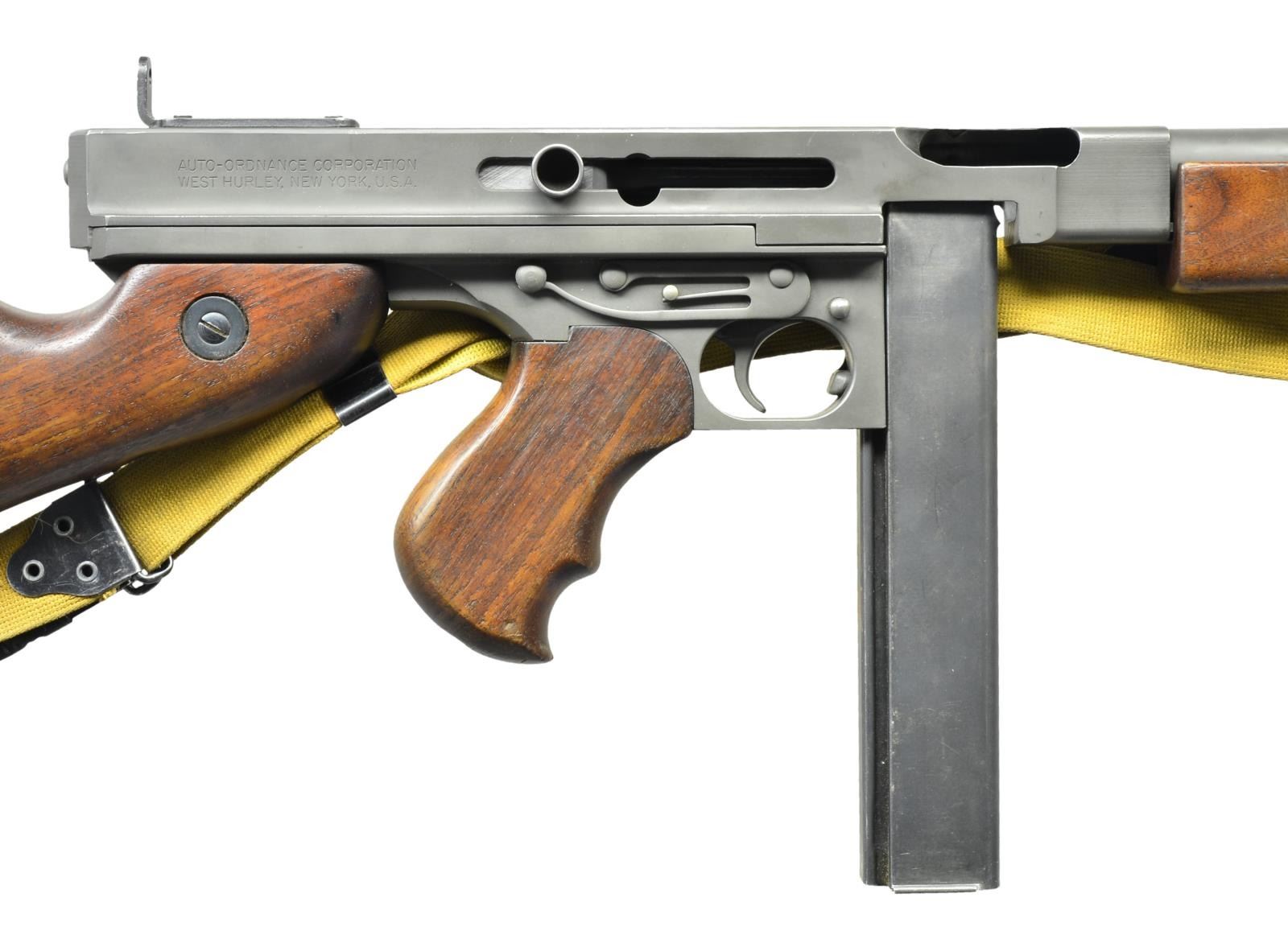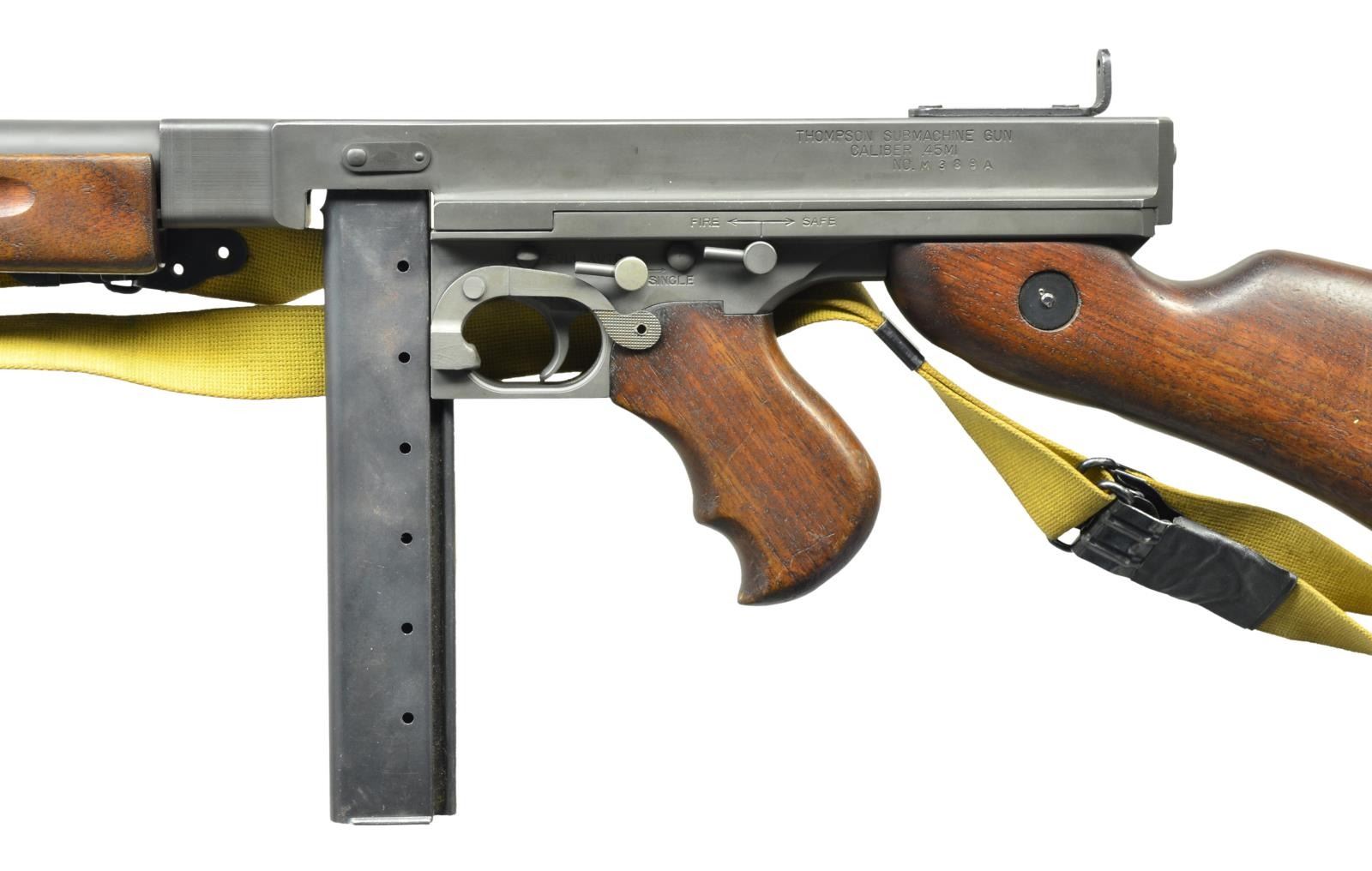 Cal. 45 ACP. S# M389A. Bbl. 10.5". A classic “Tommy Gun" in fantastic condition. Even parkerized gray finish on all exposed metal surfaces w/ classic hardwood furniture. Above the horizontal handguard lies a smooth tapered bbl. which terminates at the familiar front blade sight. Sling swivels front & rear w/ tan canvas sling. The simple yet effective rear sight combines a fixed peep w/ a notch in its protected environment for fast target acquisition. Right side smooth cocking handle. The M1 utilizes the heavily produced 20 rd. & 30 rd. stick mag. Receiver markings are as follows: (Left side) “THOMPSON SUB MACHINE GUN – CALIBER 45 M1 – NO. M389A” (Top) familiar Thompson trademark bullet logo; (Right side) “AUTO – ORDNANCE CORPORATION – WEST HURLEY, NEW YORK, U.S.A.”. MAGS: 2 - 30 rd. stick Mags. 1 Mag. Matte blue finish, the other a traditional gray parkerized finish. Both mags appear to be MFG by the Seymour Products Company. Though the lettering on the parkerized is difficult to read. UNATTACHED ACCESSORIES: Bulldog 35" black padded nylon transport bag. CONDITION: parkerizing on all exposed metal surfaces is complete & consistent. Wooden furniture exhibits tiny light impressions a typical characteristic earned during storage. Pistol grip shows a little more wear w/ some light chipping in bottom finger placement area. Wood tone on all furniture matches very well. Dark bore w/ strong rifling. Fire control mechanism appears to function correctly when cycled by hand. NATIONAL FIREARMS ACT SMG REQUIRING BATF TRANSFER BEFORE TAKING POSSESSION. FULLY TRANSFERABLE. (03-1529/JZ). MODERN CLASS III. $13,000-16,000.