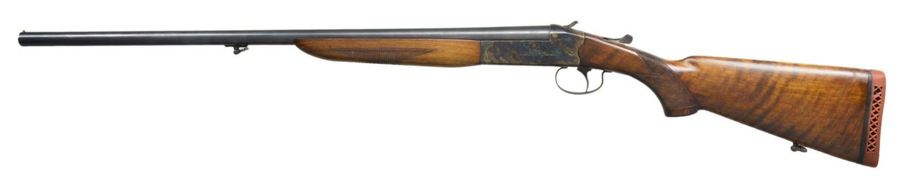 Cal. 16 Ga. S# 252712. Bbl. 28 1/4" w/ brass front bead, 2 3/4" chamber & choked “FULL”. Matching S#s & ejector. Checkered beavertail forend & ebony capped pistol grip stock w/ sling swivels & 14 5/8" LOP to factory recoil pad. Importer marked. UNATTACHED ACCESSORIES: black plastic case. CONDITION: 90% blue on bbl. w/ 85% case colored frame. Stock set has an added coat of finish w/ a few scattered dings & dents. Bore is quite bright w/ fine scattered pitting. PROVENANCE: "Save the Fine Guns". T&G German Gun Imports, bringing fine German guns to a more appreciative market. (22-5127/CW). MODERN. $200-300.