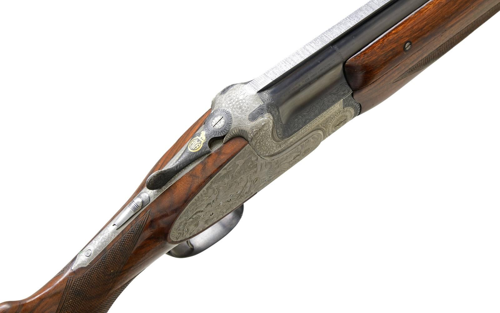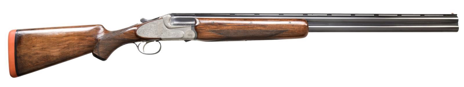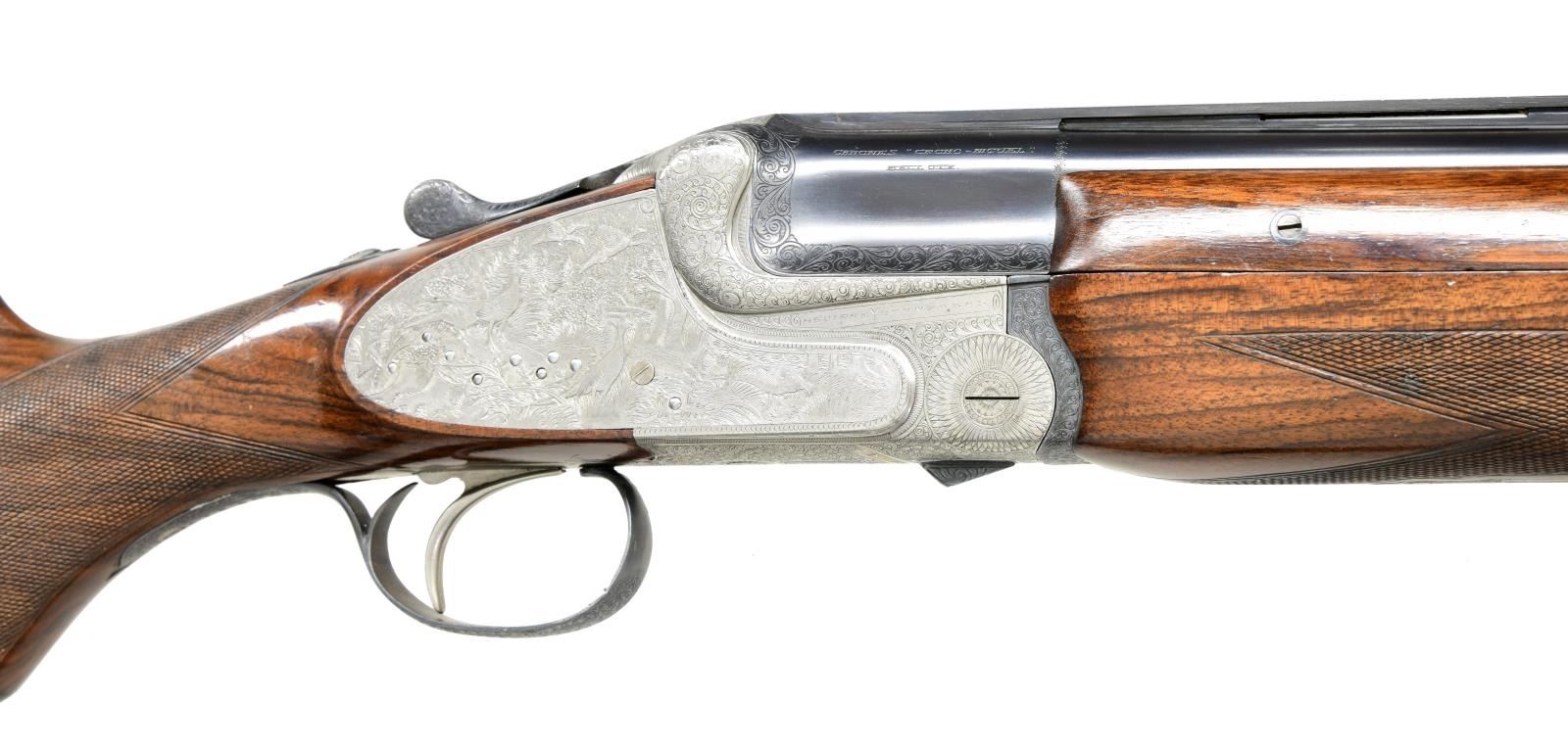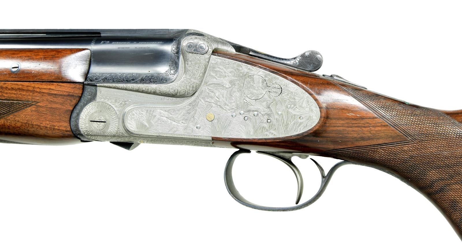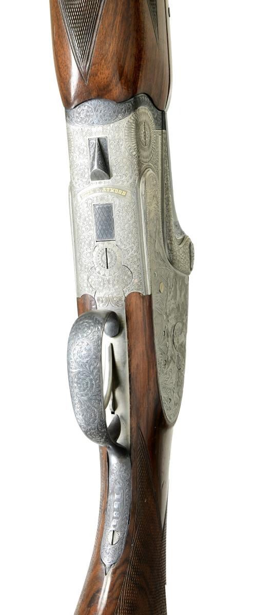 Cal. 12 ga. S# 41585. Merkel style hand detachable sidelock action. Features include double underlug & crossbolt locking, cocking indicator, ejectors & single non-selective trigger. Lockplates have highly detailed game scene engraving w/ stippled backgrounds. Right lock shows pheasants, left lock features flying mallards. Balance of action has full coverage arabesque scroll hand engraving. Trigger plate has gold marking "Ruth C. Atwood". Top lever has gold "AYA" trademark. 3 piece walnut forearms & hard rubber capped pistol grip stock of fancy European walnut having marbled grain w/ dark streaking. LOP: 13 5/16" over solid red London style pad. DAC: 1 3/16". DAH: 1 9/16". Bbls. 1: Gold no. 1 at breech end. 28" vent rib. Red target front sight w/ white mid bead. Bore diameter: U .725 O .724. Choke constriction: U cyl. bore O cyl. bore. Minimum wall thickness: U .032 O .033. Bbls. 2: Breech end has gold no. 2 marking. 28" vent rib. Red target front sight w/ white mid bead. Bore diameter: U .726 O .725. Choke constriction: U .023 O .026. Minimum wall thickness: U .028 O .030. Bbls. 3: Breech end is marked w/ gold no. 3. 29 1/2" vent rib. Red target front sight w/ white mid bead. Bore diameter: U .726 O .726. Choke constriction: U .025 O .040. Minimum wall thickness: U .034 O .034. WEIGHT w/ 28" bbls: 8 lbs, 1.2 oz. UNATTACHED ACCESSORIES: leather covered 3 bbl. set case w/ green felt interior. Case contains spare action parts. Bbls. 2 & 3 have leather covers. Case lid has oval nameplate w/ initials "RCA". Case exterior shows heavy wear w/ several shooting event labels. CONDITION: all bbls. retain over 97% blue & have very good bright bores. Action has very good satin finish. Stock & forearms have original finish showing spots of wear w/ scattered scratches & marks. Forcing cones & chambers are opened to 3". Action is tight & on face w/ top lever sitting just right of center. (24-2192/DS). CURIO. $6,000-8,000.