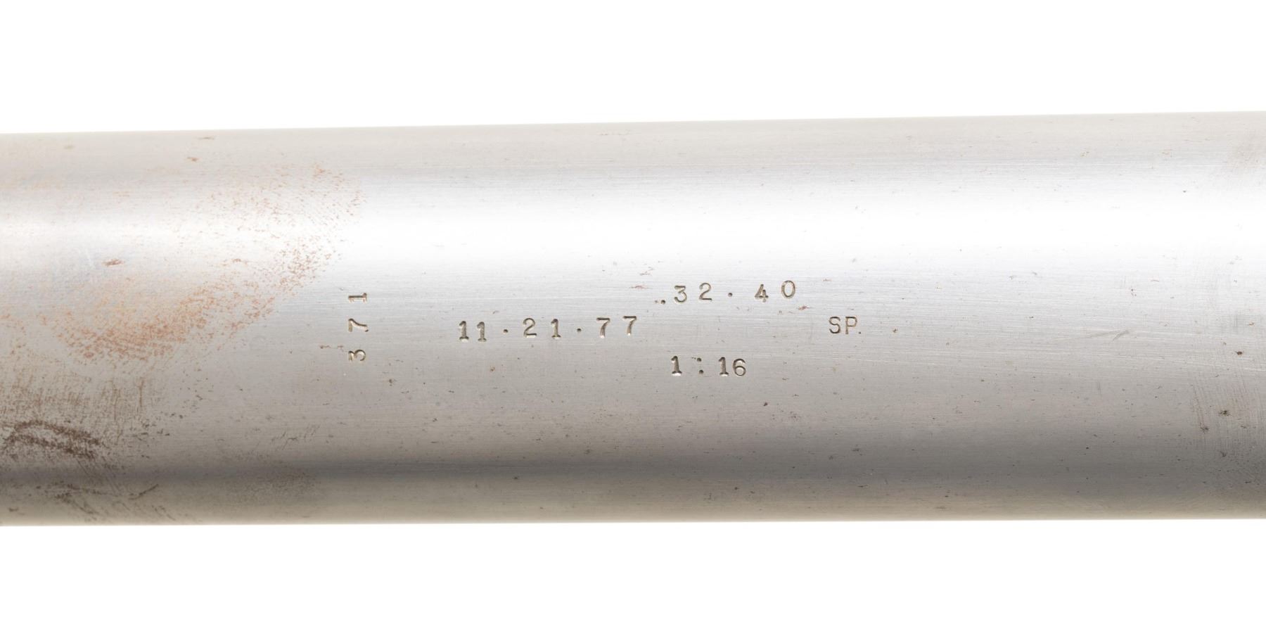 Cal. 32-40. S# 55284. Antique Winchester receiver mfg. approx. 1892. Custom Bull 30" bbl. measuring 1 1/8" across face. Top for barrel has 1 scope block w/ plug screws for another. Bottom of barrel has bench rest, stamps showing 1:16 twist, date of custom build 11-21-1977, # 371. Custom walnut buttstock w/ checkered buttplate & tall comb. CONDITION: the in the white barrel shows peppery oxidation throughout with scattered scratches & marks. Action faint case colors with oxidation. Stock shows epoxy filler with contact to action w/ mildew stains throughout & sm. cracks. Near excellent rifling. (01-29025/MD). ANTIQUE. $200-400.