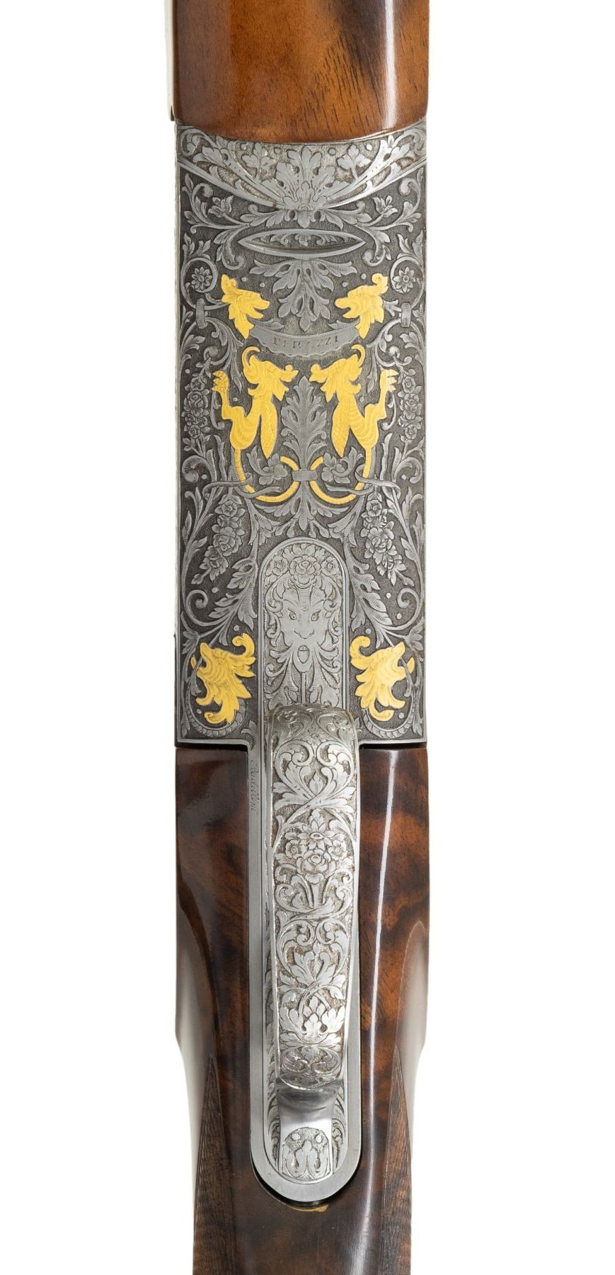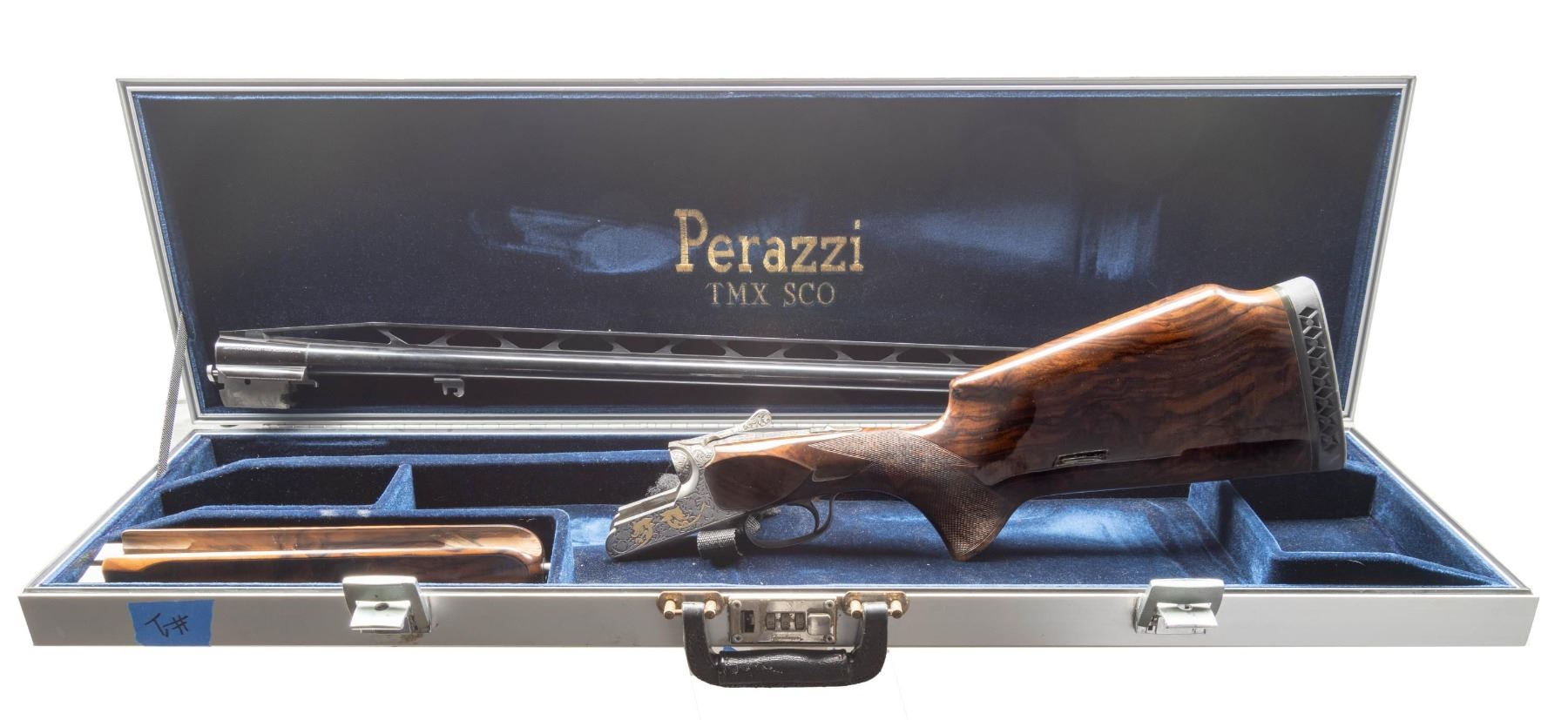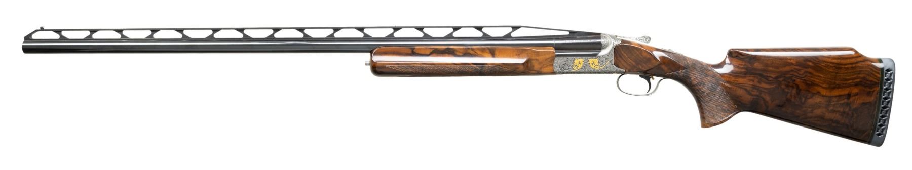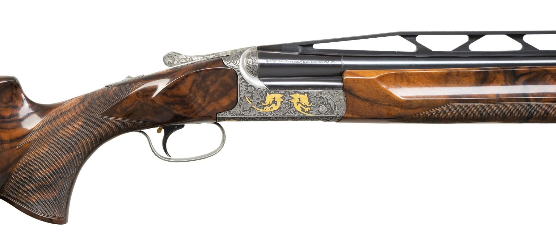 Cal. 12 Ga. 2-3/4". S# 112120. Made as a single shot only this fine gun with removable trigger group has 34" fixed full choke barrel with high raised skeletonized matted rib. Bottom of mono bloc is stamped with S# and 1998 Italian nitro proofs. Barrel date code appears to be “BL” which is 1998. Coin finished single shot action features removable trigger group and rugged double hook hinge pin. Action is engraved with full coverage truly exceptional large flowing semi-relief acanthus with floral highlights. On sides and around bottom this superb work surrounds flush gold inlaid Bulino detailed mythological beasts resembling dragons with two, found on each side. Bottom of action has two more of these back to back monsters at center and the heads of two at rear. "PERAZZI" is on fancy ribbon above center dragons which is flanked by two more dragon heads. An engraved grotesque face is found on front of trigger group and more relief floral scroll is on bow. This incredible work is by the highly respected Giacomo Badillini who passed away in 2012. His signature is on side of trigger mortise. Exhibition quality, figured and marbled European walnut extreme pistol grip Monte Carlo stock measures 14-1/2" over black Perazzi pad and has point pattern checkering on grip with right hand palm swell. Matching full target forend has Anson release. MEASUREMENTS: STOCK: DAH: 2-1/8". Rear of Monte Carlo 1-1/4". DAC: 1-3/8"+. CAST: neutral. LOP: 14-1/2". WEIGHT: 6 lb. 8 oz. UNATTACHED ACCESSORIES: gun is housed in aluminum "Americase" lined in blue velvet. Gold embroidered "Perazzi" "TMX SCO" is in lid. CONDITION: exceptionally fine. Appears to have been shot fairly little with only a few minor marks in wood and metal finishes. Bore is very fine. Action is tight. Buttstock has been properly secured. (25-6617/MGM). MODERN. $6,000-9,000.