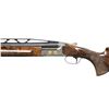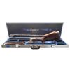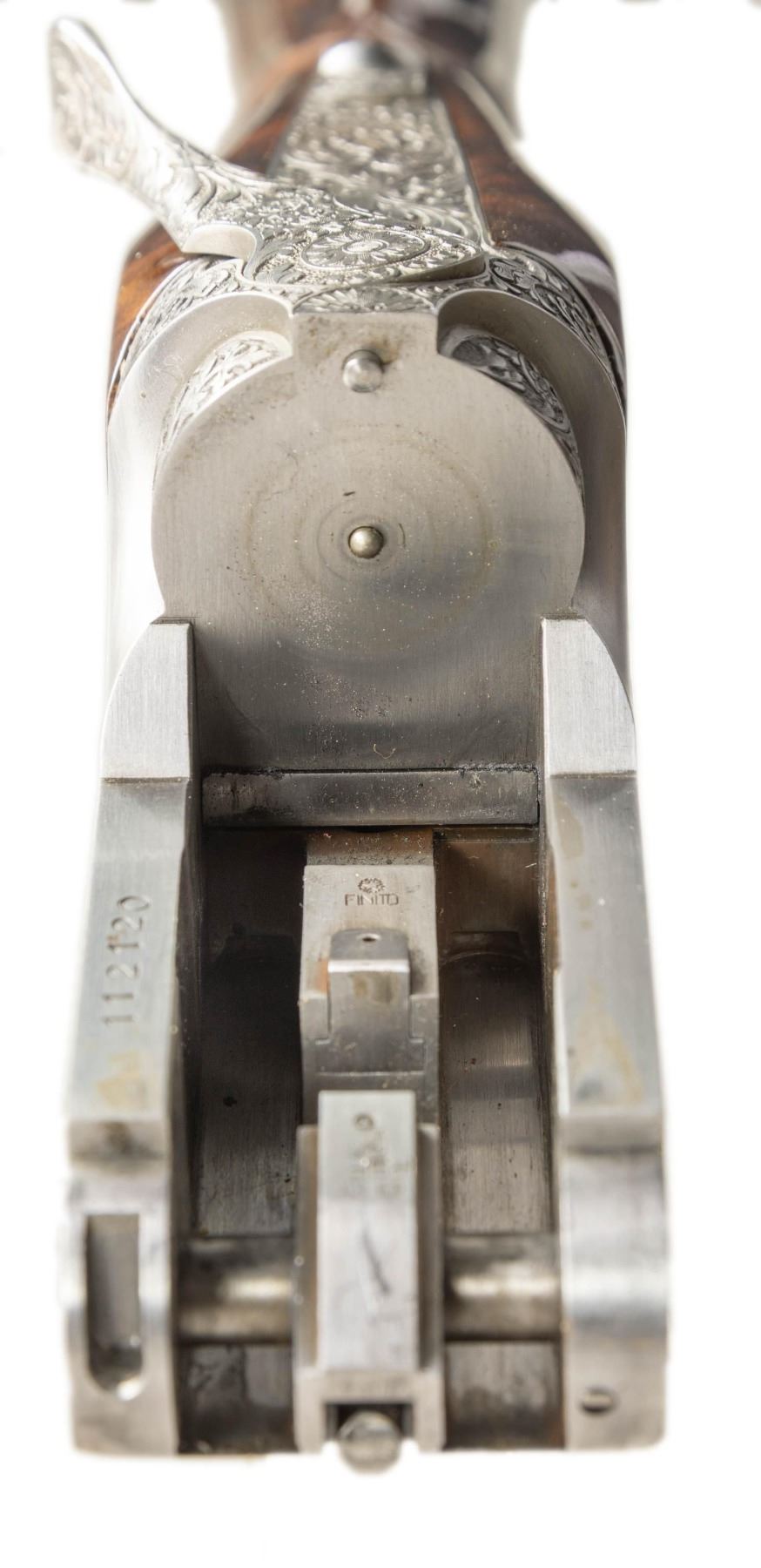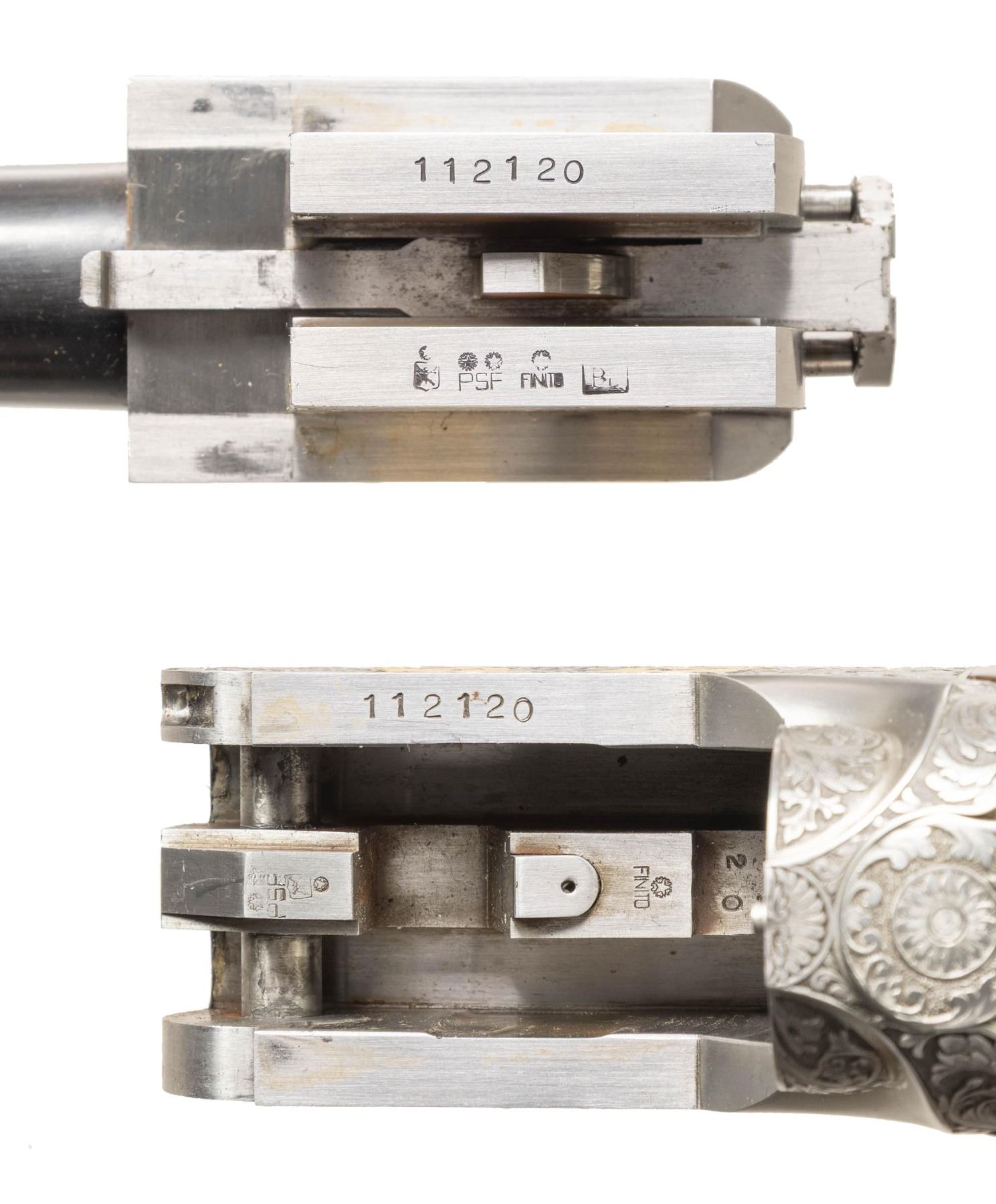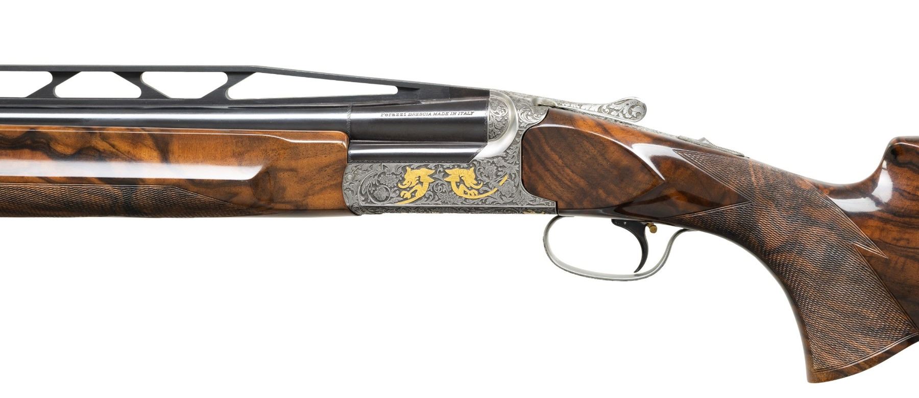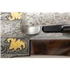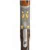 Cal. 12 Ga. 2-3/4". S# 112120. Made as a single shot only this fine gun with removable trigger group has 34" fixed full choke barrel with high raised skeletonized matted rib. Bottom of mono bloc is stamped with S# and 1998 Italian nitro proofs. Barrel date code appears to be “BL” which is 1998. Coin finished single shot action features removable trigger group and rugged double hook hinge pin. Action is engraved with full coverage truly exceptional large flowing semi-relief acanthus with floral highlights. On sides and around bottom this superb work surrounds flush gold inlaid Bulino detailed mythological beasts resembling dragons with two, found on each side. Bottom of action has two more of these back to back monsters at center and the heads of two at rear. "PERAZZI" is on fancy ribbon above center dragons which is flanked by two more dragon heads. An engraved grotesque face is found on front of trigger group and more relief floral scroll is on bow. This incredible work is by the highly respected Giacomo Badillini who passed away in 2012. His signature is on side of trigger mortise. Exhibition quality, figured and marbled European walnut extreme pistol grip Monte Carlo stock measures 14-1/2" over black Perazzi pad and has point pattern checkering on grip with right hand palm swell. Matching full target forend has Anson release. MEASUREMENTS: STOCK: DAH: 2-1/8". Rear of Monte Carlo 1-1/4". DAC: 1-3/8"+. CAST: neutral. LOP: 14-1/2". WEIGHT: 6 lb. 8 oz. UNATTACHED ACCESSORIES: gun is housed in aluminum "Americase" lined in blue velvet. Gold embroidered "Perazzi" "TMX SCO" is in lid. CONDITION: exceptionally fine. Appears to have been shot fairly little with only a few minor marks in wood and metal finishes. Bore is very fine. Action is tight. Buttstock has been properly secured. (25-6617/MGM). MODERN. $6,000-9,000.