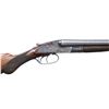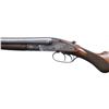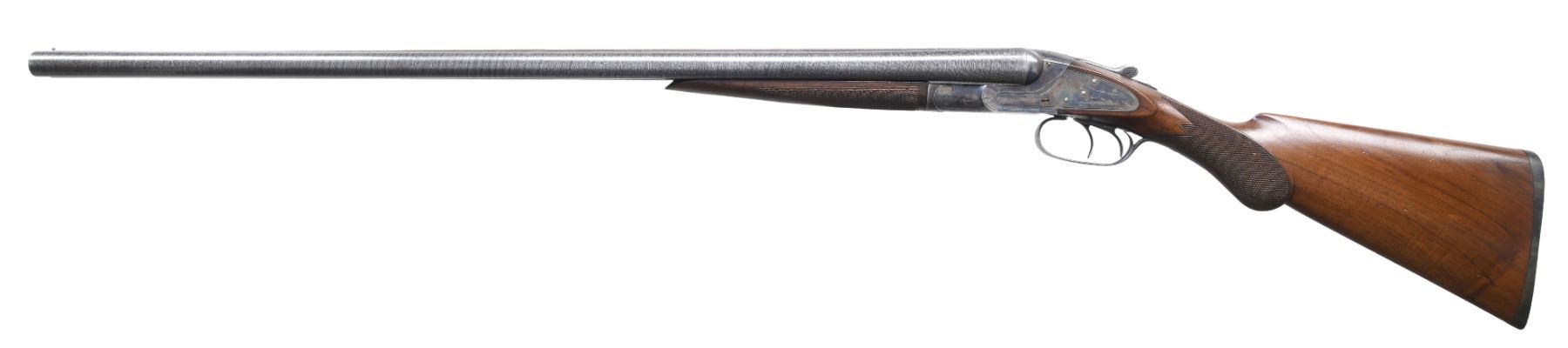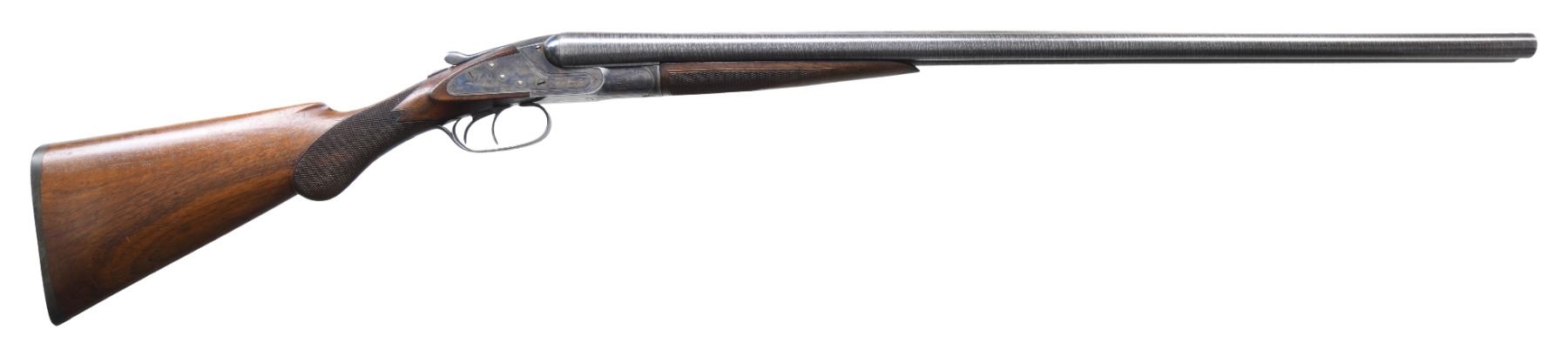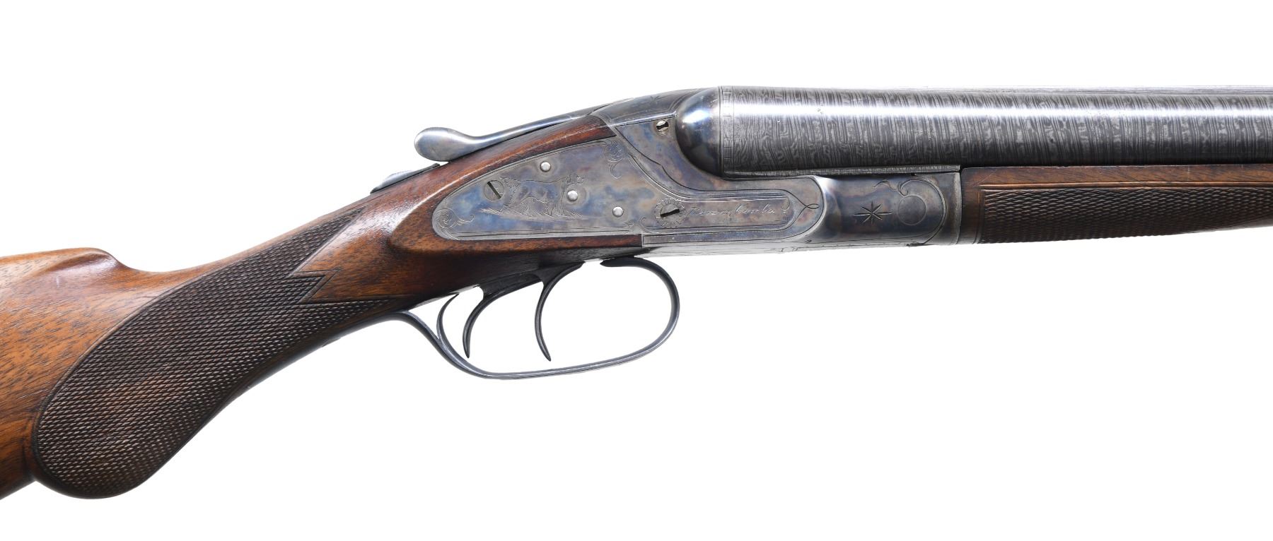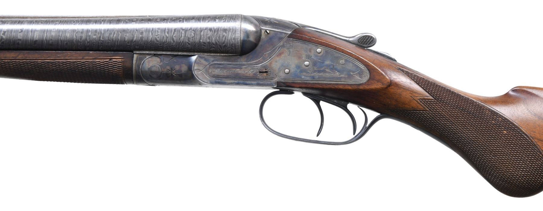 Cal. 12ga 2 1/2". S# 3418. Bbls are 30" of Batavia damascus steel. Fixed FULL and MOD chokes. Steel front bead. Case colored sidelock action with pointing dogs on the locks. Dogs are surrounded by straight line borders with scroll highlights. Double triggers. Extractors. Ebony tipped splinter forearm and round knob walnut stock with hand checkering. LOP: 14" over original checkered hard rubber buttplate. CONDITION: very nice original gun. Bbls retain over 90% browned finish showing vivid damascus pattern. Action retains 80% lightly faded case colors. Original wood finish shows light wear with scattered scratches and marks. Tight action, top lever sets nicely right of center. Very good bright bores. (25-1158/DS). CURIO. $1,000-1,500.