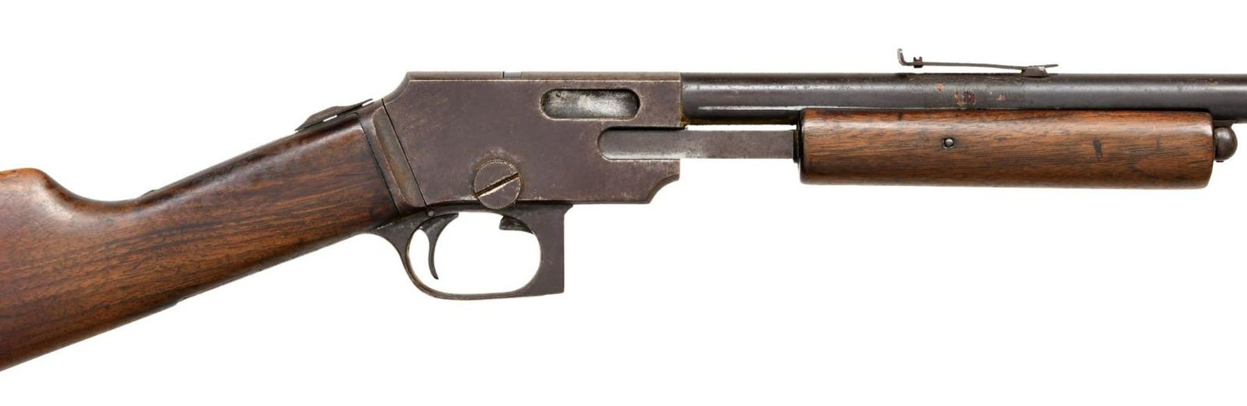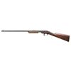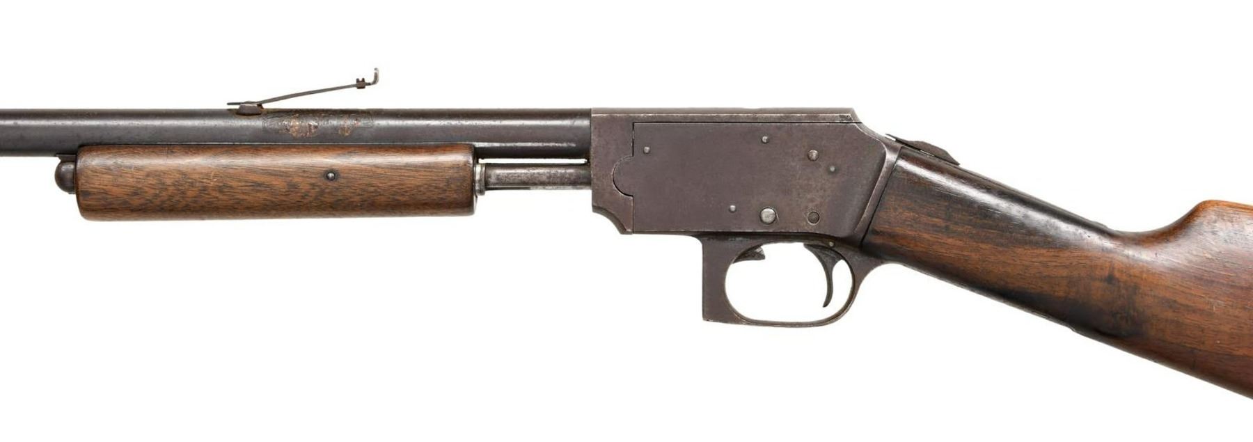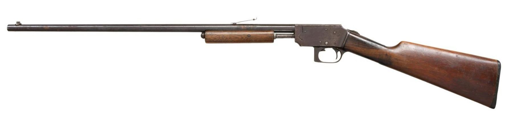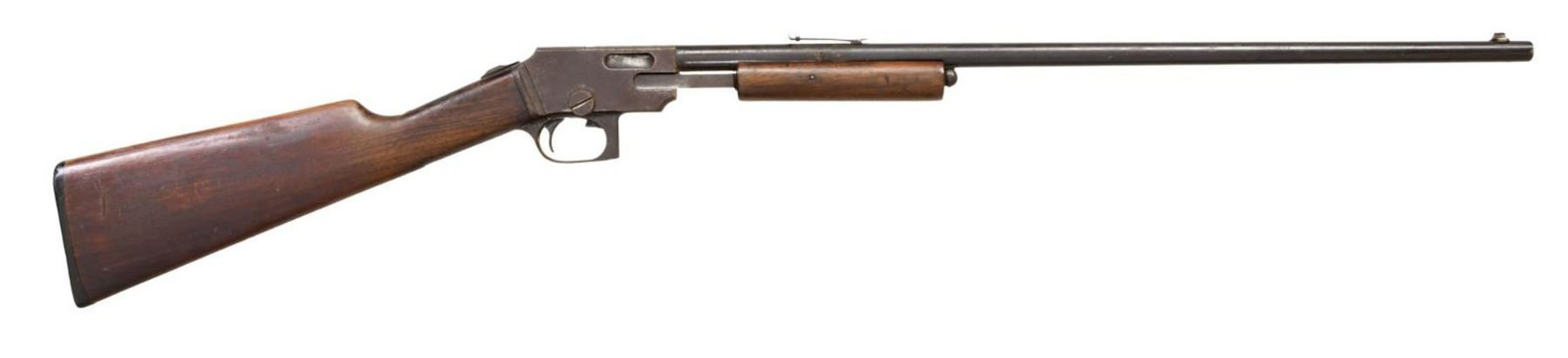 1) BAKER GUN & FORGE NO. 2 PUMP ACTION RIFLE. Cal. 22 LR. S# 7964. Bbl. 24" rnd. Gold bead front sight. Elevator rear sight that has broken at the rear. Pump action rimfire rifle similar to a Savage 1903. Savage considered these guns to be a patent infringement. Hardwood straight grip stock & forend. MAGS: none present. CONDITION: stock has a couple small cracks behind lower tang, scattered staining, handling wear & dings. Metal is a dull brown patina w/ scattered oxidation, some sticker residue & light dings. Worn pitted bore. (23-2666/MJC). 2) PIEPER BELGIAN SINGLE SHOT RIFLE. Cal. 22 RF. NSN. Bbl. 22 1/2" oct. Replacement low profile brass blade front sight. Fixed rear sight. Bbl. marked "H. Pieper". Rolling Block style action. Checkered walnut stock. Butt appears warped to right side. CONDITION: stock has a couple small cracks, scattered dings & handling wear. Metal is a gray patina w/ a few areas of pitting, scattered oxidation & dings. Bore shows some pitting but strong rifling. (23-5009/MJC). ALL CURIO. $150-200.