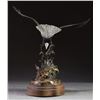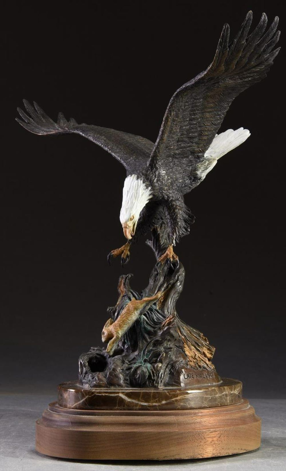 “LATE FOR LUNCH”. This sculpture measures 17 1/4" in height including the marble base & wooden plinth. The wingspan of the eagle is slightly over 15”. The sculpture itself depicts a bald eagle in flight, diving to capture hapless rabbit running for its life. The rabbit is diving for his hole in a tree trunk just ahead of the eagle’s talons. The base of the tree trunk is marked “LATE FOR LUNCH 83/99 DAVID MANUEL (arrowhead) C (in circle)”. The marble base has a mottled brown coloration, and the hardwood plinth is roughly 1 3/4" high. A well-done modern bronze that depicts, quite successfully, a diving eagle intent on grasping its prey. The eagle is inches too far away, hence the title “Late for Lunch”. CONDITION: sculpture has no apparent wear. PROVENANCE: From the Lifelong Collection of Glen E. Mattox. (02-18953/BF). $800-1,400.