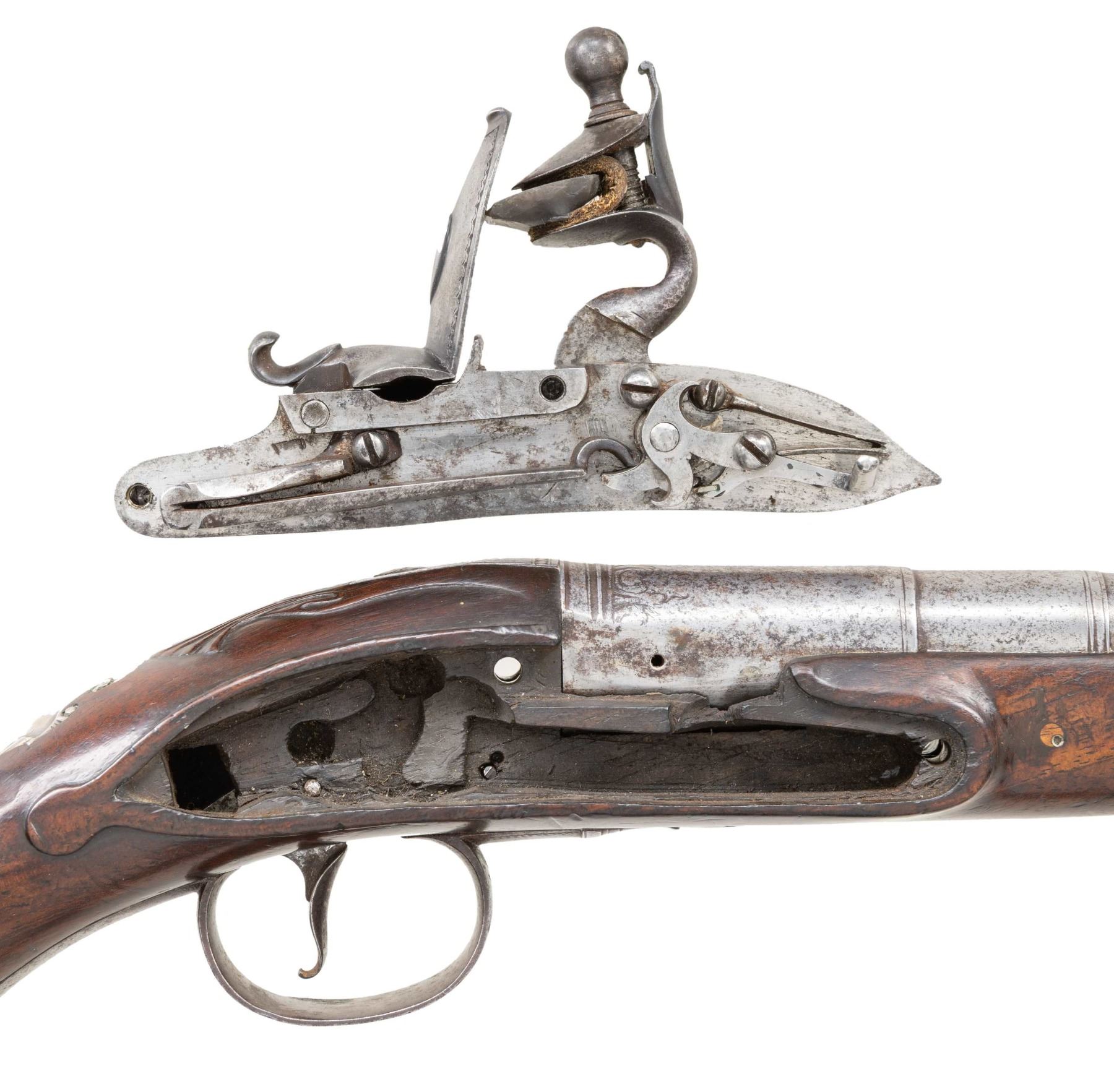 Cal. 62. NSN. Bbl. 8" round with 2 faceted transitions & a smooth bore. Semi circular blade front sight. Left side has London proof & view marks. Border line engraved lock is marked "BARBAR". Pin fastened iron fitting include top tang, flared butt cap & fancy finial long tang trigger guard. White tipped hardwood ramrod is held by a feceted iron thimble & a single faceted pipe. Silver ornamentation consists of an ornate floral ornamented pierced sideplate and a grotesque mask on the butt cap. CONDITON: metal has a cleaned gray appearance showing light pitting. Stock shows small dents & handling marks. Lock is sound with stiff trigger pull. Lightly pitted bore. PROVENANCE: Estate Collection of Nicholas Apergis. (01-27553/DS). ANTIQUE. $1,000-1.500.