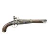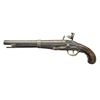 PISTOL. Cal. 69. NSN. Butt cap is engraved “Lt. R.P.F./Battalion Orleans”. 1st Lieutenant & Adjutant R. Prosper Foix fought under General Andrew Jackson at the Battle of New Orleans, Jan 8, 1815. Bbl. 11 1/2” w/ smoothbore & brass bead front sight. Reconversion lock has partially obscured Dutch marking that may be “Fokken/a Utiecan”? Walnut stock has a replacement iron band leading to replaced tip section w/ iron nose cap. Replacement wood ramrod. Brass fittings consist of trigger guard, side plate & butt cap. CONDITION: metal has gray brown coloration w/ areas of deep pitting. Stock shows very heavy wear w/ added finish over handling marks having cracks & chips in lock & side plate area w/ a section of replaced wood on right side forward of lock. Entire front section of stock is replacement. Functioning lock. Dark pitted bore. (01-23032/DS). ANTIQUE. $2,000-4,000.