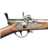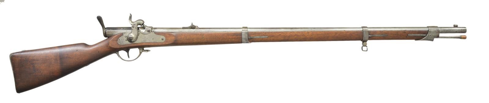 Cal. 13.9mm. S# 52637. Bbl. 37". Franco Prussian War era Bavarian breechloading rifle converted from an earlier muzzleloader. Matching numbers on breech, stock & bbl. Lock has A. Francotte Liege markings, 1861 & 1873 dates. Flip up rear sight & blade front sight. Walnut stock w/ three bands. Bottom mounted sling swivels. Brass tipped ramrod. CONDITION: walnut stock appears lightly sanded w/ scattered handling wear & light dings. Metal is a gray patina w/ scattered oxidation & light dings. Good bore w/ strong rifling but a few spots of pitting. PROVENANCE: From the Raymond Darida Estate. (01-22227/MJC). ANTIQUE. $700-1000.