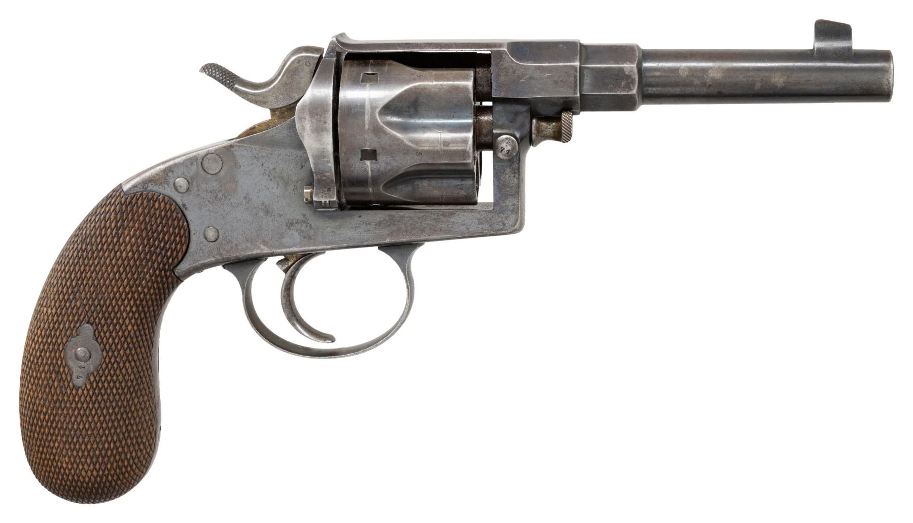Cal. 11m German Ordnance. S# 371s. Bbl. 4 1/2". Blade front sight. Fixed rear sight. Cyl. appears unnumbered but other visible numbers are matching including both grip panels. Revolver appears to be an undated commercial single action example with "GF" Bavarian marking on left of bbl. Left of bbl. has "VCS & CGH SUHL" markers markings. Grip frame has two Imperial German crown markings but no unit markings. Commercial type blue finish. Checkered walnut grips. Underside of grip has plugged lanyard hole with faded touch up blue. CONDITION: grips show handling wear, checkering point wear & some staining. Metal retains 40% original blue with overall fading to gray, some light oxidation, handling marks, edge & operational wear. Safety not engaging & loading gate appears a bit loose but action is otherwise functional when hand cycled. Bore shows scattered oxidation & frosting but strong rifling. (25-5427/MJC). CURIO. $1,500-2,250.