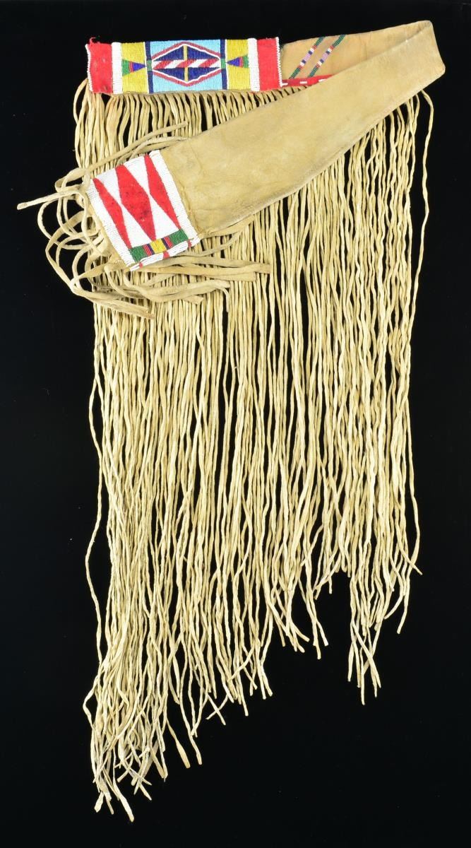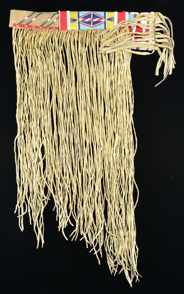 41" Overall w/ long, over 25', rawhide strip decoration. Fully beaded throat & tip w/ red trade cloth trim. CONDITION: very good overall, supple. (02-16220-3/JS). $400-600.