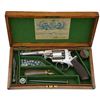 Cal. 44. S# B20341. Bbl. 5 2/4" octagon is integral w/ solid top strap frame. Top strap is marked "Robert Adams, 76 King William Street, London". Left bbl. flat is marked "L.A.C.". Left side of bbl. & frame is fitted w/ a Kerr patent rammer. Right side of frame is marked "Adams Patent No. 3690. R." below S#. Five shot round cyl. has matching S#. Cyl. & right side of bbl. have crown over V & crown proofs. Right side of frame is fitted w/ a bolt style safety. Silver finish. 1 piece checkered walnut grip w/ steel buttcap. The Beaumont Adams revolver was used by the British Army until 1880 & by both Confederate & Union forces during the American Civil War. UNATTACHED ACCESSORIES: English Trade casing w/ green felt fitted interior. Interior of lid has retailer label marked "B Coswell". Case contains powder flask, bullet mold, oil bottle, cleaning rod w/ accessories, bullet tin & round balls. Case has added finish over wear & handling marks. CONDITION: 80% silver finish acquiring a tarnish. Hammer shows pitting. Grips have moderate wear. Action cycles properly. Cyl. has substantial side play. Bore retains sound rifling showing spots of pitting. (01-25230/DS). ANTIQUE. $2,500-3,000.
