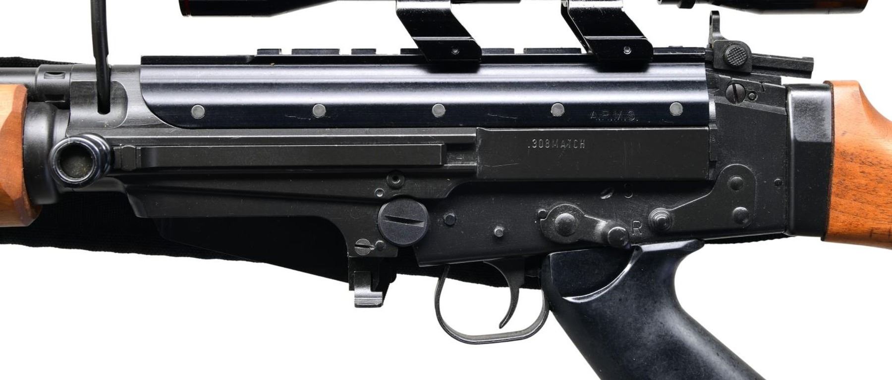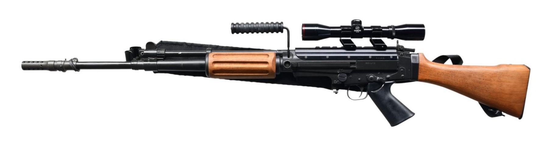 FACTORY BOX. Cal. 308. S# 2507834. Bbl. 23.25" over 3.25" flash hider. Early, original Fabrique Nationale Herstal FN FAL. This is 1 of the more desirable examples of this rifle that has been referred to as "the right arm of the free world". Traditional black painted finish on exposed metal surfaces. Wood buttstock w/ steel hinged shoulder plate. Plastic pistol grip, heavy wood forend. Protected post front sight along w/ rear peep sight adj. in elevation from 200m to 600m. Upper receiver left side stamped "308 MATCH". Right side markings include: "Fabique Nationale Herstal / Made in Belgium / Steyr Secaucus NJ / Gunsouth Birmingham AL". S# also resides on right side. Top cover has 7" Weaver style scope base, currently sporting O/U rings & Simmons 4x32 scope w/ duplex reticle. This extremely popular & effective rifle has a carry handle, adj. gas system, as well as sling swivels front & rear, currently sporting black nylon Springfield sling. Utilizes metric style mags. UNATTACHED ACCESSORIES: original cardboard shipping box. CONDITION: All aspects indicate very little use. Finish coverage on exposed metal surfaces are complete & consistent, w/ the only thinning on a small spot on the gas tube, from rubbing on something. Wooden buttstock & forend are attractive reddish stain w/ very few tiny impressions. Pistol grip has typical handling scratches. Scope glass clear w/ sharp reticle. Bright bore w/ strong rifling. Fire control mechanism appears to function correctly when cycled by hand. PROVENANCE: Lifelong Collection of Terrence McCarty. (24-505/JZ). MODERN. $1,200-1,800.