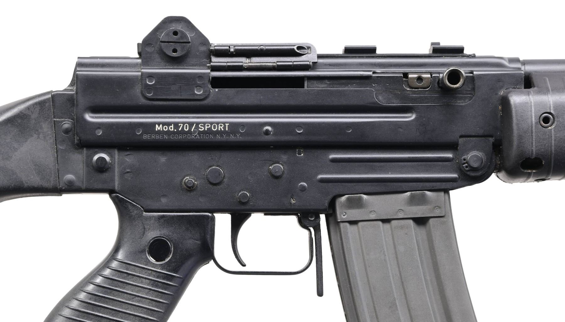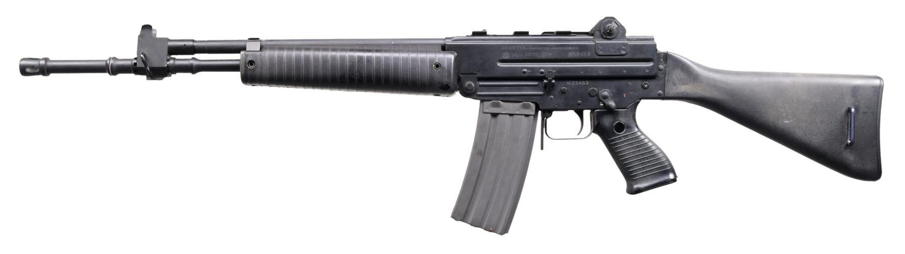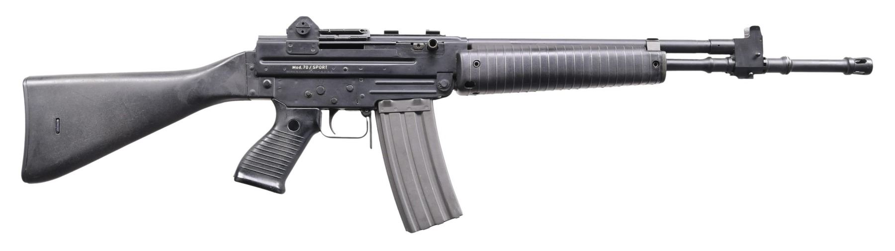 Cal. 223. S# M33463. Bbl. 19". The Beretta AR/70 rifle is an Italian offering designed by Vittorio Valle and introduced in 1970. Its development followed a joint study between Beretta & SIG that commenced in 1963 and was terminated in 1968. Beretta had tried to negotiate a contract w/ Colt to manufacture the M16 in Italy as well, but when it became clear that the firms would not be working together, Beretta started to aggressively market their own offering. They studied several gas & locking systems and ended up utilizing a conventional gas piston & recoil spring system, located above the barrel, & a twin lug locking system similar to those used at the time in the M2 Carbine & several Kalashnikov rifles. This variant has a matte black finish on all outward components. Protected post front sight. Dual aperture rear peep sight, marked at 150 meters & 300 meters. Left side controls. Right side, reciprocating charging handle. Black plastic pistol grip. Black plastic shoulder stock. Sling swivels front & rear on left side. Left side of receiver marked "BERETTA - PATENTED - MADE IN ITALY / MOD. AR70, 223" w/ matching serial number on upper and lower receivers. Right side marked "MOD. 70 / SPORT / BERBEN CORPORATION, N.Y. N.Y.". MAGS: 1 factory 30 rd. CONDITION: All aspects indicate very little use, if any. Shoulder stock demonstrates some evidence typical of vertical rack storage in the form of light drag lines. Finish remains complete & consistent. Bright bore w/ strong rifling. Fire control mechanism appears to function correctly when cycled by hand. PROVENANCE: Lifelong Collection of Terrence McCarty. (24-564/JZ). MODERN. $3,000-5,000.