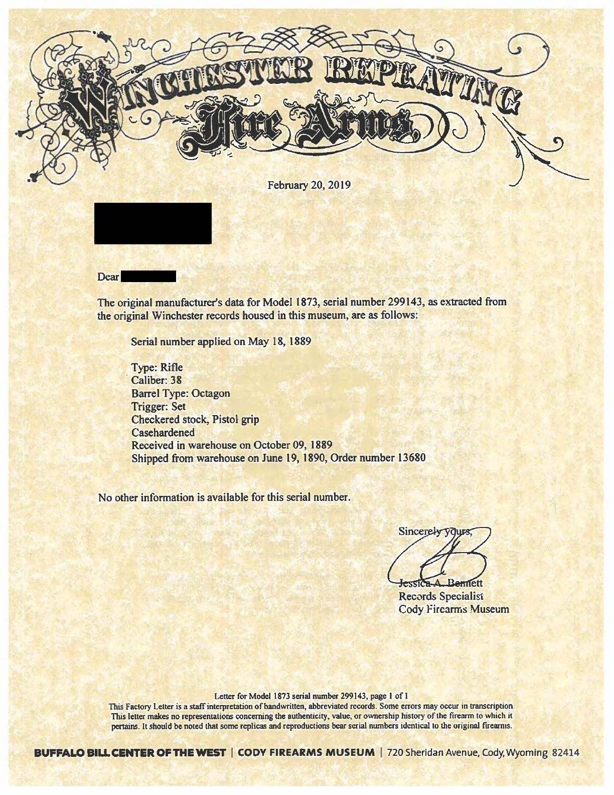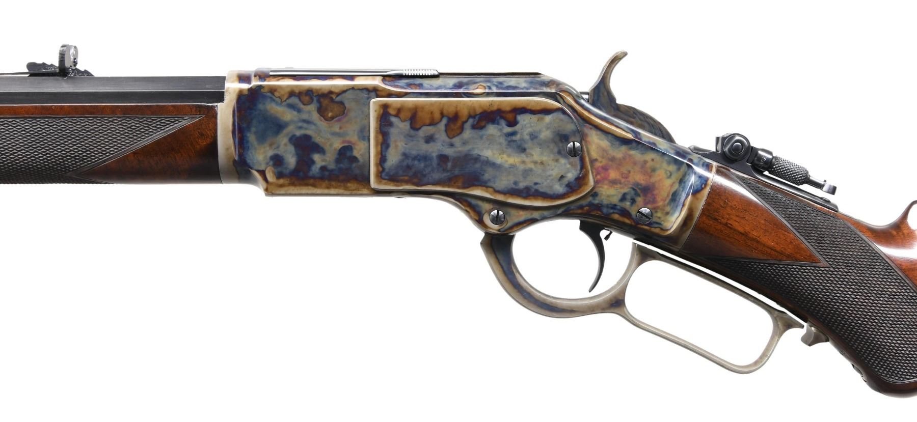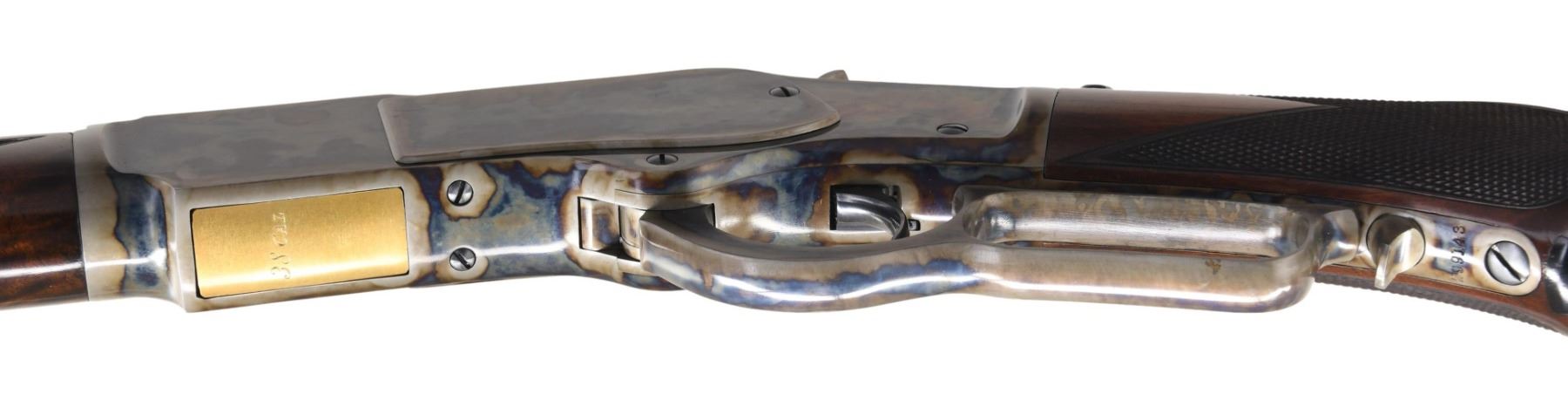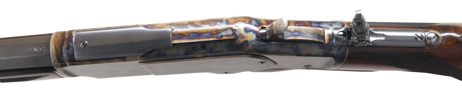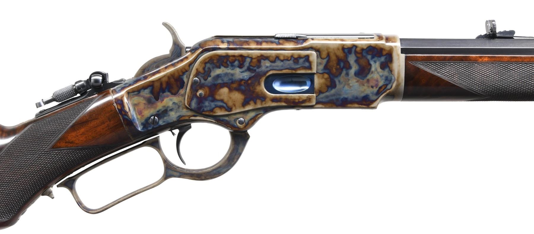 MODEL LEVER ACTION RIFLE. Cal. 38 WCF. S# 299143. We have here, an original deluxe 1873 third model that has been masterfully brought back to life by Turnbull Restoration in what can only be described as a preservation of American firearms manufacturing history. Bbl. 24" octagon With Lyman flip up globe front sight & semi buckhorn rear. Lyman no. 1 tang sight. Color case hardened receiver, hammer, lever, forend cap & trap buttplate. Blued bbl. & full length mag tube. Single set trigger. Nitre blued loading gate. Checkered pistol grip ebony tipped buttstock & forend of select XXX walnut. UNATTACHED ACCESSORIES: original 4 piece Winchester cleaning rod housed in butt trap. Turnbull Restoration invoice detailing work performed in February 2020 which, at that time, totaled nearly $5,000. Winchester Factory Letter stating the following: "Type: Rifle / Caliber: 38 / Barrel Type: Octagon / Trigger: Set / Checkered stock, Pistol grip / Casehardened / Received in warehouse on October 09, 1889 / Shipped from warehouse on June 19, 1890 Order number 13680." CONDITION: near excellent overall as professionally restored. Bore has lightly frosted appearance with sharp rifling. (01-25980/BH). ANTIQUE. $9,000-13,000.