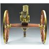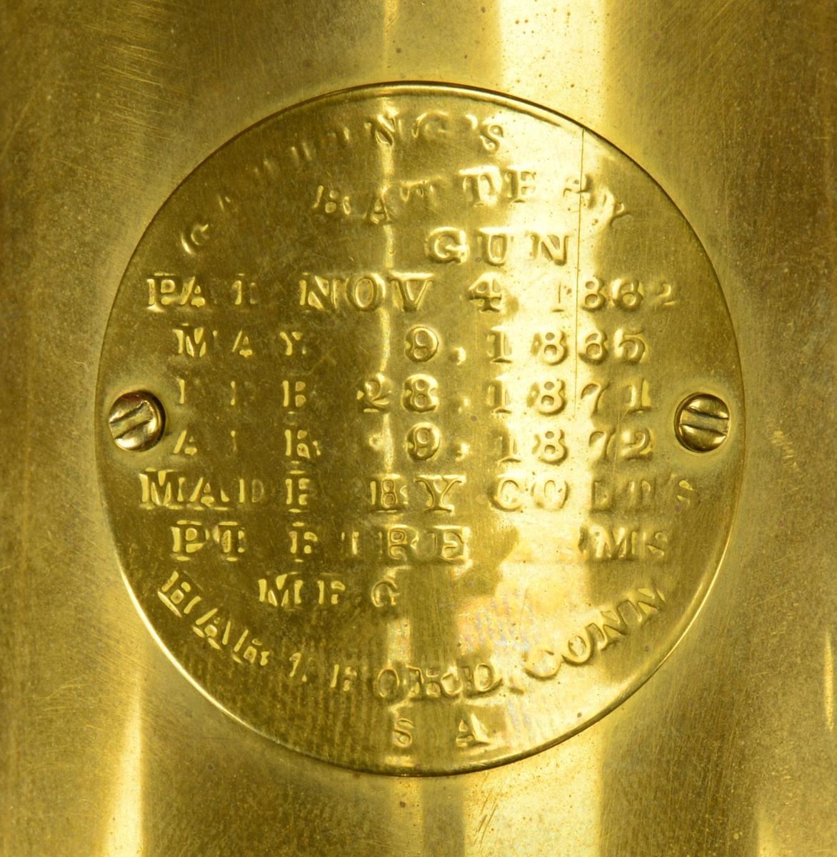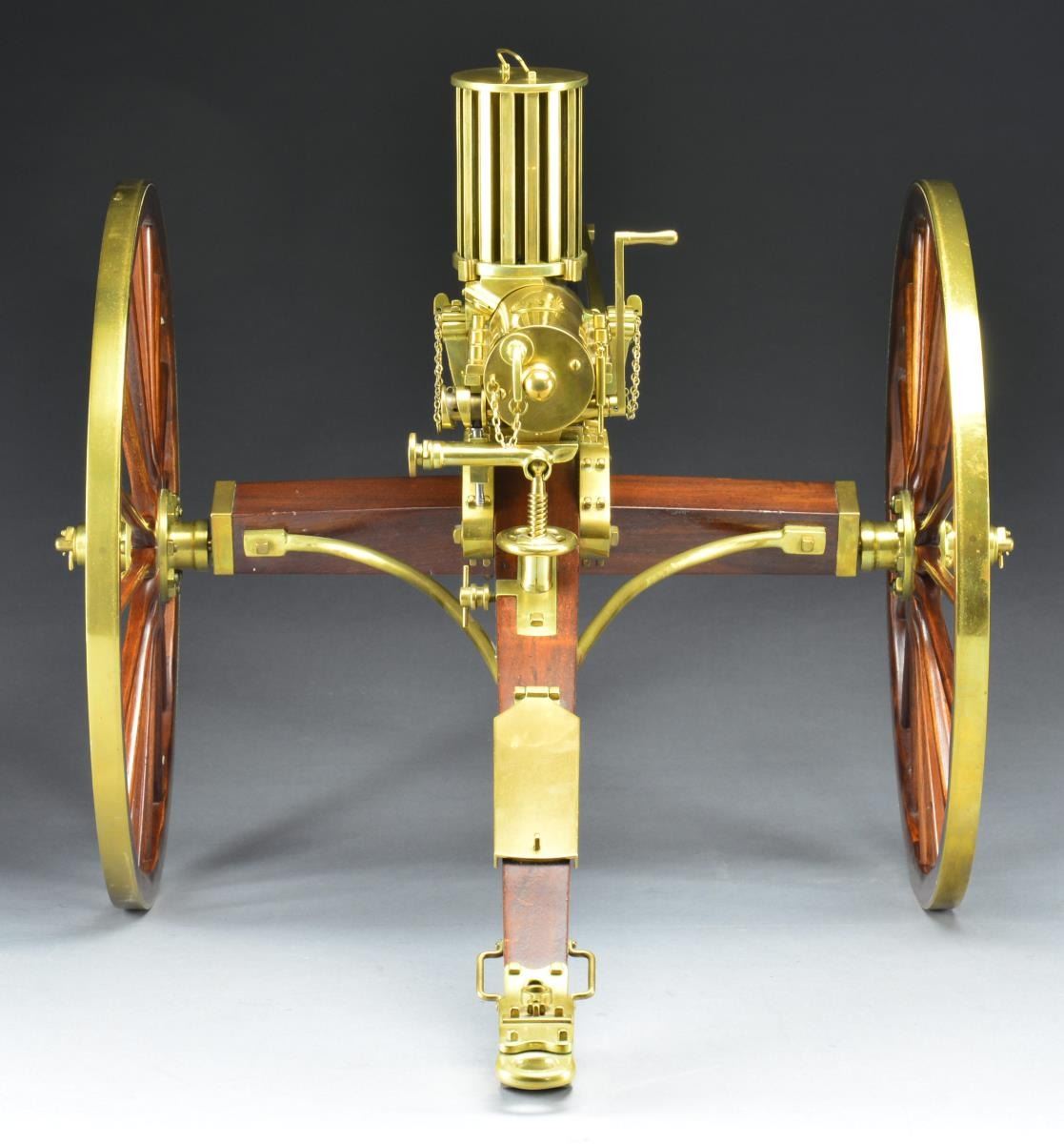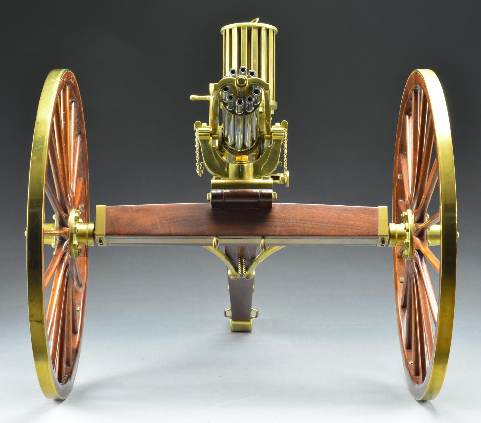 Cal. 22 Short. S# 174. Mfg. Furr Arms. Every so often an item transcends it original purpose & blurs the lines between form & function. The knowledge, passion, materials & time all work together in sync to bring forth a work of art where its beauty is only matched by it's mechanical perfection. There are very few items that fall into this category but the Furr Arms Gatling Guns are solidly at the top of that list. Each piece manufactured & assembled by hand from intricate detailed parts cast in their own private foundry. The Furr Arms Gatling is as comfortable in the category of artistic beauty as it is a mighty machine. The concept of manufacturing these scale model Gatlings was born in 1968 as a challenge from a neighbor & grew into these works of art as we are familiar w/ today. Requiring hands on, fitted precision from pouring the molten brass to final fit & finish, each gun requires approx. 250 hours to complete. The final result is a ballet of nickel plating, polished brass & meticulously treated black walnut capable of firing at rates up to 700 rds. per minute. This particular example the 1874, feeds from its custom 220 rd. Broadwell drum & rests atop its select walnut, brass trimmed carriage complete w/ a functioning traverse & elevation mechanism. This work of art measures 24" in width & approx. 40" in length & weighs in at a whopping 50 lbs. Even though this exotic arm boasts a fast firing rate, it is not considered a machine gun under federal law but simply a "firearm". Aside from any specific draconian state law all that is required to purchase is a standard BATF form 4473. MAGS: 220 rd. Broadwell Drum. This gun was originally sold for $8000.00. UNATTACHED ACCESSORIES: copies of catalogs & instructions for cleaning, along w/ invoice dated 5/20/1983 from Safari Outfitters. CONDITION: the brass is golden colored w/ the patina one would expect to see. The nickel plated bbls. are shiny & outwardly free of any visible defects. The carriage presents a few scattered impressions though it is difficult to tell which ones are intentional to meet the desired look. The brass trimmed walnut wheels & spokes exhibit some gentle finish thinning & no apparent structural issues are visible & everything is solid. Bores are shiny w/ proper rifling. Fire control mechanism appears to function correctly when cycled by hand. PROVENANCE: Estate Collection of Kenneth Horn (Grandson of JC Higgins). (22-491/JZ). MODERN. $7,000-10,000.