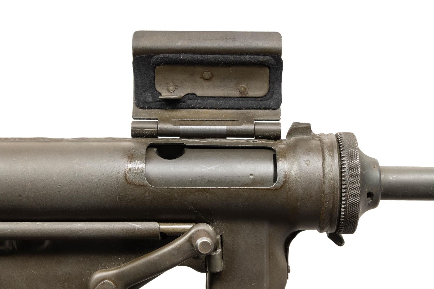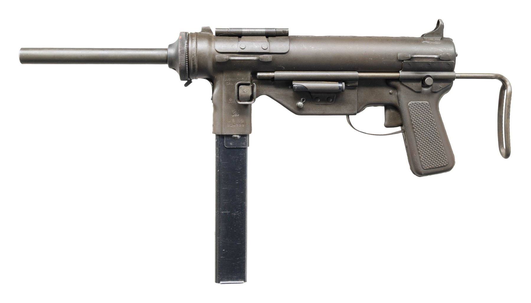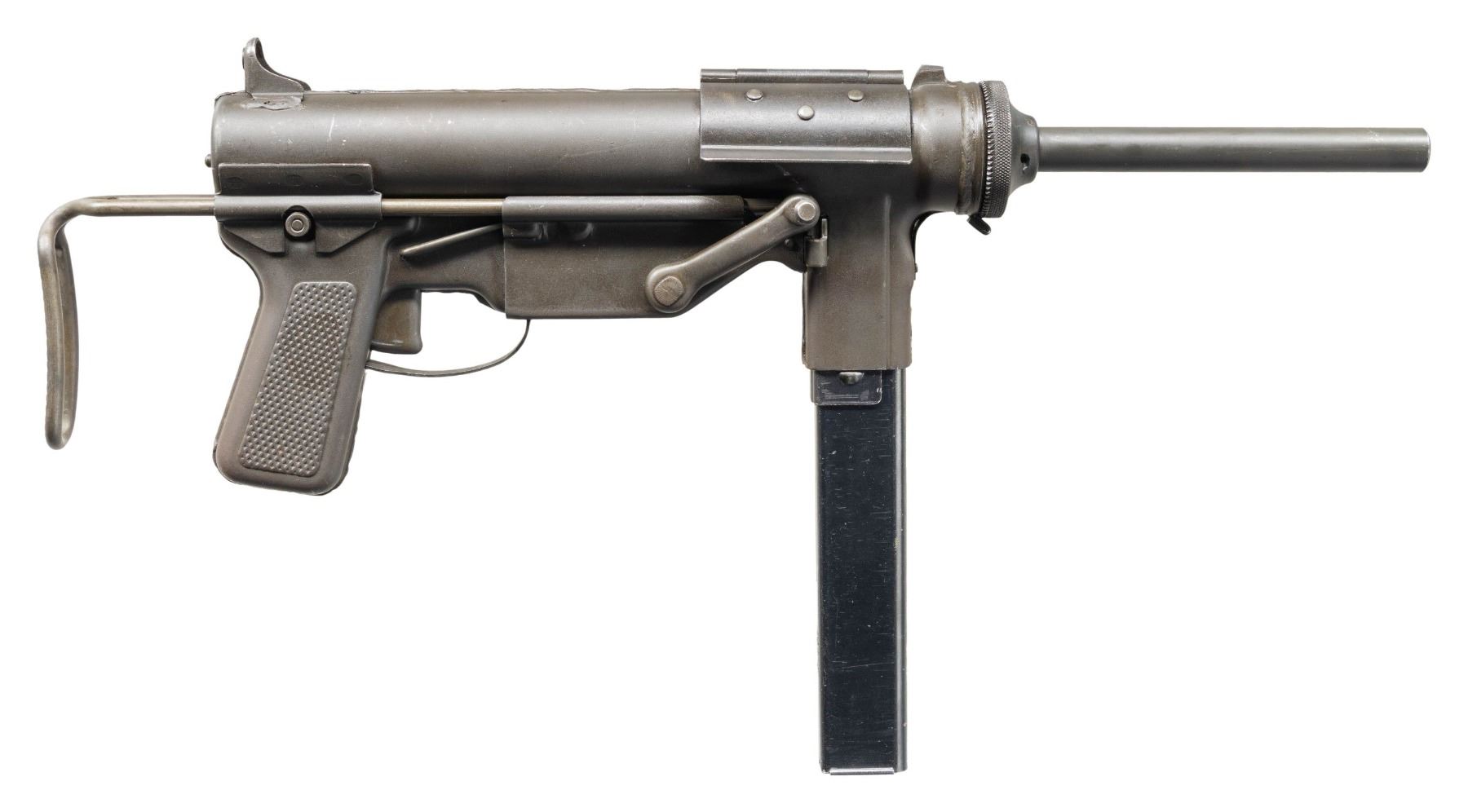 GREASE GUN SMG, ONCE OWNED BY DAVID "CARBINE" WILLIAMS. FULLY TRANSFERABLE, CURIO. Cal. 45 ACP. S# 314358. Bbl. 8". A fabulous piece of history, manufactured for the U.S. Military, & once owned by David Marshall "Carbine" Williams. The M3 grease gun was first adopted by the United States military in the early 1940's. During WWII, the general motors corp., Guide Lamp division, produced just under 650,000 M3 & M3-A1 grease guns. Unlike 45 ACP SMGs at the time, the grease gun was intended to be mass produced w/ very loose tolerances ensuring fit & function over multiple platforms. Guns available prior to the introduction of the grease gun, such as the Thompson SMG & Reising, were complicated & expensive to manufacture w/ several machined parts & a lot of necessary hand-fitting. The grease guns design is a simple blow back operated, open-bolt firing mechanism utilizing a tubular receiver which was far less expensive & much easier to manufacture in lg. numbers. The original M3, such as this example, was cocked by utilizing a spring loaded lever mounted on right side, rear of the mag. well. The M3-A1 model, was simplified even more by removing the necessity of a cocking lever, substituting a slot cut into the bolt & operated by the finger of the shooter to perform the same task. This particular example is a transferable SMG mfg. by Guide Lamp Division of General Motors Company. The dust cover serves two purposes: one, as the name indicates is to keep foreign debris from entering the ejection port w/ the secondary purpose of proving a sort of safety by means of obstructing the bolt from moving when in use. All exposed metal surfaces are parkerized. Front sight is fixed, exposed blade. Rear sight is a non adj. peep. 2-Position telescoping wire buttstock. Left side markings include "SUB-MACH GUN / CAL .45 M3 / GUIDE / U.S. NO. / 314358" on mag-well, w/ crossed cannon ordnance mark. Left side, push button mag release has folded sheet metal guard to prevent unintentional activation. MAGS: 1 steel 30 rd. UNATTACHED ACCESSORIES: 9mm conversion kit, including bolt, barrel. Bolt stamped "9mm RIA" & "GL", & mag well adapter. Cone style slip on flash hider. CONDITION: parkerized finish retains complete coverage w/ only light handling & operational wear. Bolt travel is smooth properly engages dust cover mechanism. Collapsible stock works smoothly & locks correctly in every position. Bright bore w/ visible rifling in both barrels. Fire control mechanism appears to function correctly when cycled by hand. NATIONAL FIREARMS ACT MG REQUIRING BATF TRANSFER BEFORE TAKING POSSESSION. FULLY TRANSFERABLE. PROVANANCE: Includes letter from Ross " REV" E. Beard, Jr., author of the book; "CARBINE - The Story Of David Marshal Williams" written to Rhett Taber, explaining his relationship w/ Mr. Williams and this gun, named by serial number was given to him as a gift by Carbine Williams, who was pivotal in the design of the M1 Carbine. (03-1919/JZ). CURIO CLASS III. $20,000-30,000.