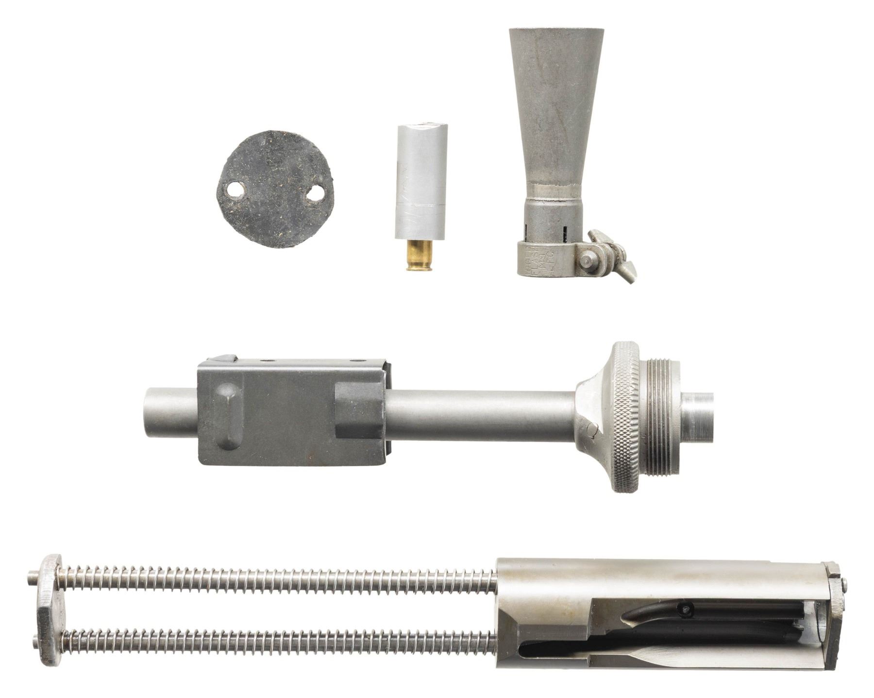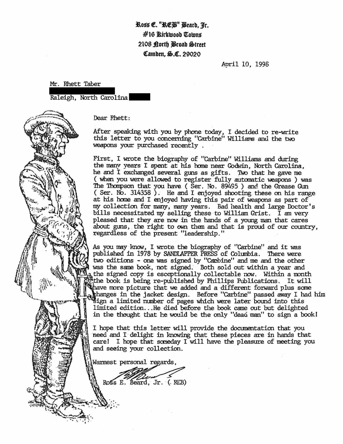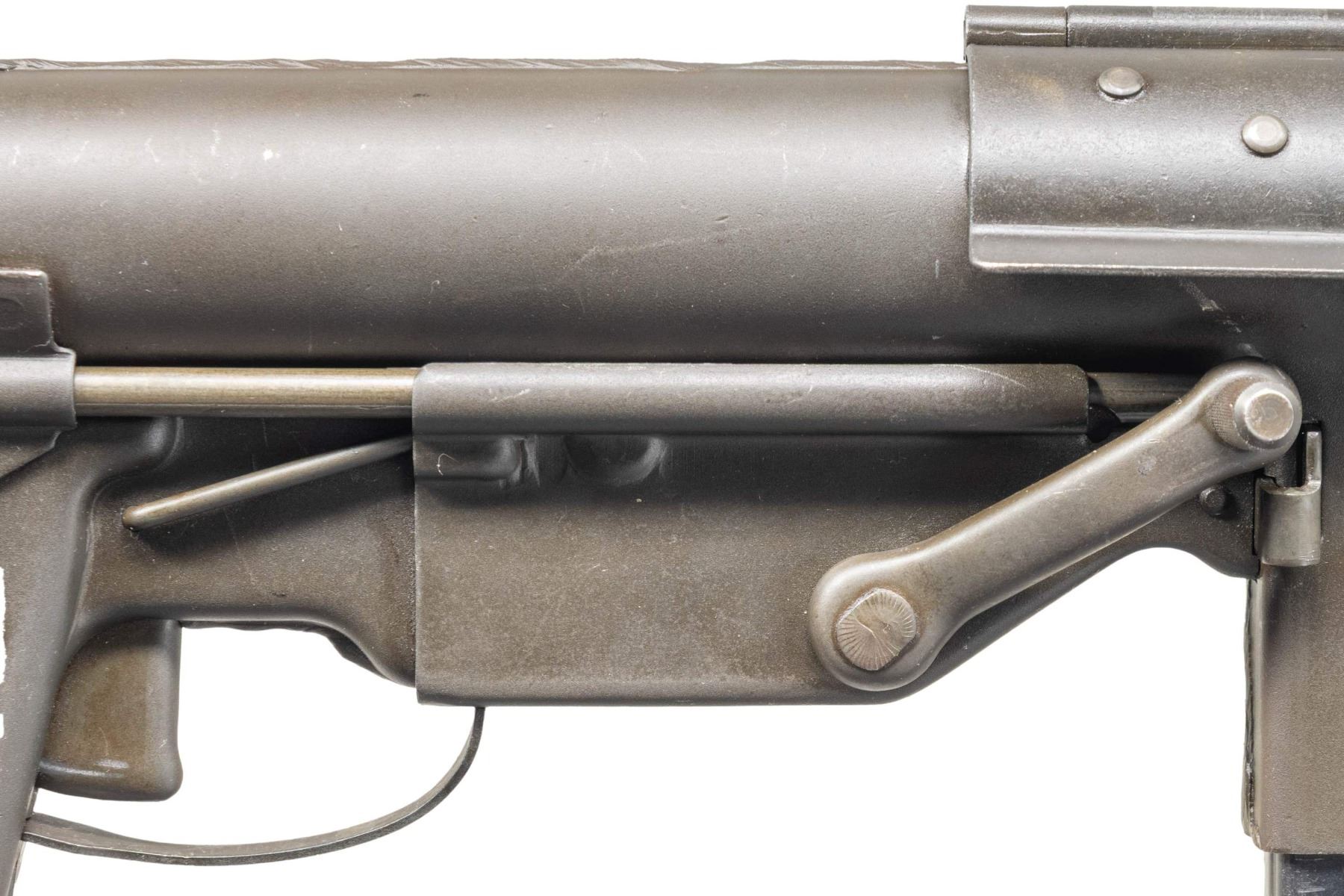 GREASE GUN SMG, ONCE OWNED BY DAVID "CARBINE" WILLIAMS. FULLY TRANSFERABLE, CURIO. Cal. 45 ACP. S# 314358. Bbl. 8". A fabulous piece of history, manufactured for the U.S. Military, & once owned by David Marshall "Carbine" Williams. The M3 grease gun was first adopted by the United States military in the early 1940's. During WWII, the general motors corp., Guide Lamp division, produced just under 650,000 M3 & M3-A1 grease guns. Unlike 45 ACP SMGs at the time, the grease gun was intended to be mass produced w/ very loose tolerances ensuring fit & function over multiple platforms. Guns available prior to the introduction of the grease gun, such as the Thompson SMG & Reising, were complicated & expensive to manufacture w/ several machined parts & a lot of necessary hand-fitting. The grease guns design is a simple blow back operated, open-bolt firing mechanism utilizing a tubular receiver which was far less expensive & much easier to manufacture in lg. numbers. The original M3, such as this example, was cocked by utilizing a spring loaded lever mounted on right side, rear of the mag. well. The M3-A1 model, was simplified even more by removing the necessity of a cocking lever, substituting a slot cut into the bolt & operated by the finger of the shooter to perform the same task. This particular example is a transferable SMG mfg. by Guide Lamp Division of General Motors Company. The dust cover serves two purposes: one, as the name indicates is to keep foreign debris from entering the ejection port w/ the secondary purpose of proving a sort of safety by means of obstructing the bolt from moving when in use. All exposed metal surfaces are parkerized. Front sight is fixed, exposed blade. Rear sight is a non adj. peep. 2-Position telescoping wire buttstock. Left side markings include "SUB-MACH GUN / CAL .45 M3 / GUIDE / U.S. NO. / 314358" on mag-well, w/ crossed cannon ordnance mark. Left side, push button mag release has folded sheet metal guard to prevent unintentional activation. MAGS: 1 steel 30 rd. UNATTACHED ACCESSORIES: 9mm conversion kit, including bolt, barrel. Bolt stamped "9mm RIA" & "GL", & mag well adapter. Cone style slip on flash hider. CONDITION: parkerized finish retains complete coverage w/ only light handling & operational wear. Bolt travel is smooth properly engages dust cover mechanism. Collapsible stock works smoothly & locks correctly in every position. Bright bore w/ visible rifling in both barrels. Fire control mechanism appears to function correctly when cycled by hand. NATIONAL FIREARMS ACT MG REQUIRING BATF TRANSFER BEFORE TAKING POSSESSION. FULLY TRANSFERABLE. PROVANANCE: Includes letter from Ross " REV" E. Beard, Jr., author of the book; "CARBINE - The Story Of David Marshal Williams" written to Rhett Taber, explaining his relationship w/ Mr. Williams and this gun, named by serial number was given to him as a gift by Carbine Williams, who was pivotal in the design of the M1 Carbine. (03-1919/JZ). CURIO CLASS III. $20,000-30,000.