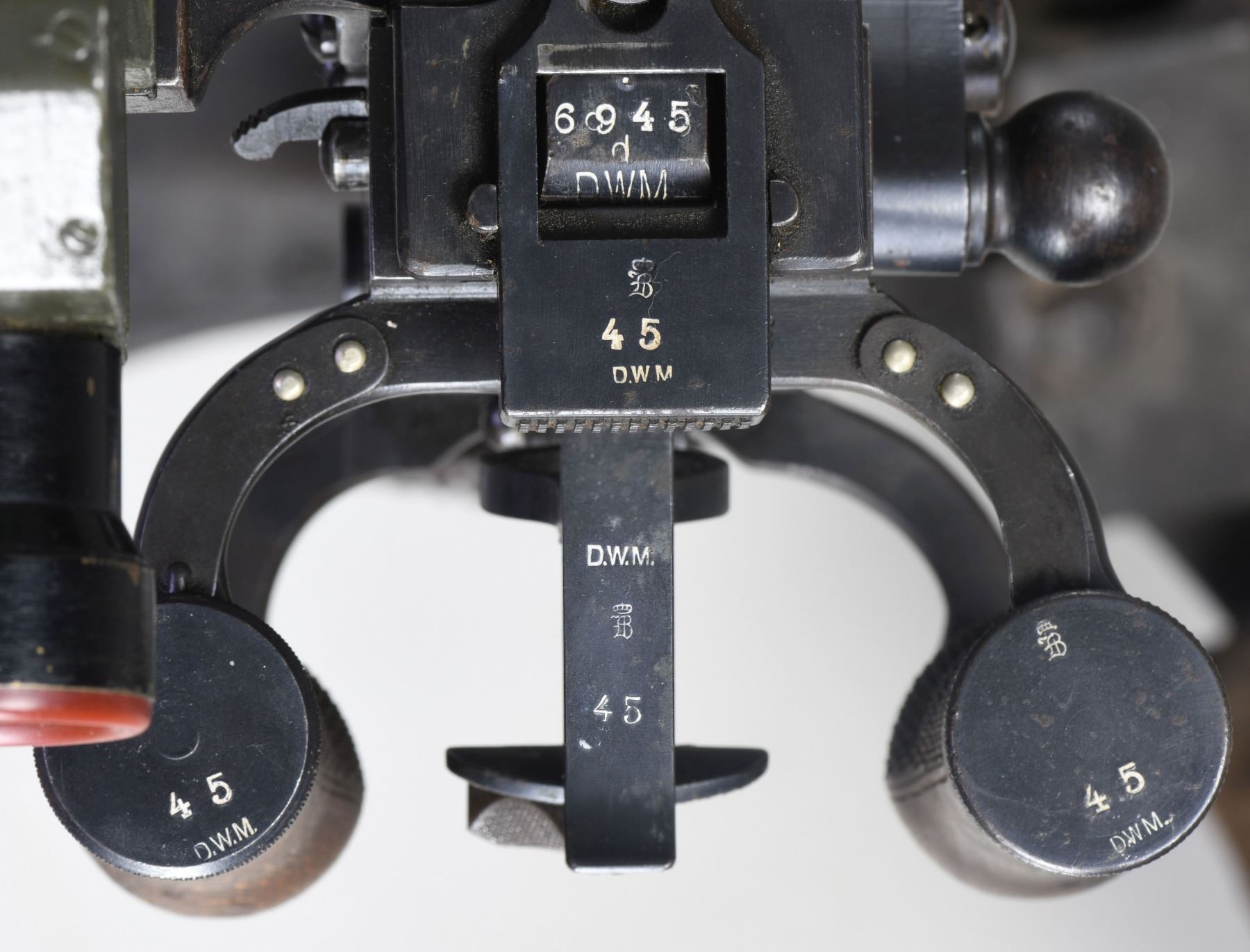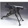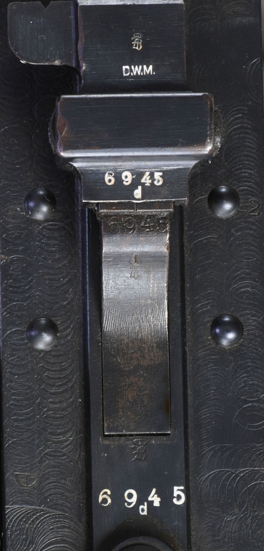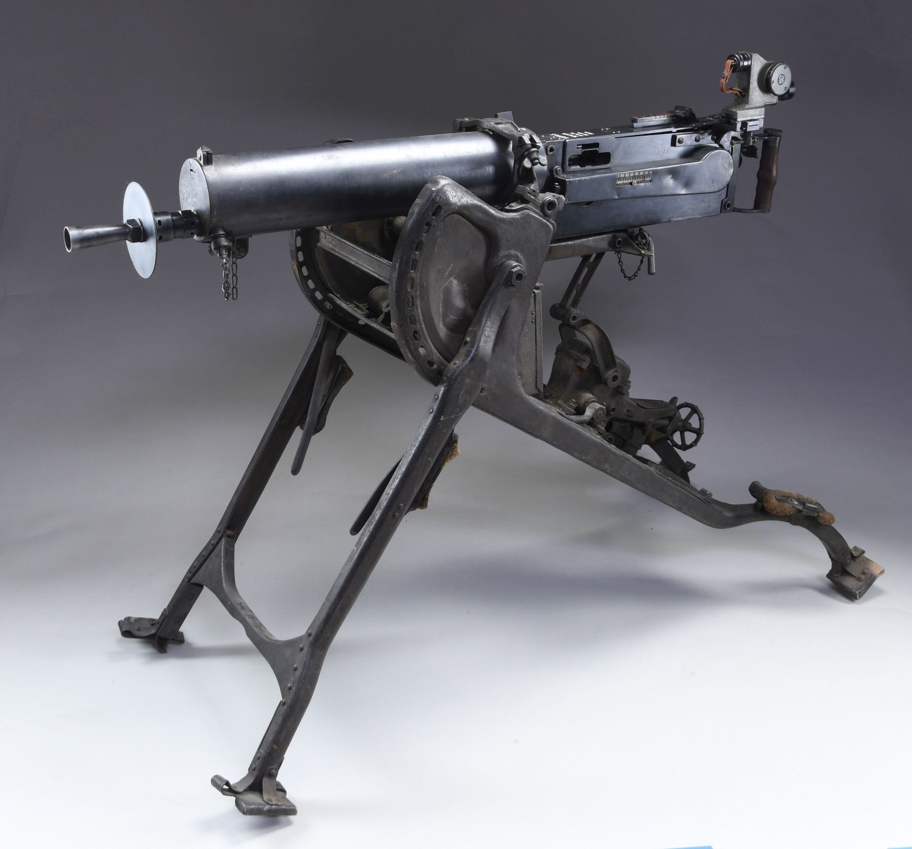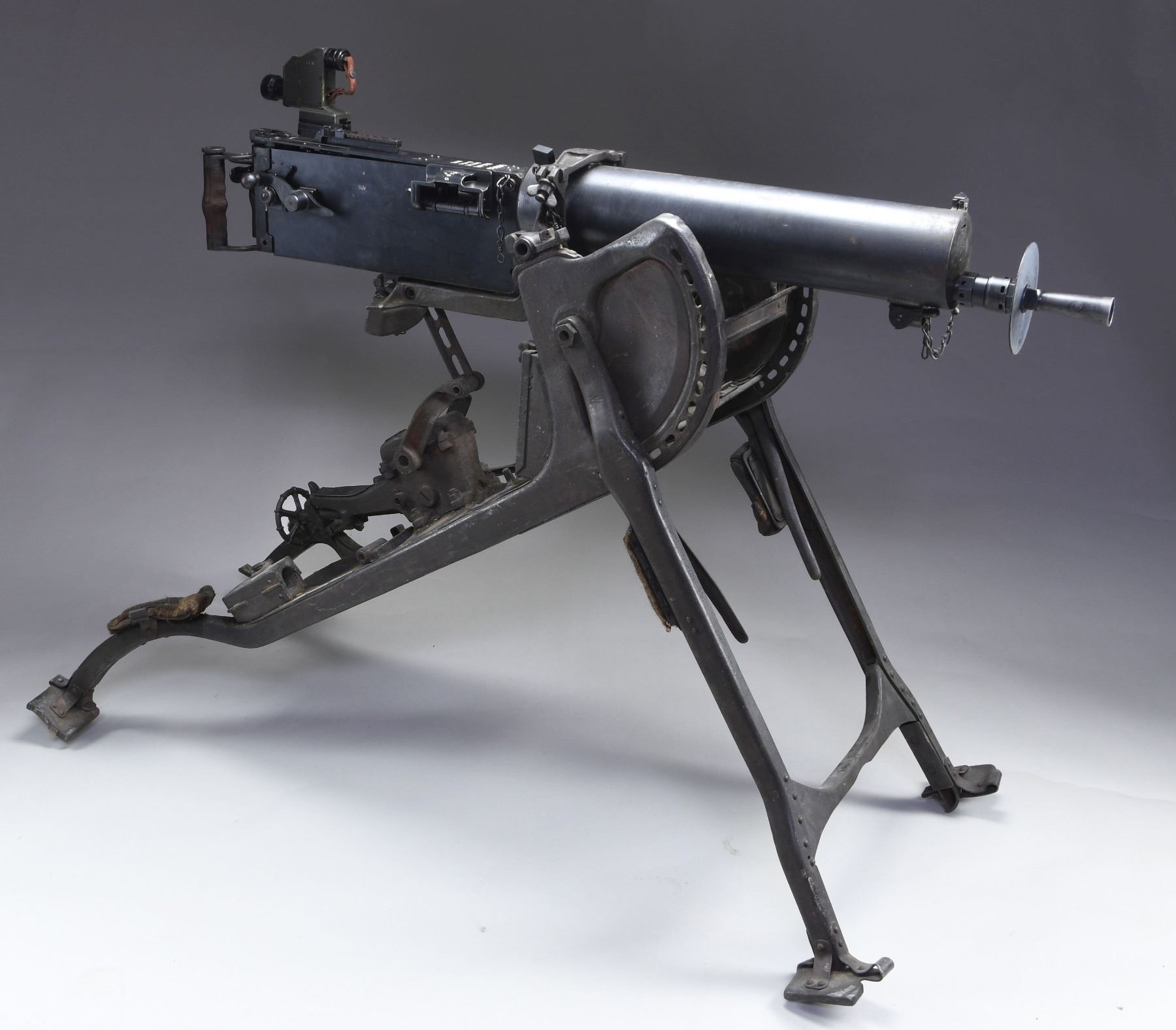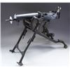 ON ORIGINAL SLED MOUNT WITH OPTICS. CURIO. Cal. 8mm. S# 46945. Bbl 30". This MG08 Maxim was mfg. by D.W.M. in Berlin in 1918. Items that correspond matching the original S# in some variation of 46945, including parts as they get smaller dropping numbers off to become shorter & fit the space including 46945, 6945, 945 & 45 consist of left side plate, top cover, bbl. jacket, sights, feed block, cocking lever, spade grip assembly & possibly others that are less clearly visible. Oil caps on spade grips are matching numbers, and thread off & on easily, retained by both present retention springs. Bolt marked 4595. Original sled mount. MAGS: 1 cloth belt w/ brass tabs, dated 1943. UNATTACHED ACCESSORIES: ZF12 Optics w/ original leather case. CONDITION: This is a beautiful example of the classic original belt-fed that started an entirely new generation of firepower. The finish is strong, consisting of bluing on sideplates, top cover, & barrel jacket. The receiver finish is as complete as any this cataloger has encountered. Everything moves fluidly and is extremely smooth. The spade grips are seldom encountered in this condition for a working firearm. Markings are filled w/ white for a striking contrast, easy to read. The oil caps are matching in numbers, and thread in and out effortlessly. The hardwood grips still retain their finger grooves and even the checkering is intact and in nice condition. The ZF12 optics appear to have the original gray / green finish on them, w/ all markings clear and intact. Bullet drop compensator is adjustable from 400m to 2000m & moves fluidly. The glass is quite clear w/ sharp reticle. Sled mount still has some of the original spare parts boxes, which are often missing. These were designed to hold extra locks, spare parts & tools. The mount, remarkably enough still retains the pads, front & rear, which are most often long gone. It has an even coat of paint that looks original. The screw drive elevation adjustment moves freely & it enjoys full adjustment. Forward water drain below bbl. jacket functions smoothly. Firing mechanism functions smoothly in all aspects & appears to function correctly when cycled by hand. Bore is bright w/ strong rifling. PROVENANCE: From the Lifelong Collection of Brian Linde. (03-1817/JZ). THIS IS A NATIONAL FIREARMS ACT CURIO & RELIC REQUIRING BATF TRANSFER BEFORE TAKING POSSESSION. FULLY TRANSFERABLE. CURIO. CLASS III. $12,000-18,000.