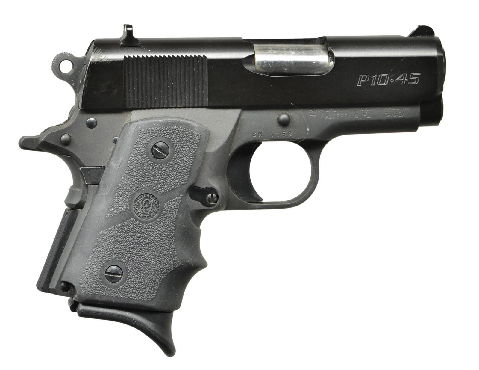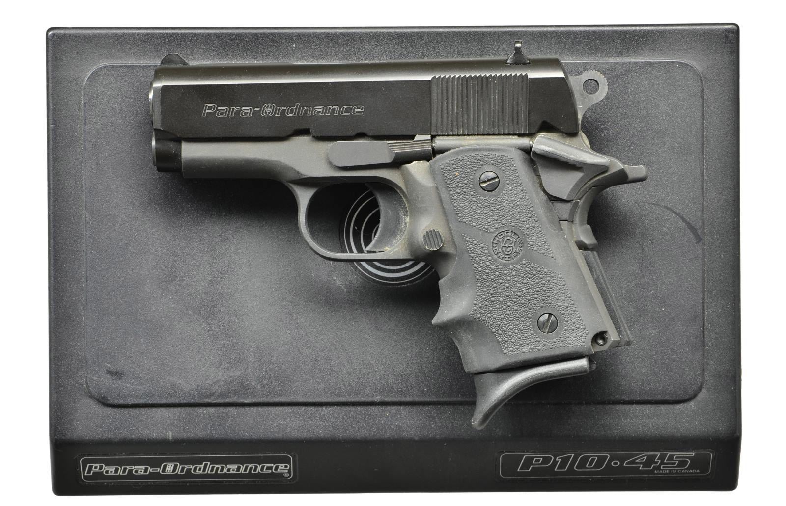 Cal. 45 ACP. S# SM1158. Bbl.3". Single action. Steel construction. The Para-Ordnance P10-45 really increases the amount of available firepower over the compact 1911 design by providing a wider frame to accept a staggered magazine holding 10 rounds, while remaining very small. Serrated slide w/ 3-dot sights. Serrated hammer spur, thumb safety, slide release & mag release. All left side controls. Matte black finish. Black rubber Hogue grips. MAGS: 3 factory 10rd. UNATTACHED ACCESSORIES: Factory black & white plastic box w/ paperwork. Factory plastic grips. CONDITION: Factory finish enjoys complete & consistent coverage, illustrating only minute thinning in some areas of mechanical intervention. Bright bore w/ strong rifling. Fire control mechanism appears to function correctly when cycled by hand. (22-3426/JZ). MODERN. $500-800