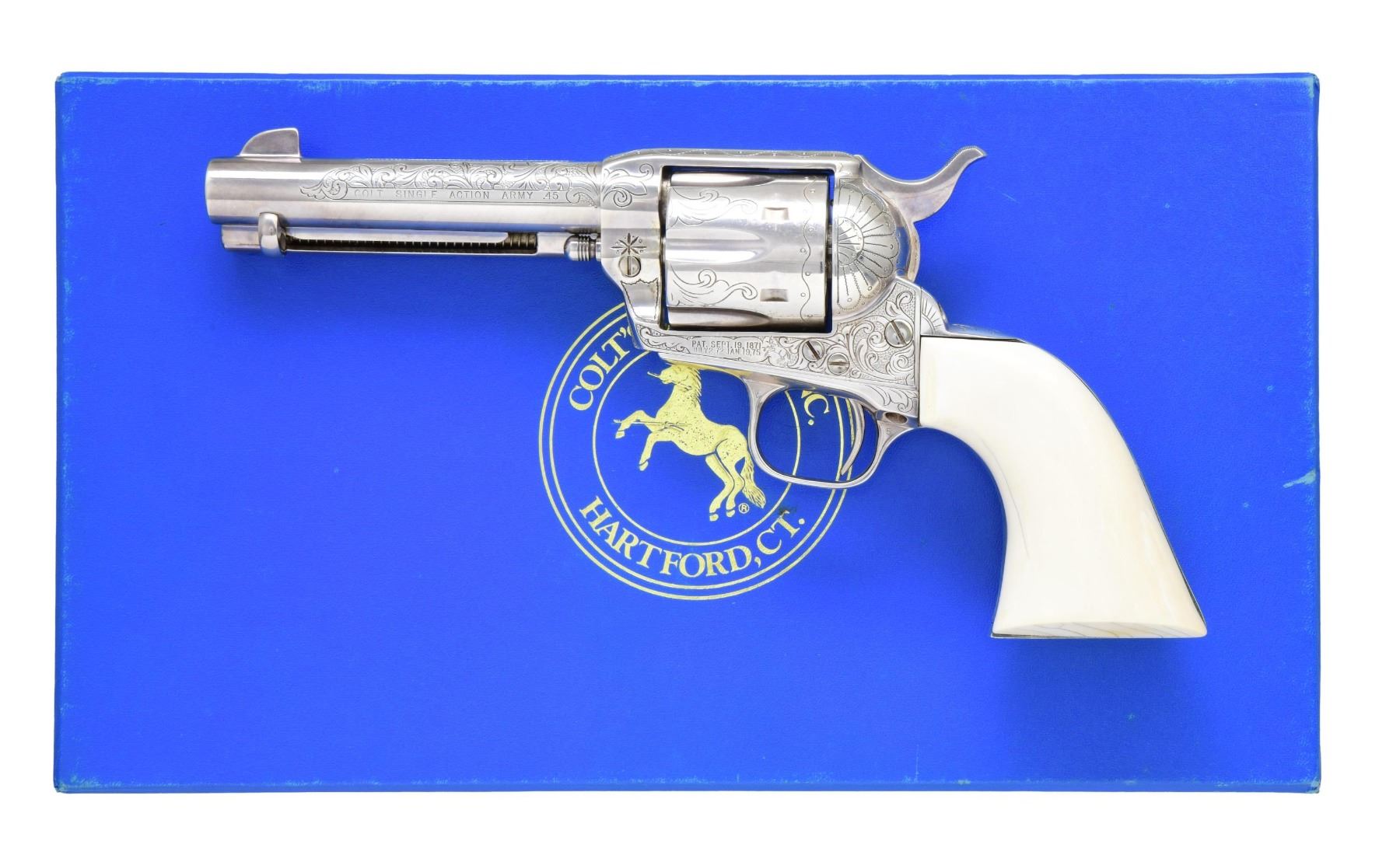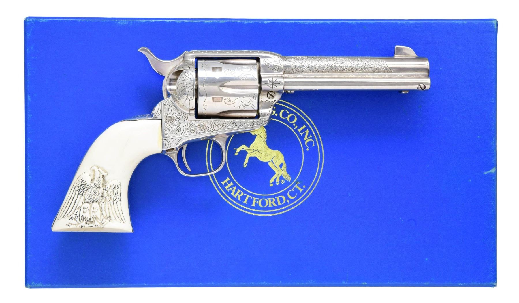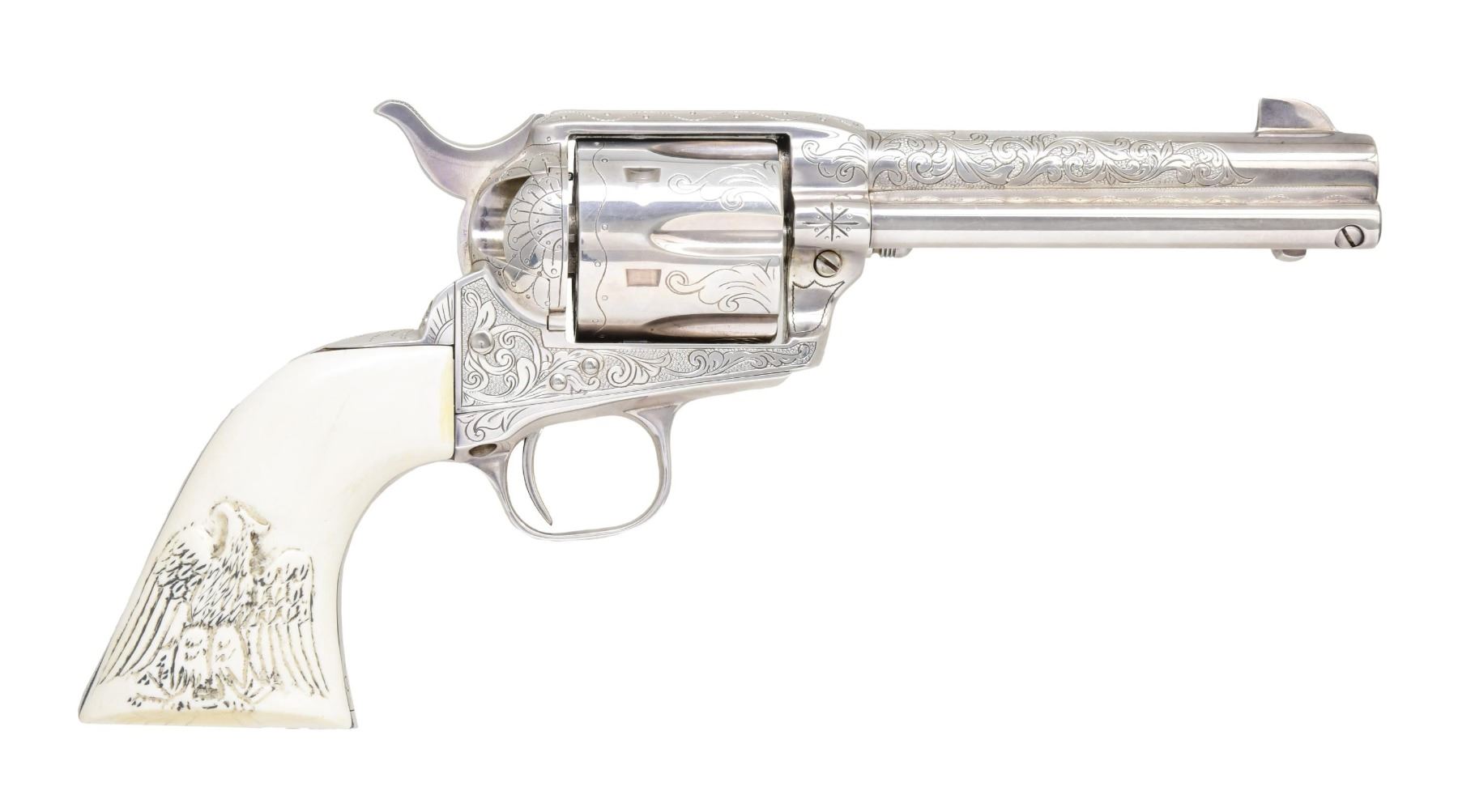ENGRAVED & INSCRIBED CUSTOM SHOP SAA REVOLVER WITH FACTORY RELIEF CARVED EAGLE GRIPS. Cal. 45 Colt. S# SA99571. Bbl. 4 3/4" with blade front sight. Mfg. 1993. Revolver features full coverage silver plated finish with factory "C" style engraving. Inscription on backstrap reads "Jas. E McGee". 6 Shot fluted cyl. Smooth white grips have relief carved eagle on right panel. UNATTACHED ACCESSORIES: 2 piece blue custom shop box with foam inserts and original paperwork. White shipping sleeve with matching end label. CONDITION: Overall near excellent. Metal retains 99% original silver finish with faint area of minor freckling on cyl. Grips are near excellent. Bright bore with crisp rifling. (24-2126/BH). MODERN. $7,000-10,000.
