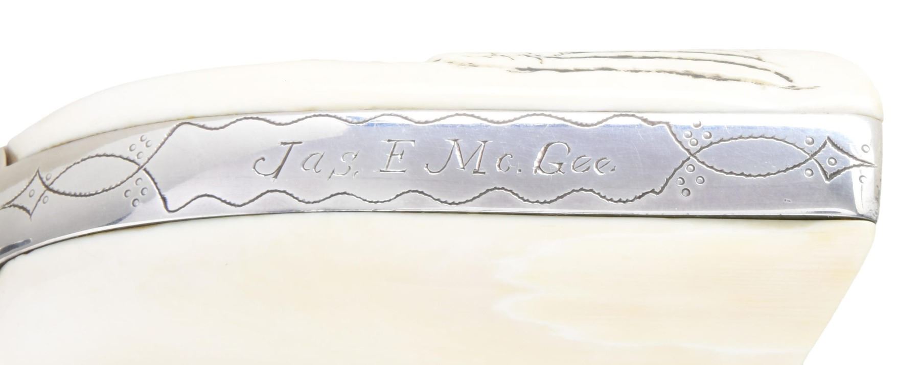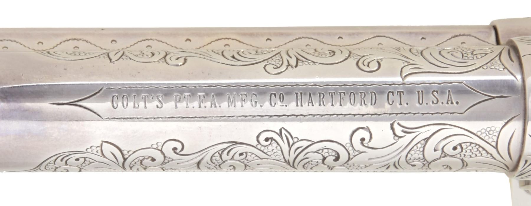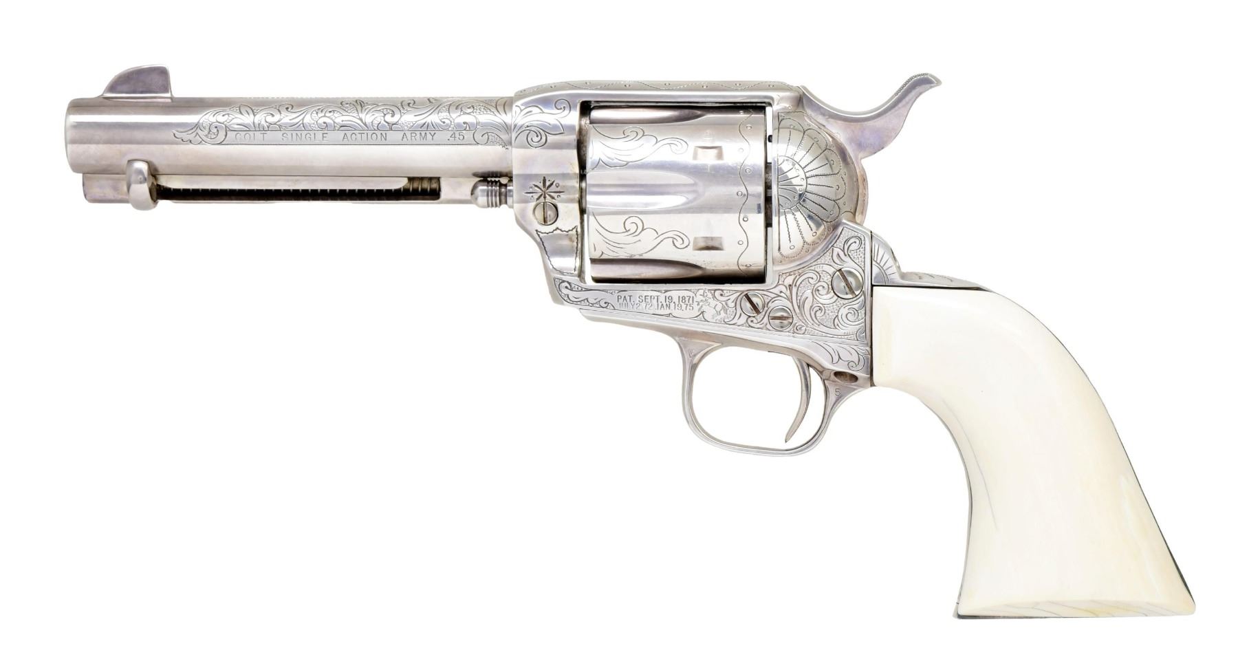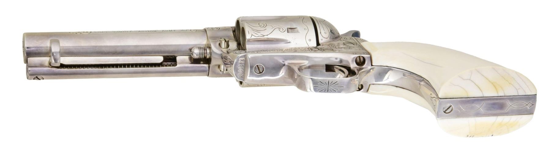 ENGRAVED & INSCRIBED CUSTOM SHOP SAA REVOLVER WITH FACTORY RELIEF CARVED EAGLE GRIPS. Cal. 45 Colt. S# SA99571. Bbl. 4 3/4" with blade front sight. Mfg. 1993. Revolver features full coverage silver plated finish with factory "C" style engraving. Inscription on backstrap reads "Jas. E McGee". 6 Shot fluted cyl. Smooth white grips have relief carved eagle on right panel. UNATTACHED ACCESSORIES: 2 piece blue custom shop box with foam inserts and original paperwork. White shipping sleeve with matching end label. CONDITION: Overall near excellent. Metal retains 99% original silver finish with faint area of minor freckling on cyl. Grips are near excellent. Bright bore with crisp rifling. (24-2126/BH). MODERN. $7,000-10,000.