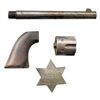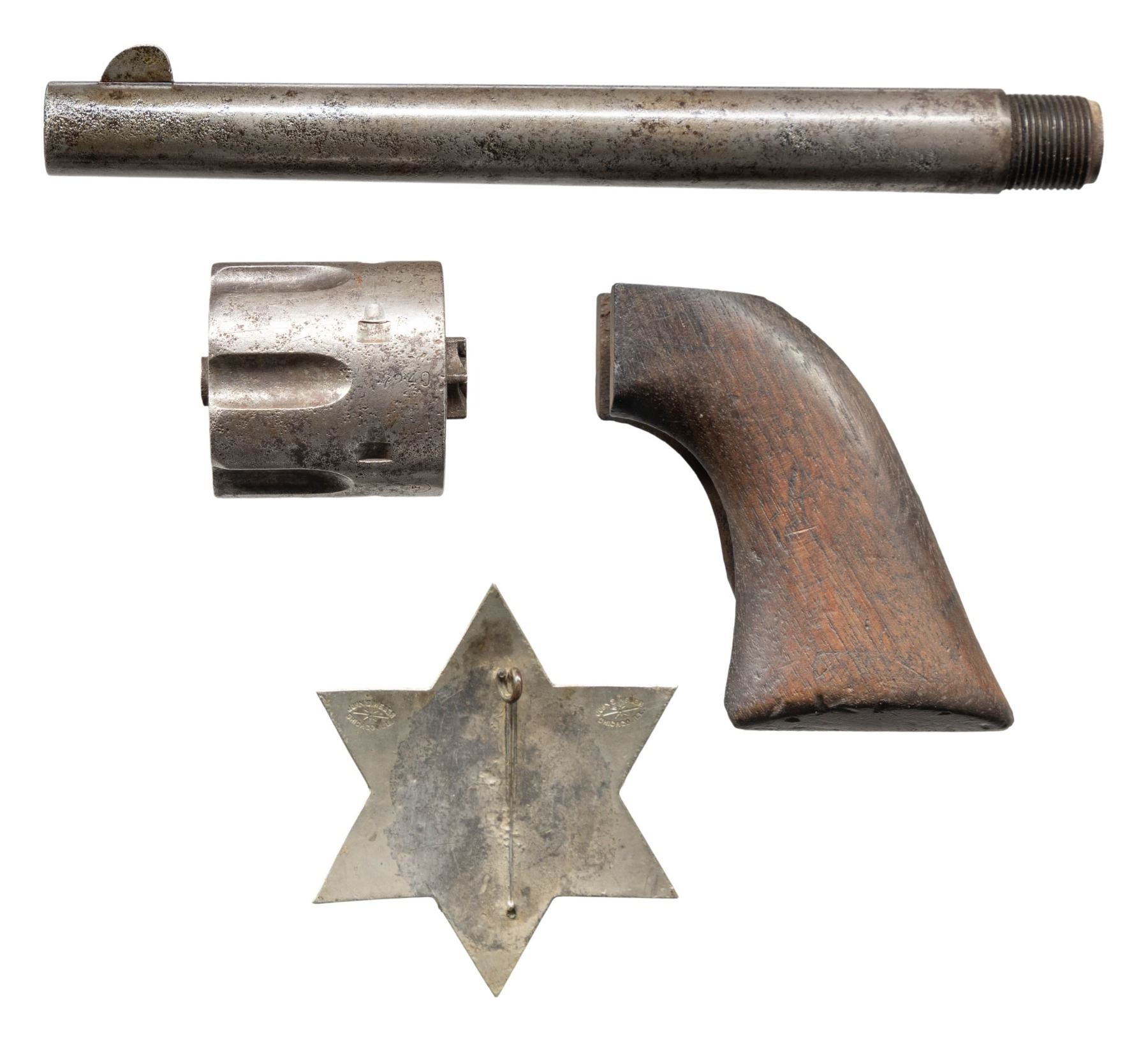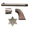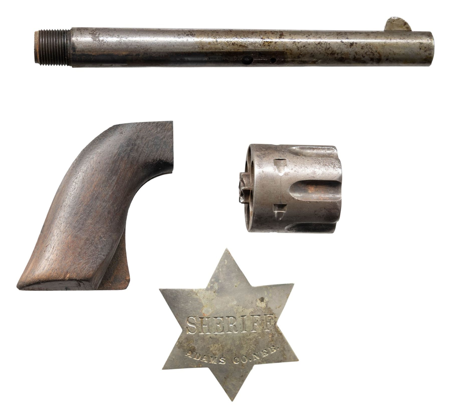 ACTION ARMY CAVALRY MODEL REVOLVER. Cal. 45 Colt. S# 17240. Bbl. 7 1/2". Top of the bbl. is marked with Colt's single line address bracketed by 2 crosses, with "J/ P" marked on the underside towards the breech. Left side of the frame is marked with Colt's 2-line patent information, followed by "US". Trigger guard and side of the cyl. are stamped "C". Metal components exhibit masterfully reapplied finishes by Turnbull, to include the case colored frame, loading gate, and hammer, blued bbl., ejector rod housing assembly, and grip straps, as well as the nitre blued cyl. base pin, frame screws, and trigger. Frame is mounted with a contemporary 1-piece smooth wood grip, stamped with an inspector's cartouche on the left side. Standard SAA pattern blade front sight and frame notched rear sight. Bullseye ejector rod head. All serialized parts are matching and include the frame, trigger guard, rear grip strap, cyl., and bbl. Cyl., bbl. grip, cyl. base pin and some small parts are replacements added at the time of refurbishment. UNATTACHED ACCESSORIES: original bbl., cyl., grip, and bag of small parts (bbl. and cyl. are matching), as well as an original silver 6-pointed star sheriff's badge marked "SHERIFF/ ADAMS CO. NEB.". Rear is stamped "JOHN S. WEBER/ CHICAGO. ILL.". Pin and retention assembly on rear of badge have broken off and are absent. CONDITION: near excellent, with metal components retaining virtually all of their Turnbull reapplied finishes, showing a few scattered superficial handling marks and scratches. Cyl. shows no dragline. Brilliant mirror bore, retaining well defined rifling throughout. Grip is excellent overall. Original parts exhibit a gray pitted appearance. Original grip exhibits a large chip on the right side at the bottom right corner. An especially attractive example of a Turnbull restored U.S. Colt Single Action Army Cavalry Model revolver. PROVENANCE: The Esteemed Norm Greenberg Collection. (01-27625/MLW). ANTIQUE. $3,000-5,000.