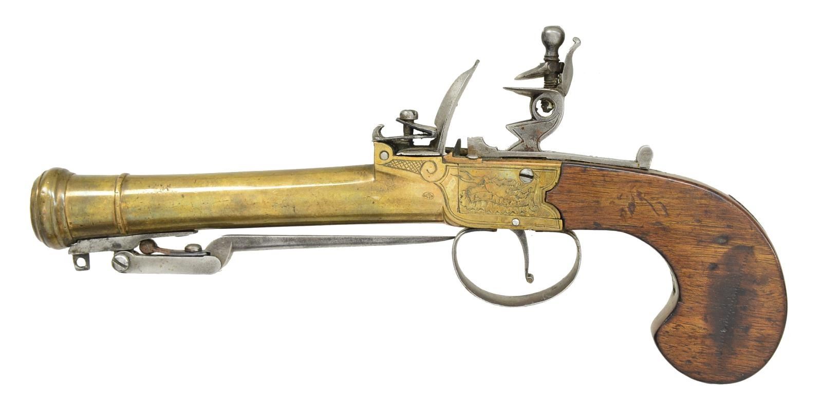 LOADED BAYONET BY MOREAU. Cal. 780" at muzzle. NSN. Bbl. 4 1/2", slightly flared bronze is cast integral w/ boxlock action & frame. A Liege proof is on left side & action area engraved "MOREAU" on right & "A-Liege" on left sides. Bbl. fitted w/ 3 1/2" triangular spring loaded bayonet that when in folded position is retained by front part of sliding trigger guard bow. Iron flint cock is reinforced & frizzen has external spring. A safety at top of grip locks cock at half cock as well as frizzen when in closed position. Bag shaped grip of walnut has vacant silver oval on top. CONDITION: very good. Brass cleaned, now toned to dark gold w/ some scattered light marks. Iron parts cleaned to silver gray. Stock has most of its original finish. Bayonet does not lock in forward position, safety does not operate. Otherwise, mechanically good. PROVENANCE: The Estate Collection of Gary Parietti. (01-19228/MGM). ANTIQUE. $800-1,500.