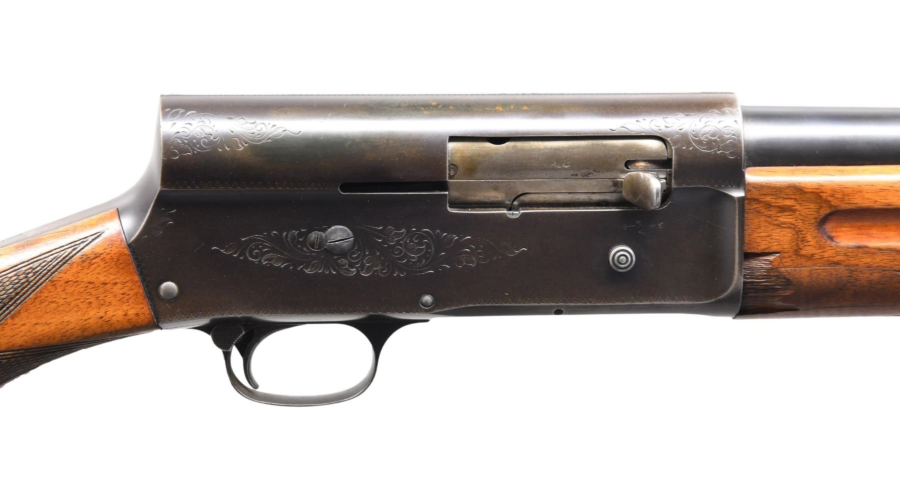 Cal. 12ga 2 3/4". S# 8G16712. Bbl. 28". Plain bbl. with Mod choke and missing bead front sight on a raised pedestal. Foliate scroll engraving with wavy border. Checkered, round-knob pistol grip walnut stock with finger groove forearm and Pachmayer White Line vent recoil pad. Gold trigger. CONDITION: bbl. has light muzzle wear, scratches, and wear spots from a gun rack/forearm removal. Receiver has a thinning finish, with some high edge and carry wear. Stock has numerous light handling marks and a tight crack at the wrist. The forearm has a large chip and three cracks. Good bore. (24-4349/ZAL). CURIO. $400-600.
