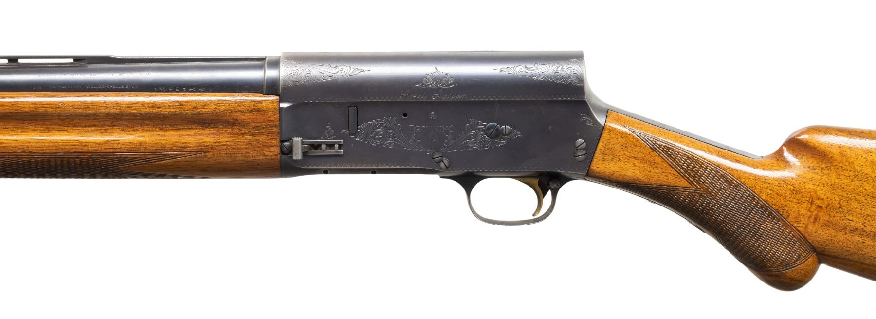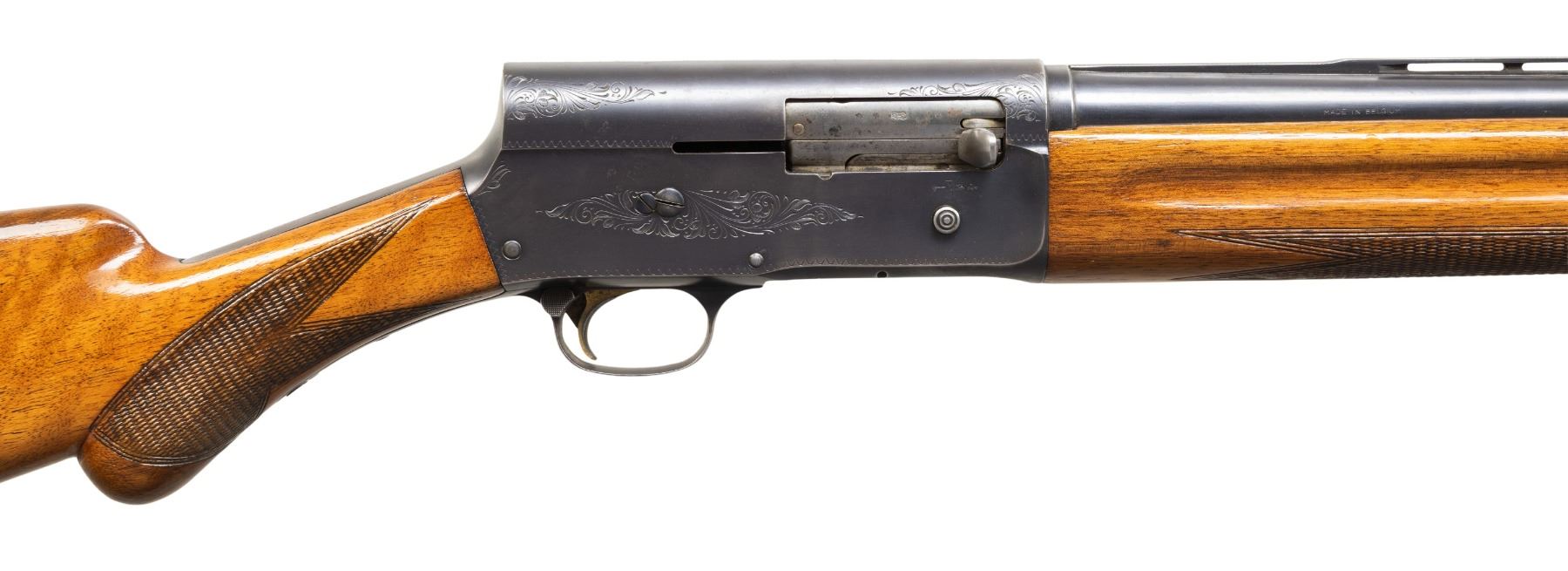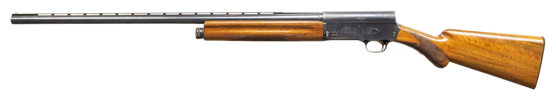 SHOTGUN. Cal. 16 GA, 2 3/4". S# 8S15373. Bbl. 27 9/16". A5 "Sweet Sixteen" semi-automatic shotgun mfg. in Belgium by Fabrique Nationale and imported/retailed by Browning Arms Company in 1958. Left side of the bbl. is marked with Browning's importer information, above Belgian commercial proofing, with "MADE IN BELGIUM" marked on the right. Sides of the receiver feature sections of foliate scroll engraving and wavy line borders, with "Sweet Sixteen" (Script) above "BROWNING" and a portrait of John Moses Browning on the left, and a triad of Belgian proofs on the right. Scrollwork extends to the receiver tangs as well as on the underside of the trigger guard bow. Metal components exhibit a blue finish overall, save for on the bolt assembly and mag. tube, which are polished in-the-white. Checkered wood finger groove forearm and rnd. knob buttstock with FN horn buttplate. Wood furniture has been sanded and revarnished at one time. Bbl. features a matte V/R with aluminum bead front sight and a fixed Modified choke (indicated via "**" preceding "SPECIAL STEEL" marking). CONDITION: metal components retain the majority of their original factory blue finish, exhibiting some areas of light to mild wear and thinning that are fading to gray patina (primarily on edges and contact points), some superficial handling marks, as well as scattered spots of light to mild surface oxidation overall. Bolt assembly exhibits scattered spots of oxidation and age related discoloration. Mirror bore, exhibiting several areas of hardened firing residue. Proper manual mechanics. Wood furniture is very good overall, as sanded and refinished. Buttplate exhibits a large crack through the top screw slot, with chipping and delamination present in the corresponding area. (25-5604/MLW). CURIO. $350-550.