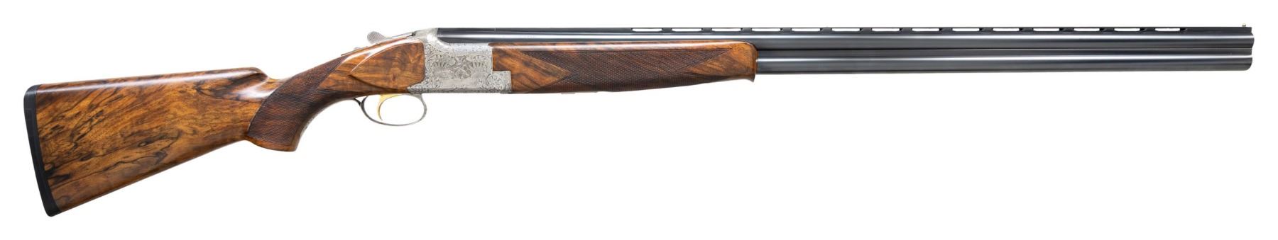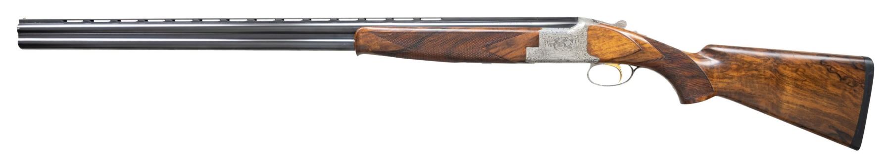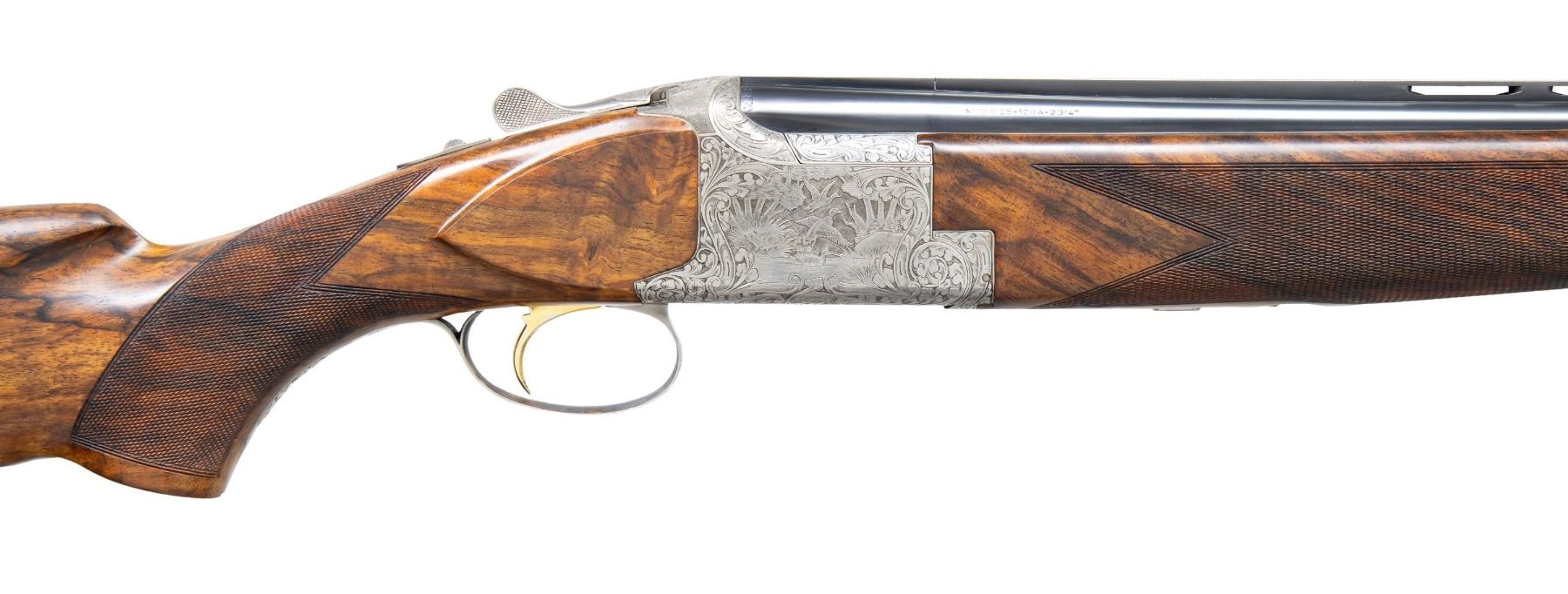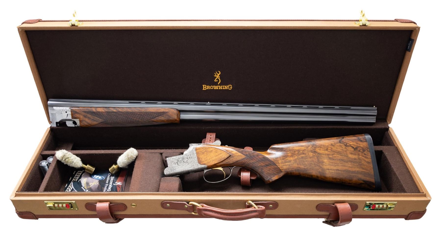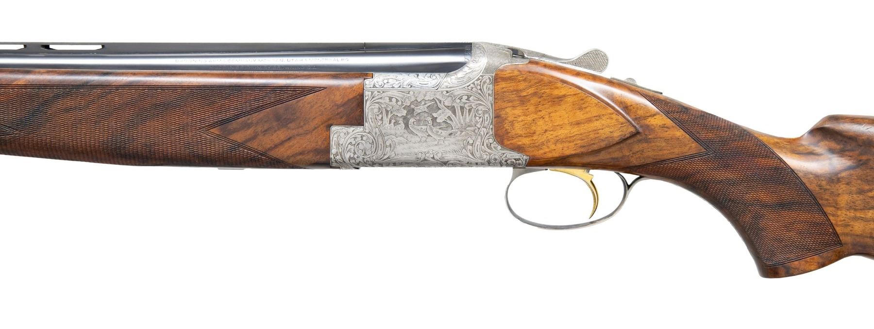 SHOTGUN. Cal. 12 GA, 2 3/4". S# 325MX04048. Bbl. 32" with Broadway rib having steel front and white mid beads. Fixed Imp. Mod. and Full chokes. Boxlock action has Diana grade engraving signed by Browning master engraver C. Baerten. Right side game scene features flying and sitting mallards. Left side features flying and sitting pheasants. Scenes are surrounded by vine type foliate scroll with finely shaded backgrounds which extend to the forearm iron and bbl. lugs. Additional game scenes include 2 partridge on the floorplate and 2 rabbits on the trigger guard bow. Upper areas of the gray finished action have stippled finish. Gold finished checkered SST. Schnabel tipped forearm and pistol grip stock of fancy European walnut having a marbled grain with vivid dark streaking. Point pattern hand checkering. LOP: altered to 13 3/4" over a thin solid black sporting clays pad. DAC: 1 5/8". DAH: 2 3/16". Stock has a neutral cast. Weight: 7lbs. 1.6oz. UNATTACHED ACCESSORIES: Browning marked canvas covered luggage case with leather trim. Brown felt fitted interior. Case contains brass headed bore mops, snap caps, and Browning outdoor products catalog. CONDITION: bbls. retain over 98% blue showing slight forearm slide wear. Action has very good satin gray finish. Original wood finish shows scattered scratches and handling marks. Sound action. Very good bright bores. (25-4328/DS). MODERN. $4,000-6,000.