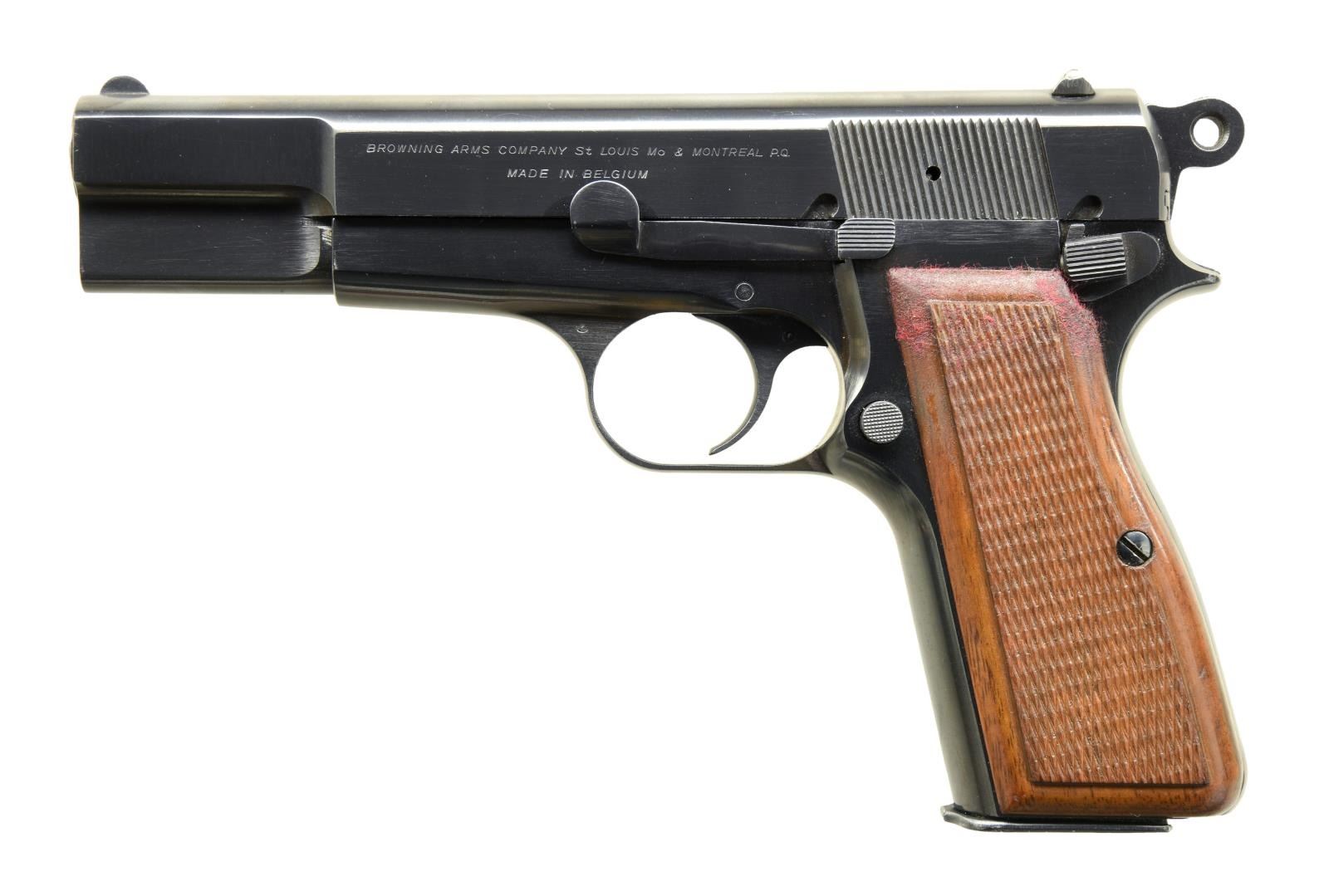 Cal. 9mm Luger. S# 69C20847. Bbl. 4 3/4". Hi-Power semi-auto pistol mfg. in Belgium and imported/retailed by Browning Arms Company of St. Louis, MO in 1969. The left side of the slide is marked w/ Browning's importer/retailer information above "MADE IN BELGIUM". Right side of frame, bbl. and interior of slide exhibit Belgian proofs. Metal components exhibit a blued finish w/ the frame being mounted having 2 piece checkered wood grips that retain their original anti-moisture red paint on the interior of the panels. MAGS: 2 - 13 Rd. ACCESSORIES: Browning leather soft case. CONDITION: very good w/ metal components retaining the vast majority of their original factory blue finish plus some light superficial marks from handling and storage, as well as some light freckling on the grip straps. Bright bore exhibiting light pitting and strong rifling throughout. Grips show a few handling marks and are very good overall. PROVENANCE: from The Estate of Harry Henry. (23-5107/MLW). CURIO. $800-1,200.